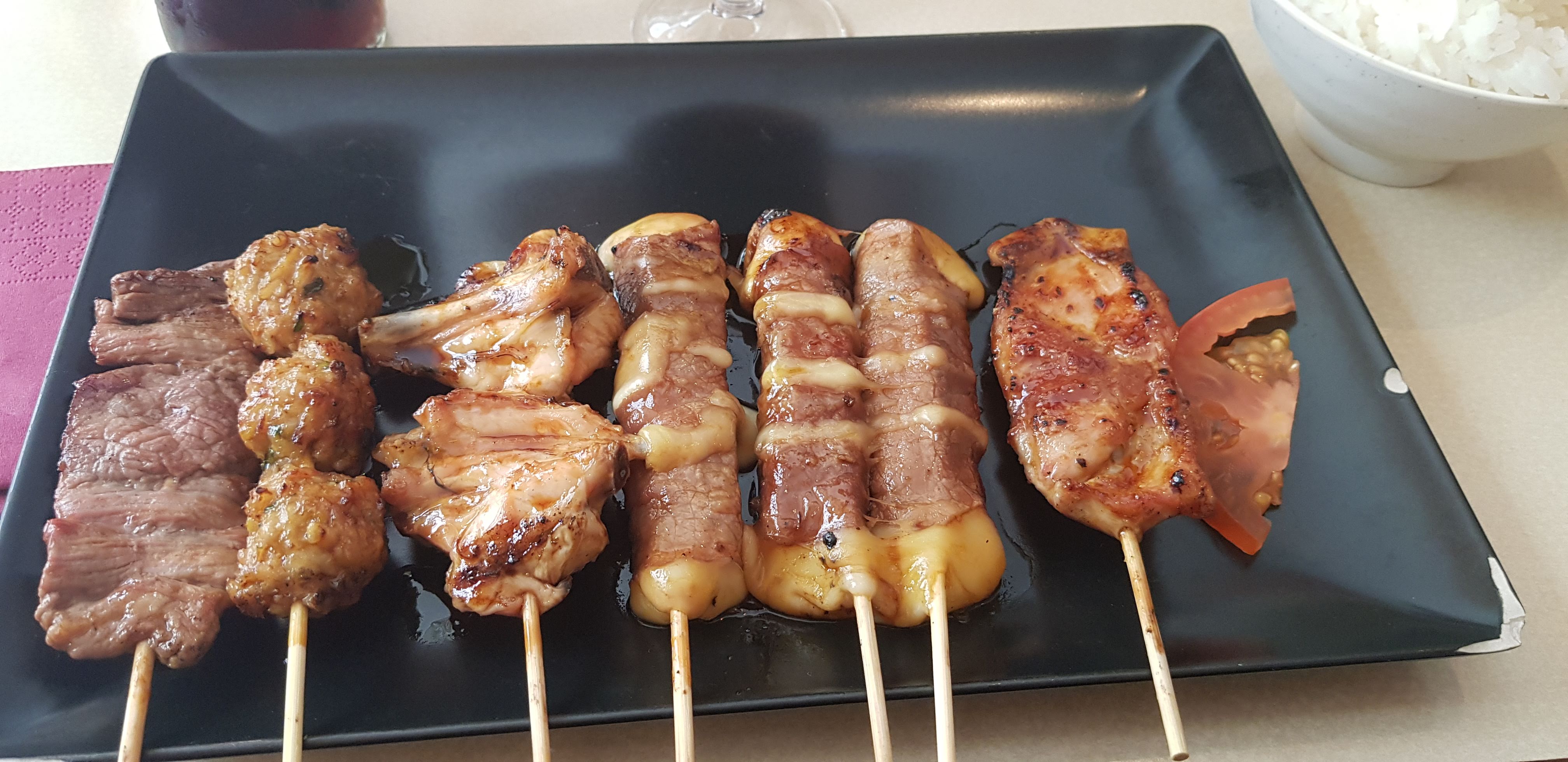 Un accueil agréable et un bon service, les sourires sont en plus au rendez-vous. Le lieu est sympathique, bien entretenu et propre - au coeur d'un quartier touristique/de passage. Les menus proposés sont abordables (24euros au total pour nos 2 menus). Nous avons opté pour deux menus à base de brochettes (A - 4 brochettes et F- 7 brochettes), chaque menu est accompagné d'un bol de riz, une miso et du choux en salade. Tout était frais et cuit à la perfection, de SUCCULENTES brochettes. La miso mériterait d'être moins salée ... Un très bon rapport-qualité-prix-service. Nous y retournerons!