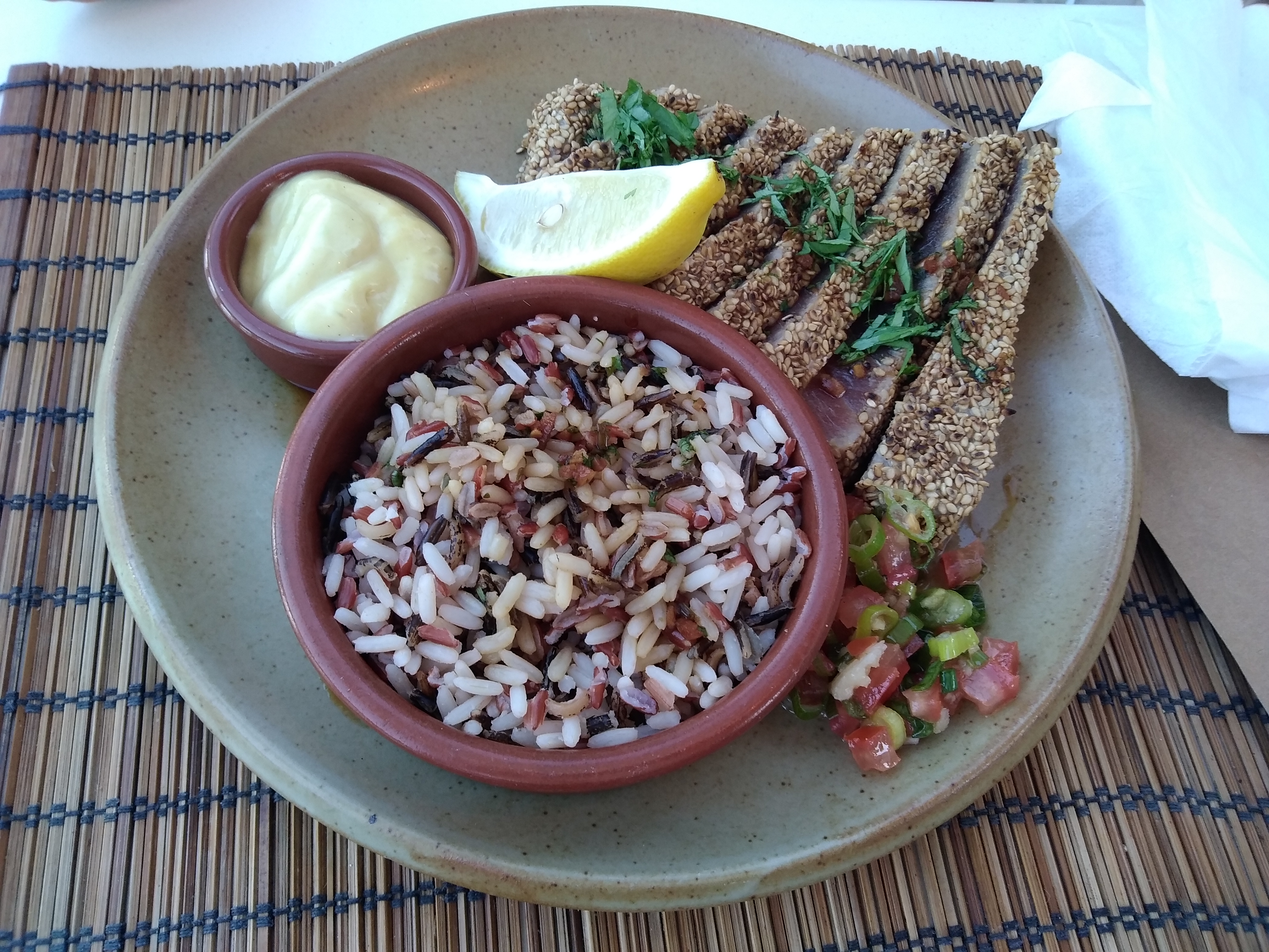 Très bon Poke bowl au saumon. Le filet de bœuf était très bien cuit pour un dîner en tête sur une table haute. Serveurs très sympathiques. La terrasse est grande avec une belle vue sur la mer et agréable avec ce grand arbre en plein milieu dont les branches font un joli ombrage. A recommander