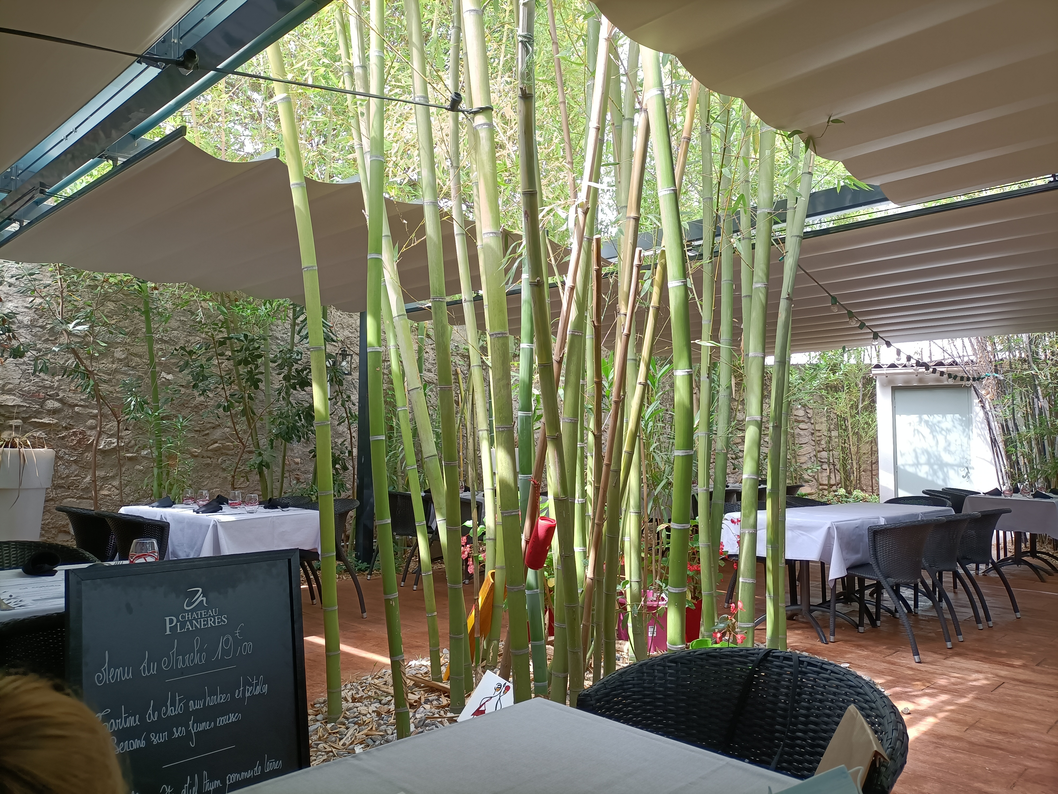 Beau cadre dans le patio à l'ombre des bambous et des parasols multicolores. Excellent rapport qualité -prix. (Assiettes délicieuses et artistiquement présentées). Accueil et service attentionnés et irréprochables.