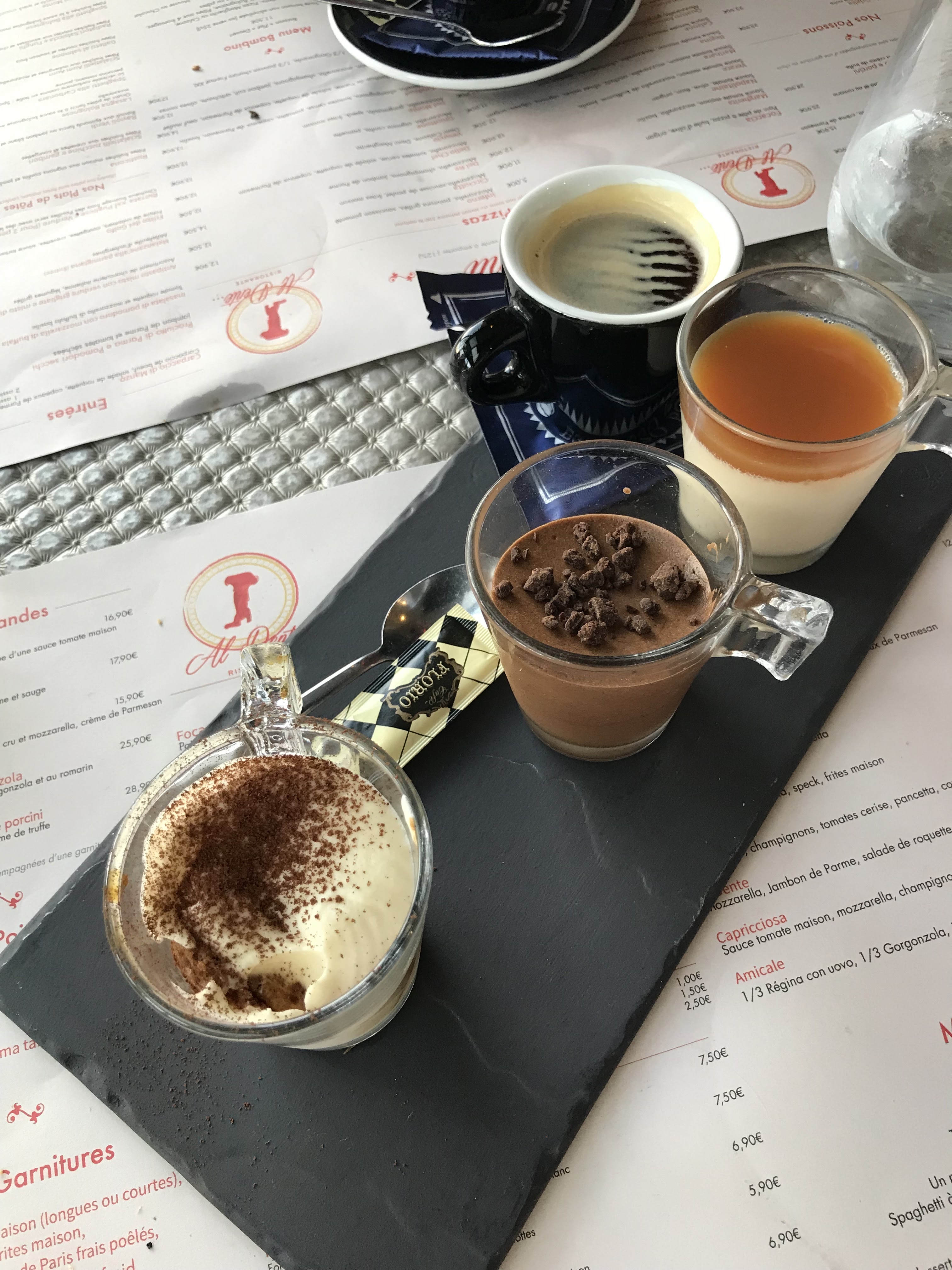 Un accueil du patron et du personnel super tous agréable et gentil,un restaurant impeccable les pizza très bonne peut être un peu plus cuite et les tiramisu et café gourmand délicieux et le l emplacement très sympathique.