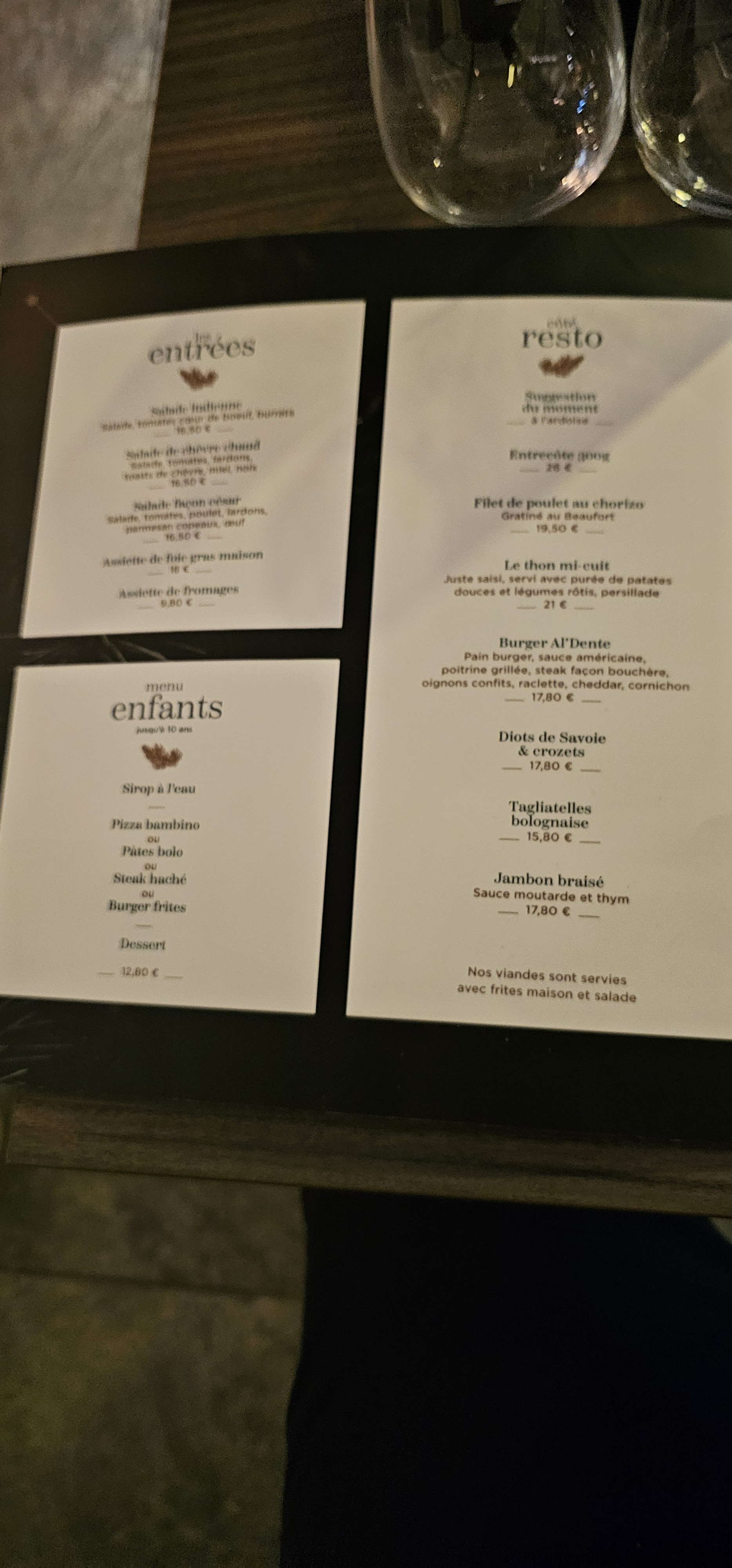 Accueil chaleureux, endroit sympathique, mais manque beaucoup de plat et dessert proposé sur la carte, les quantités un peu juste pour des restaurants sois disant de spécialiste savoyarde, en réalité plus un restaurant italien que autre chose. Manque également les vins locaux a la carte. Un chien présent dans la salle totalement inadmissible !!!!!!!!!! Déçu