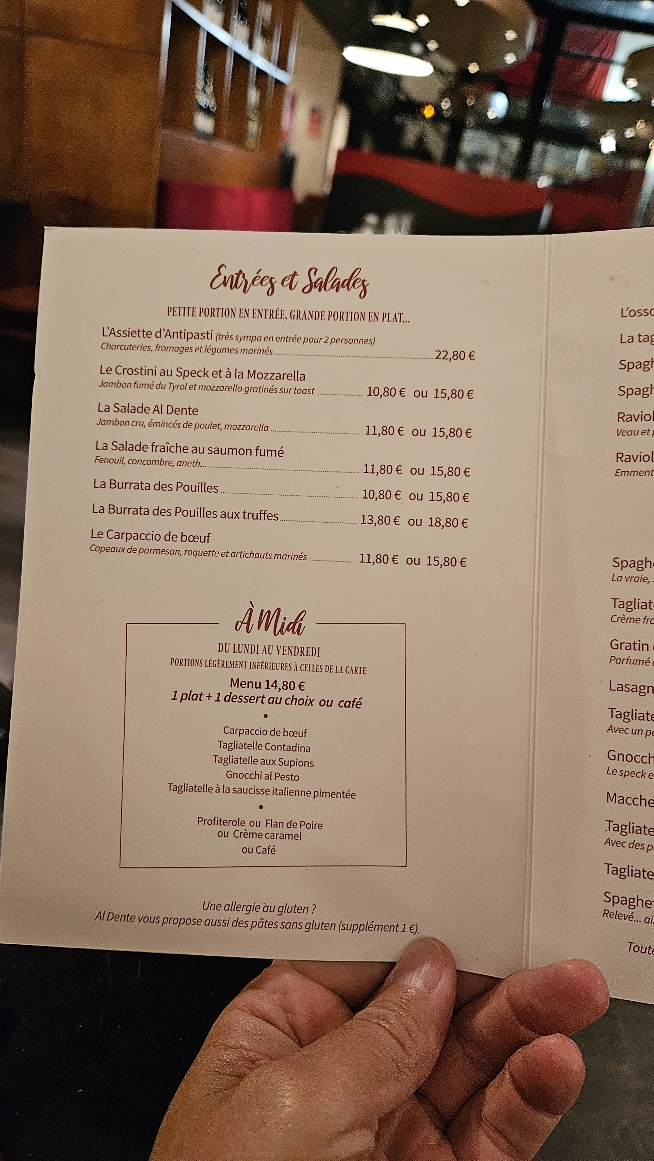 j'allais chez Al denté il y a déjà 20 ans et les plats sont toujours aussi bons. j'enlève une étoile juste pour l'accueil un peu brute sans être pour autant désagréable. juste un manque de sourire de la serveuse.