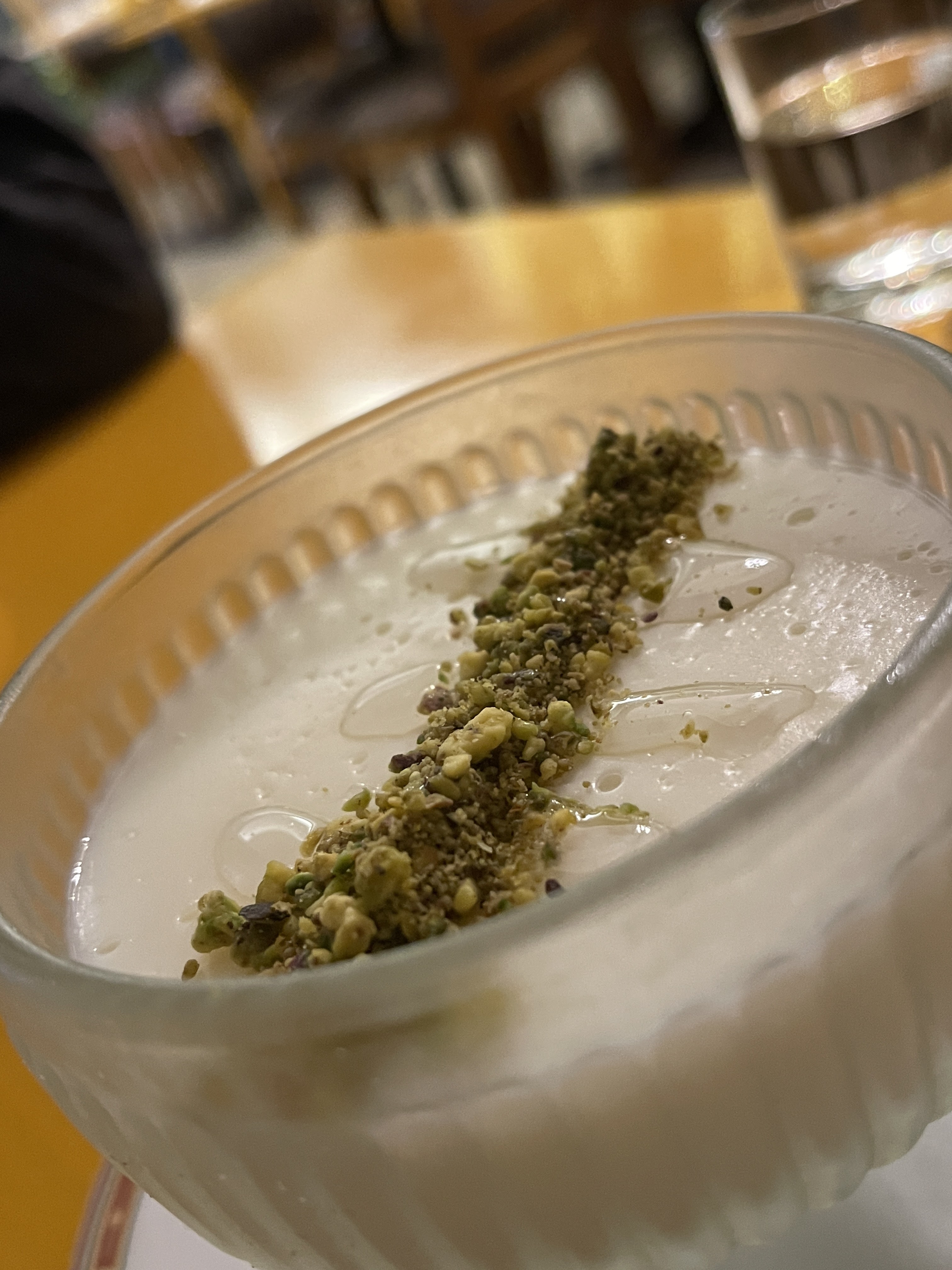 Repas délicieux. Plats avec du goût. Bien équilibrés. Le flan à la fleur d'oranger et pistaches, une merveille