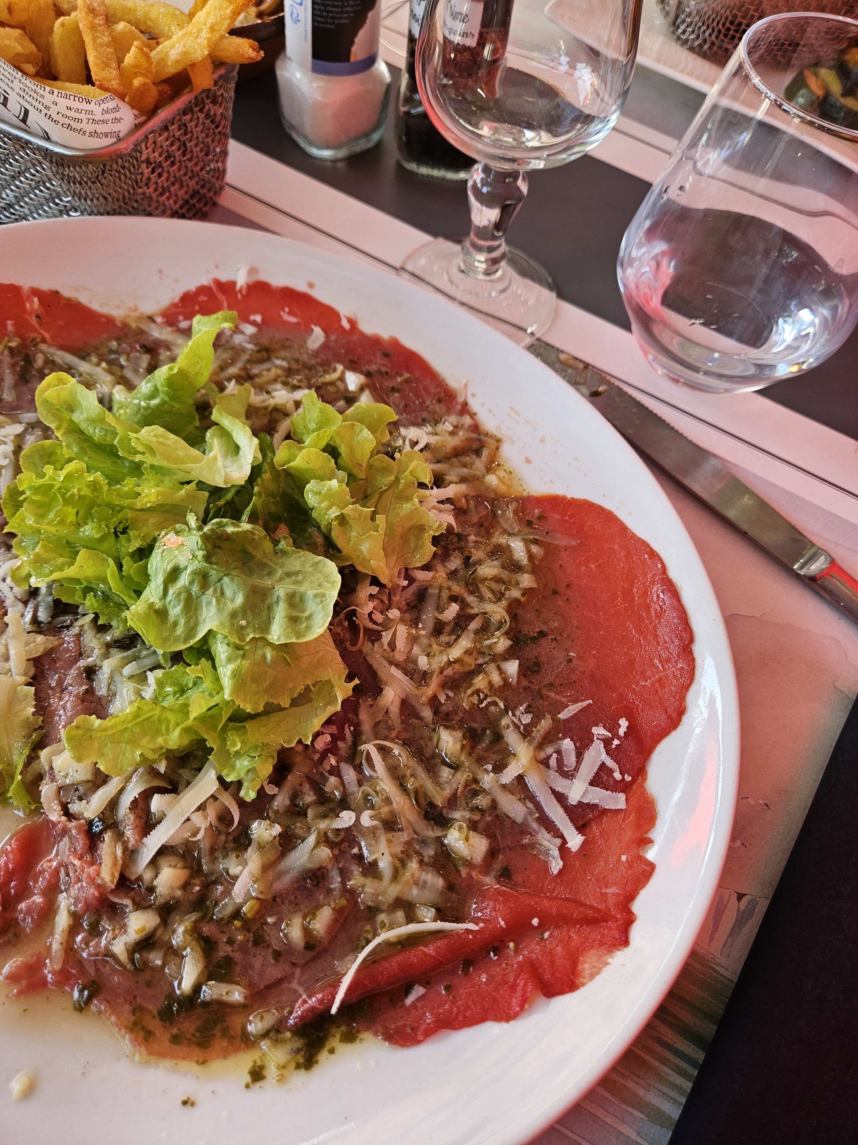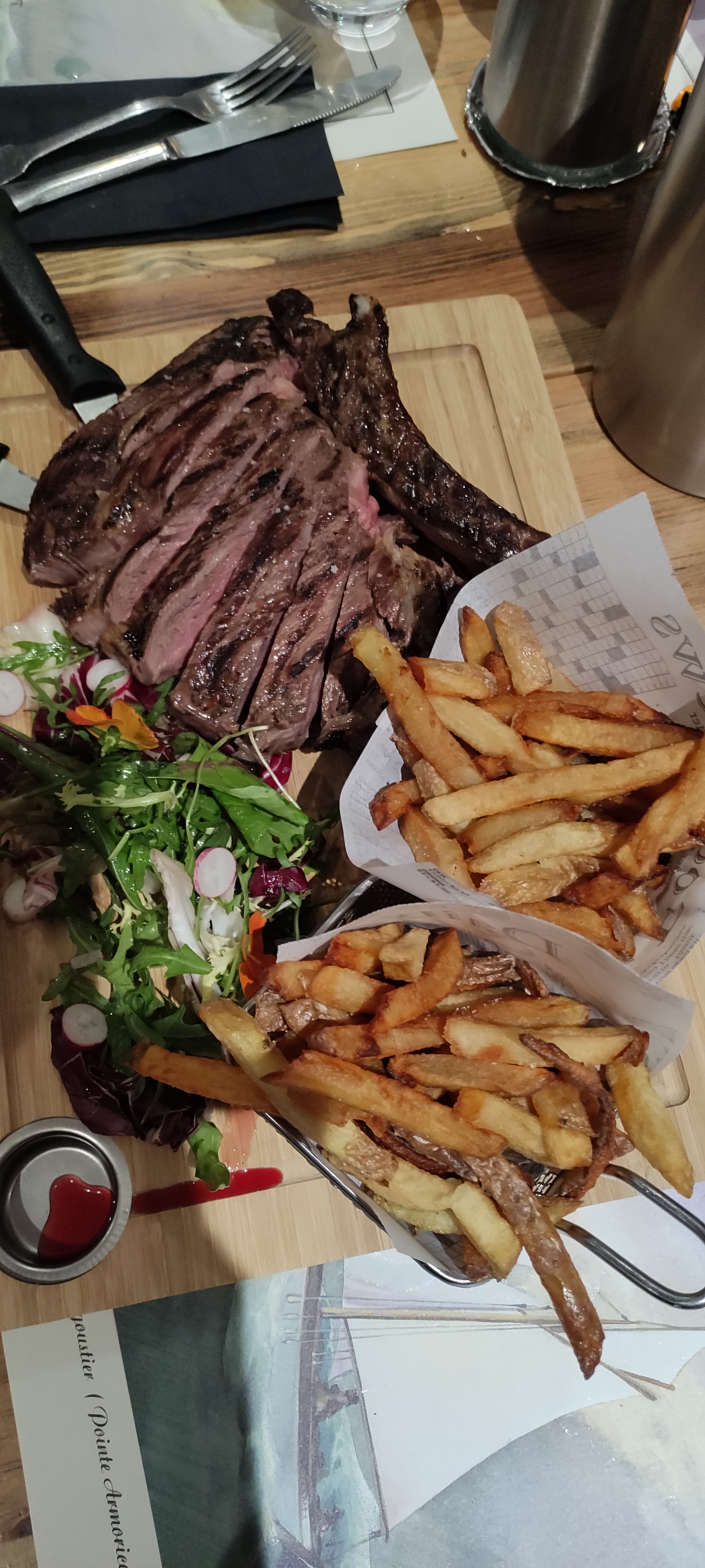 Très déçue au vue de la note moyenne Accueil sympa mais rien d'exceptionnel pour le plat Un bout de faux filet pas frais, très nerveux, et trop cuit avec des frites jetées dans l'assiette avec une poignée de haricot.