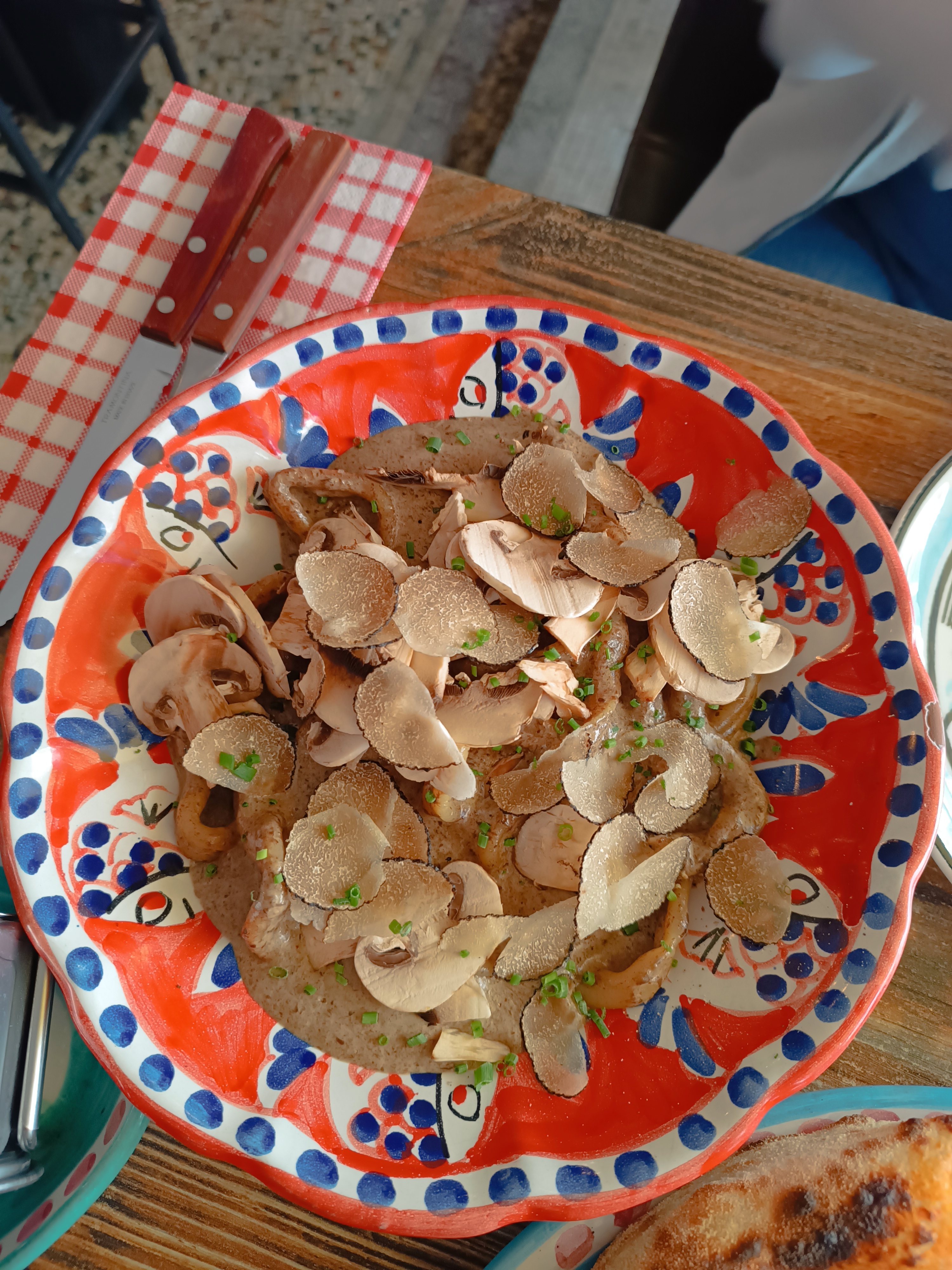 Tous de mauvaise fois ! À part l’assiette de charcuterie à partager très bonne et copieuse le reste fut plus que décevant. Nous avons commandé les fameuses pâtes à la truffe avec copeaux de truffe on nous sert des pâtes avec des copeaux de champignons…! On nous avait annoncé des tagliatelles cela n’en était pas … nous nous sommes plaintes et de la serveuse au caissier tout le monde était de mauvaise fois il nous a été maintenu que cela était écrit sur la carte après lui avoir prouvé le contraire … aucunes excuses il a persévéré en disant « la truffe est un champignon « dommage qu’il ne fasse pas de différence . En deux mots : à fuir ! Attrape touriste ils vous prennent pour des truffes !