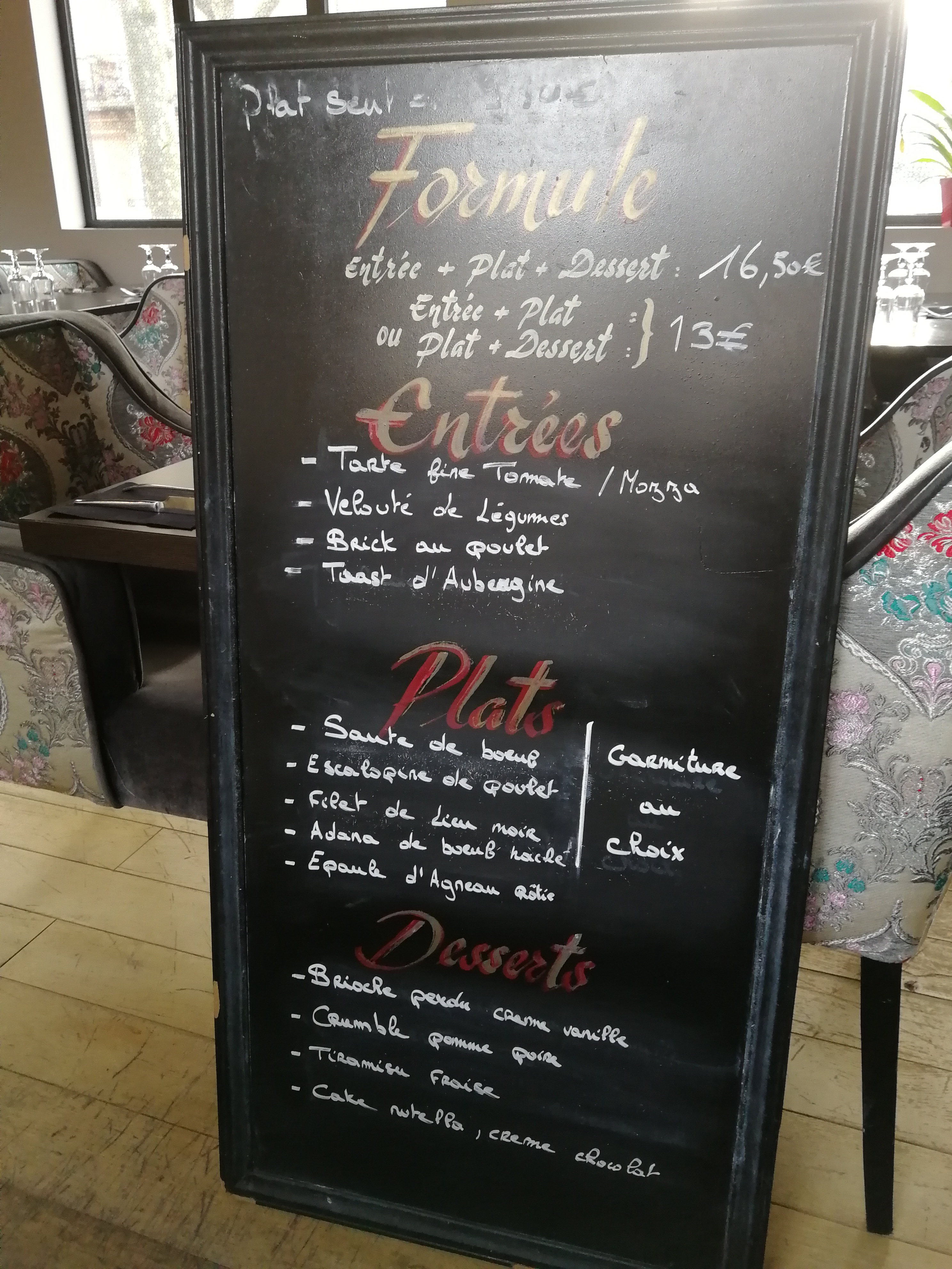 Menu midi présenté sur une ardoise (produits frais) à un tarif très abordable et pour une qualité de produits superbe ! L'accueil et le service sont toujours excellents et les petites attentions du personnel sont très agréables ! C'est toujours un grand plaisir d'y venir manger que ce soit pour le déjeuner ou le dîner ! Je recommande vivement !!!