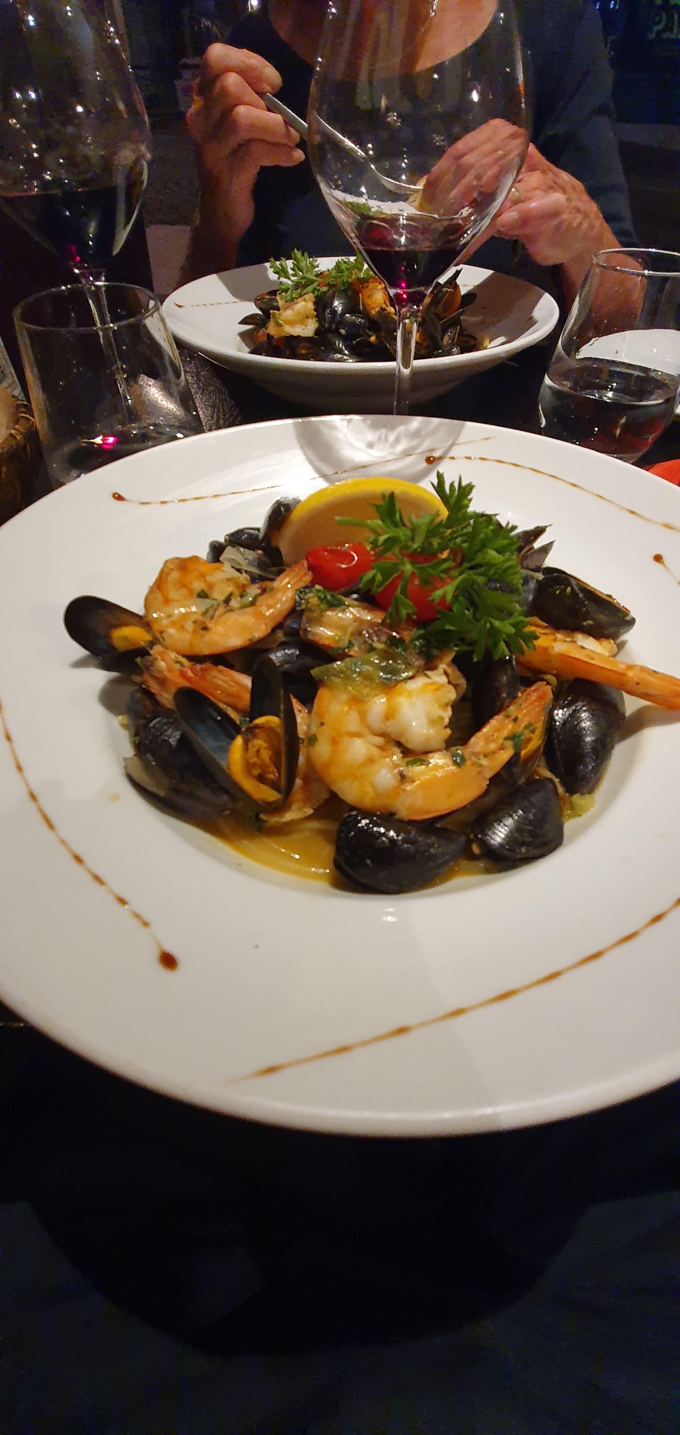 J ai mangé des linguini du Mare Petites pâtes avec crevettes et moules ,tomates ail et calmars ,un délice et copieux .plusieurs cordes à son arc.menu varie