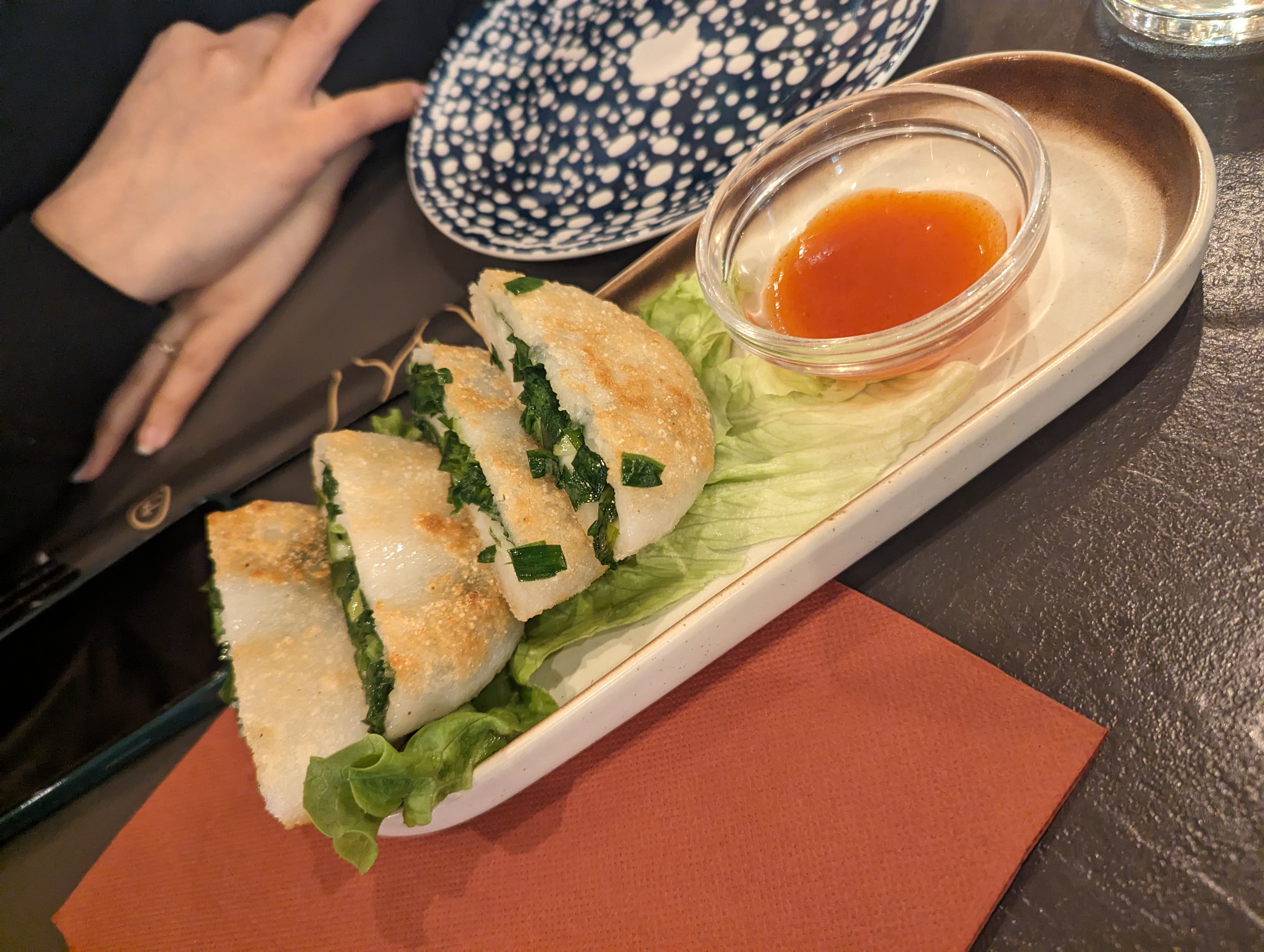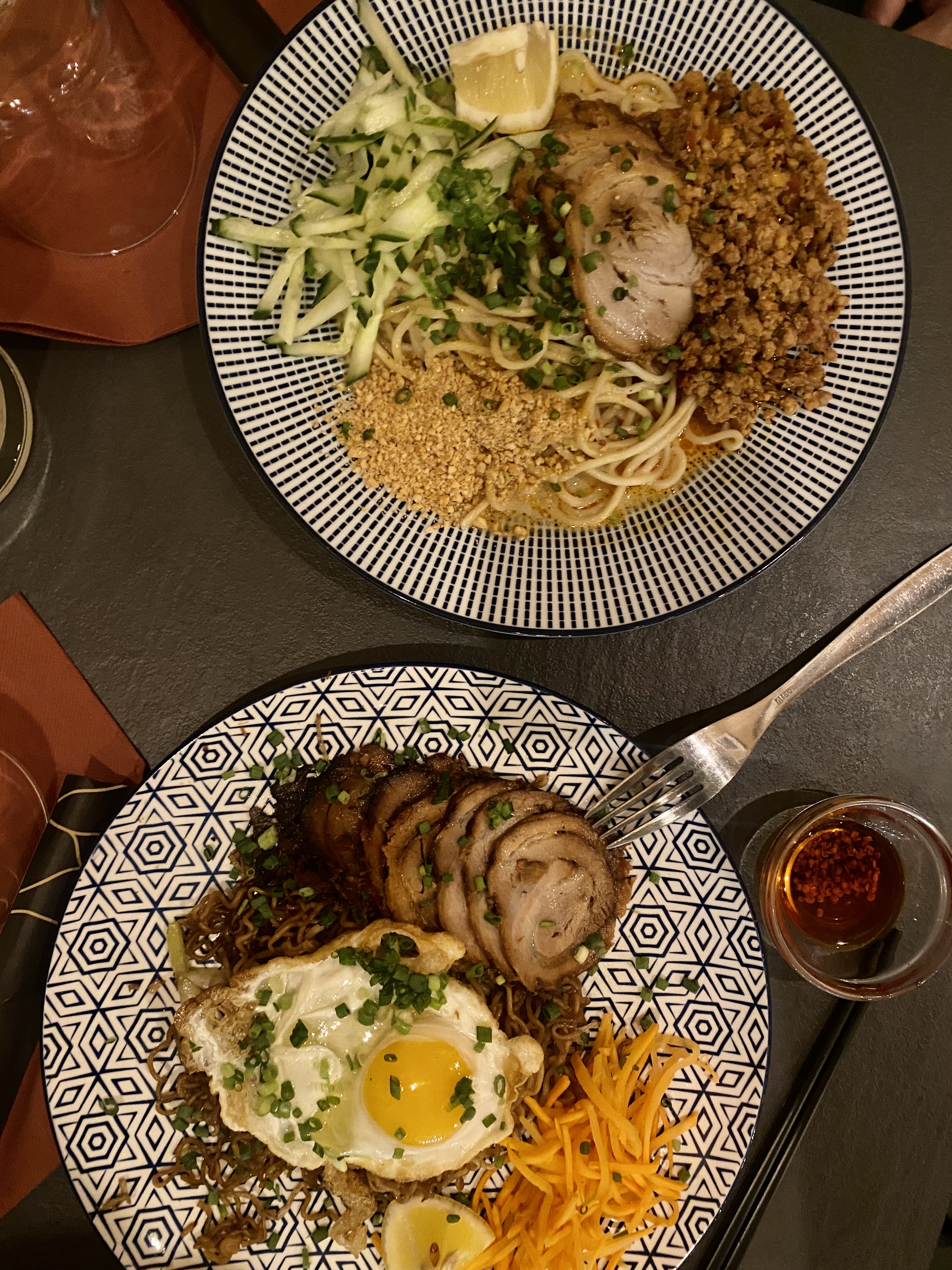 Expérience plutôt sympathique, service agréable et repas plutôt bon, rien d’extraordinaire cependant, point positif pour les options végétariennes ! Nous avons pris les wontons végétariens en entrée et la soupe de nouilles au tofu aubergines ainsi que les nouilles sèches au poulet frit en plat principal.