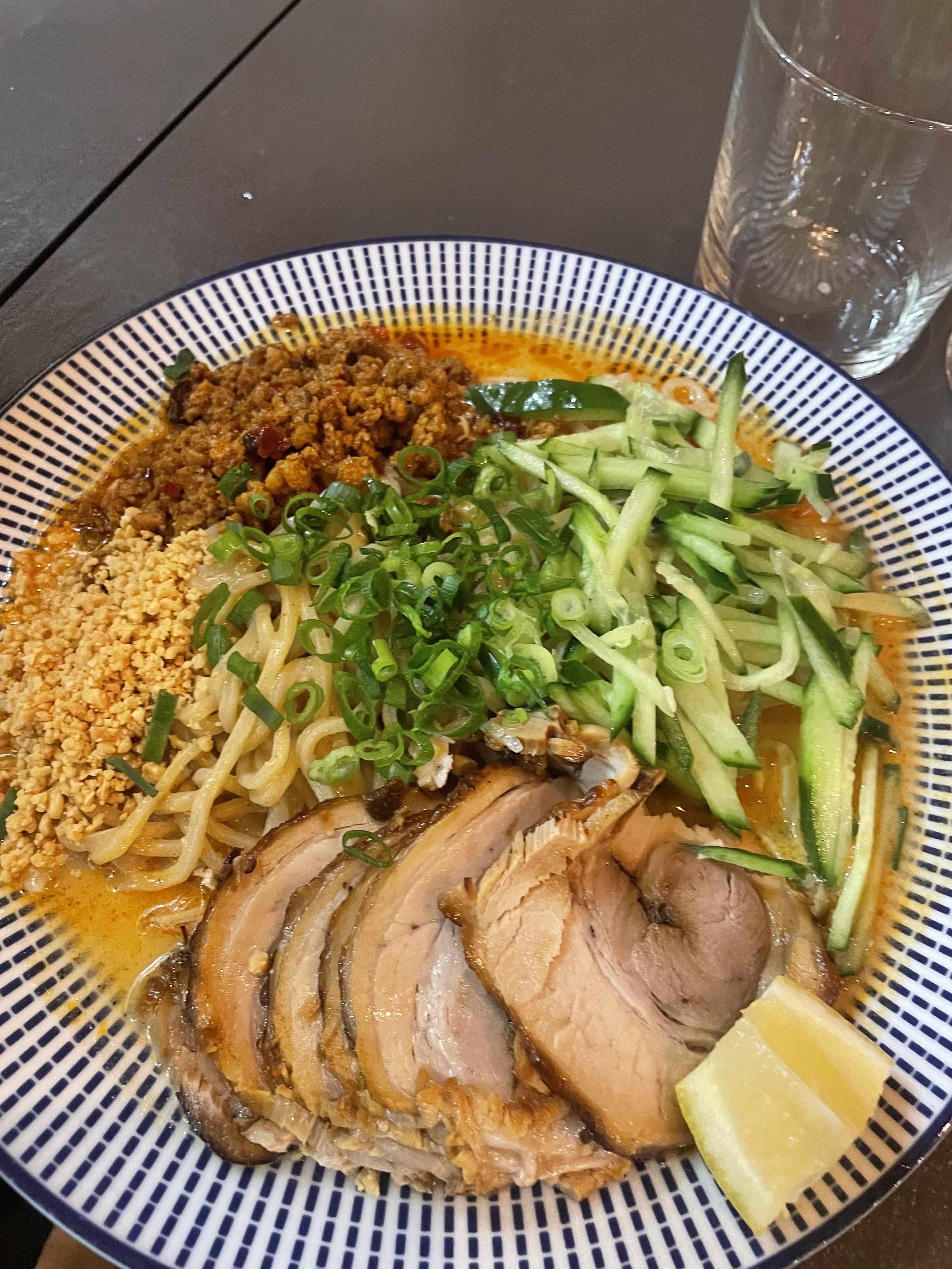 Nous avons commandé une soupe de nouilles au bœuf braisées, des nouilles mélangées avec des tranches de sésame et de porc chashu et des wontons avec une sauce au sésame et aux arachides. La portion est généreuse, le prix abordable et la sauce aux cacahuètes excellente! Le service aurait pu être plus sympathique.