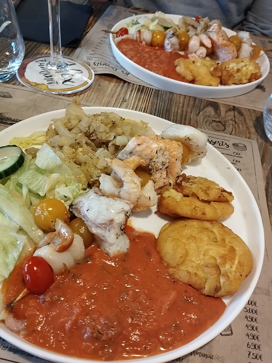 Agréable moment partagé à 2. Nous nous sommes régalés avec la planche en apéro + plats très généreux (un peu trop de monde point de vue) mais mon reste de repas j'ai pu le reprendre. Manque un peu de confort sur les chaises et pas facile pour se stationner.