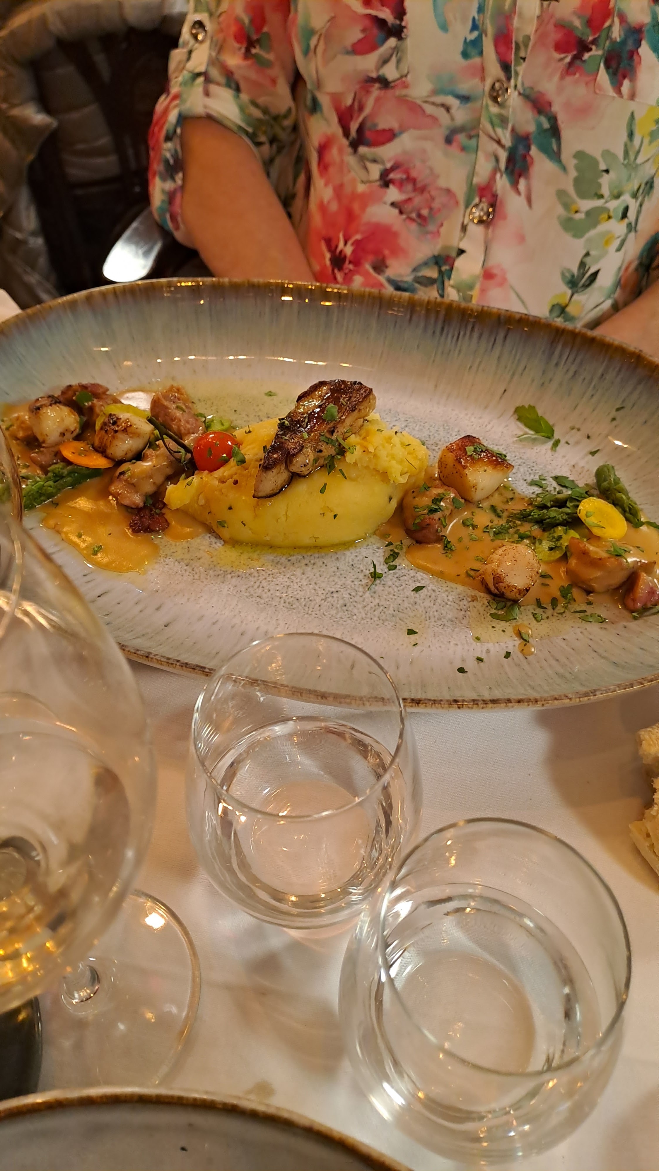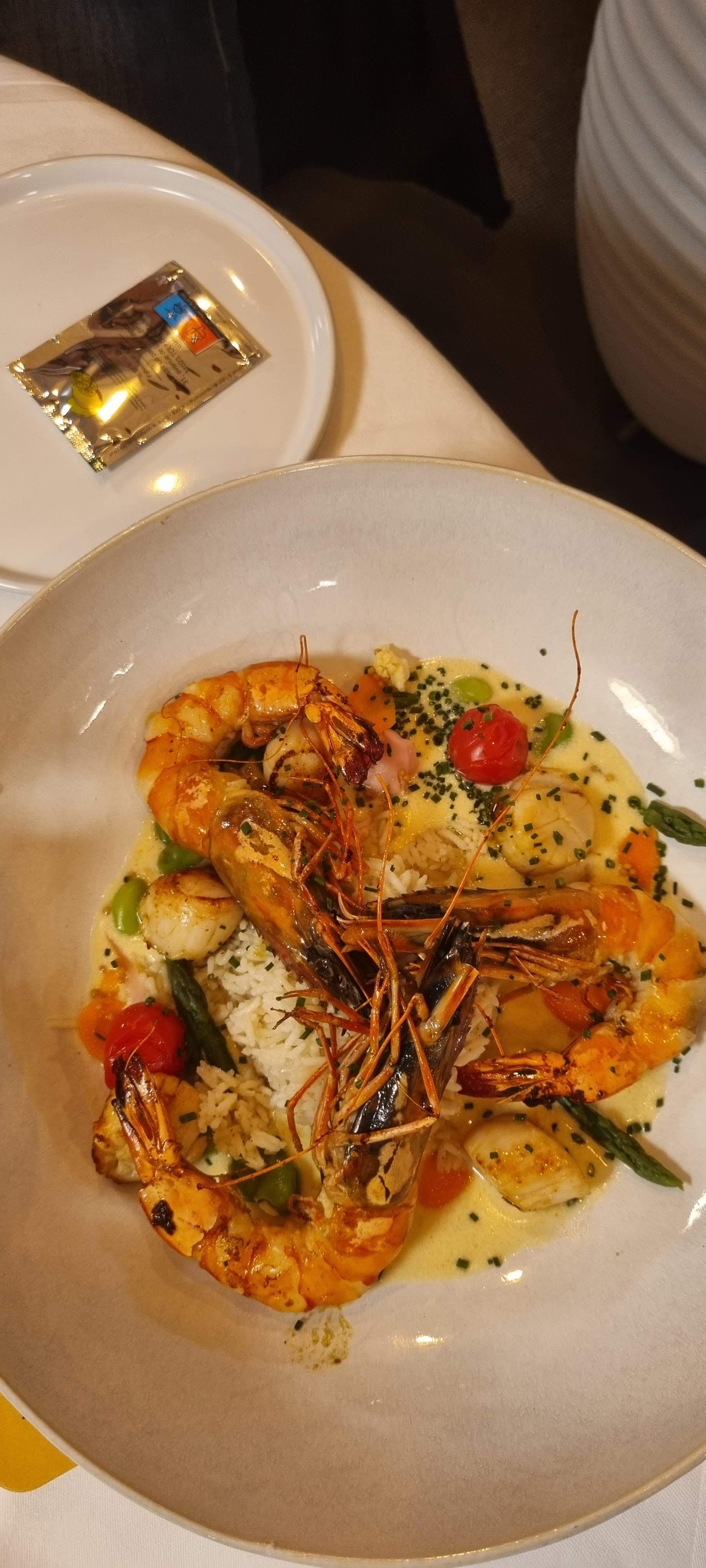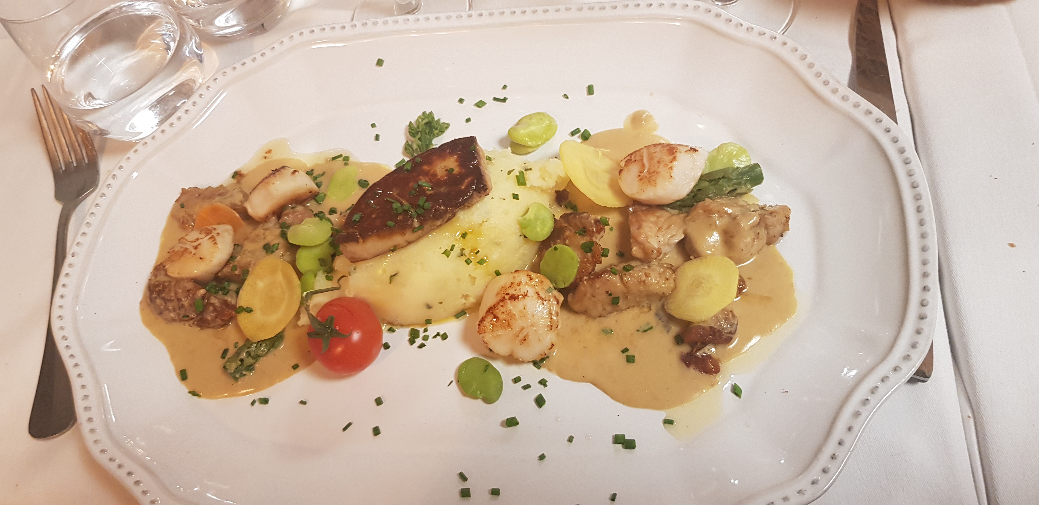 Je vous le conseille !! , riz de veaux sauce foie gras avec des saint Jacques une tuerie, et gambas St Jacques au citron succulent. Personnel aux petits soins avec toujours un petit mot gentil tout au long du repas.