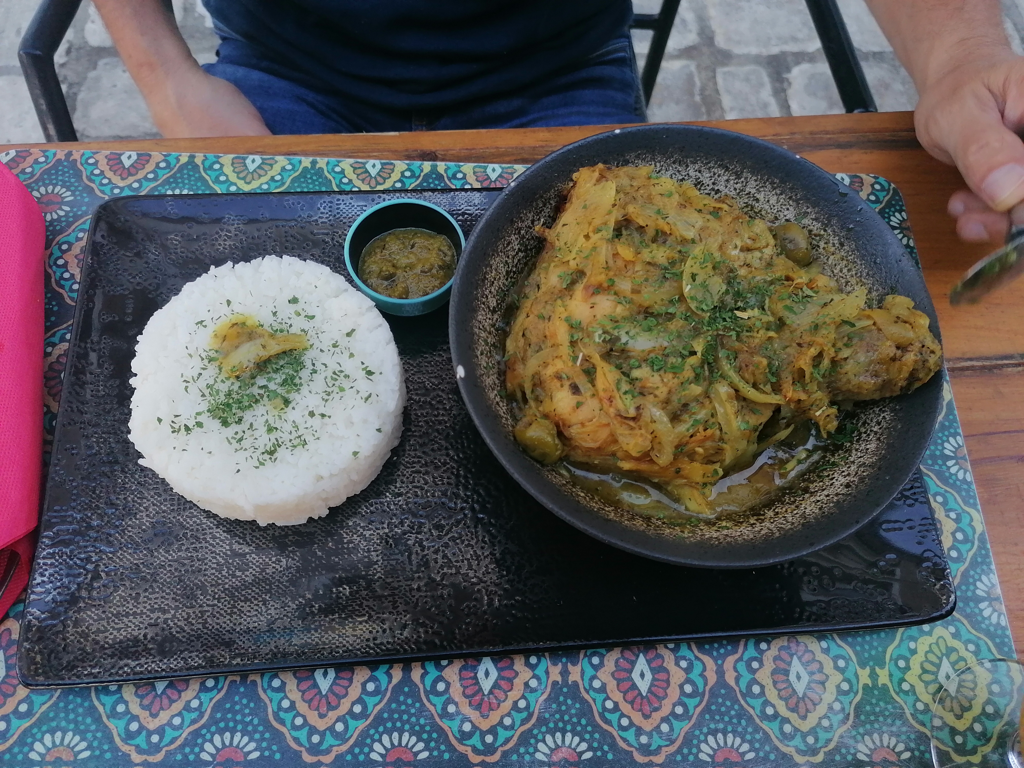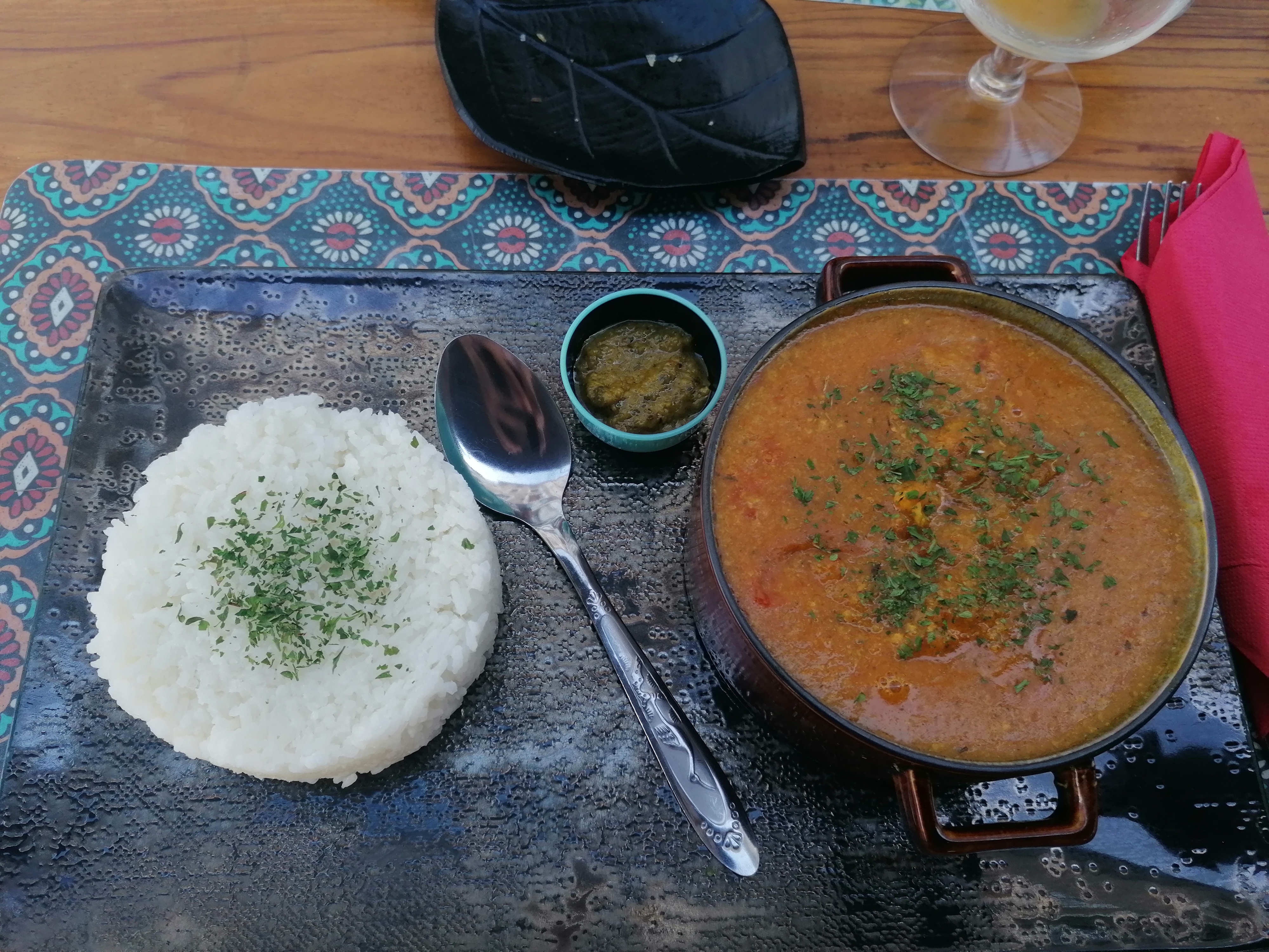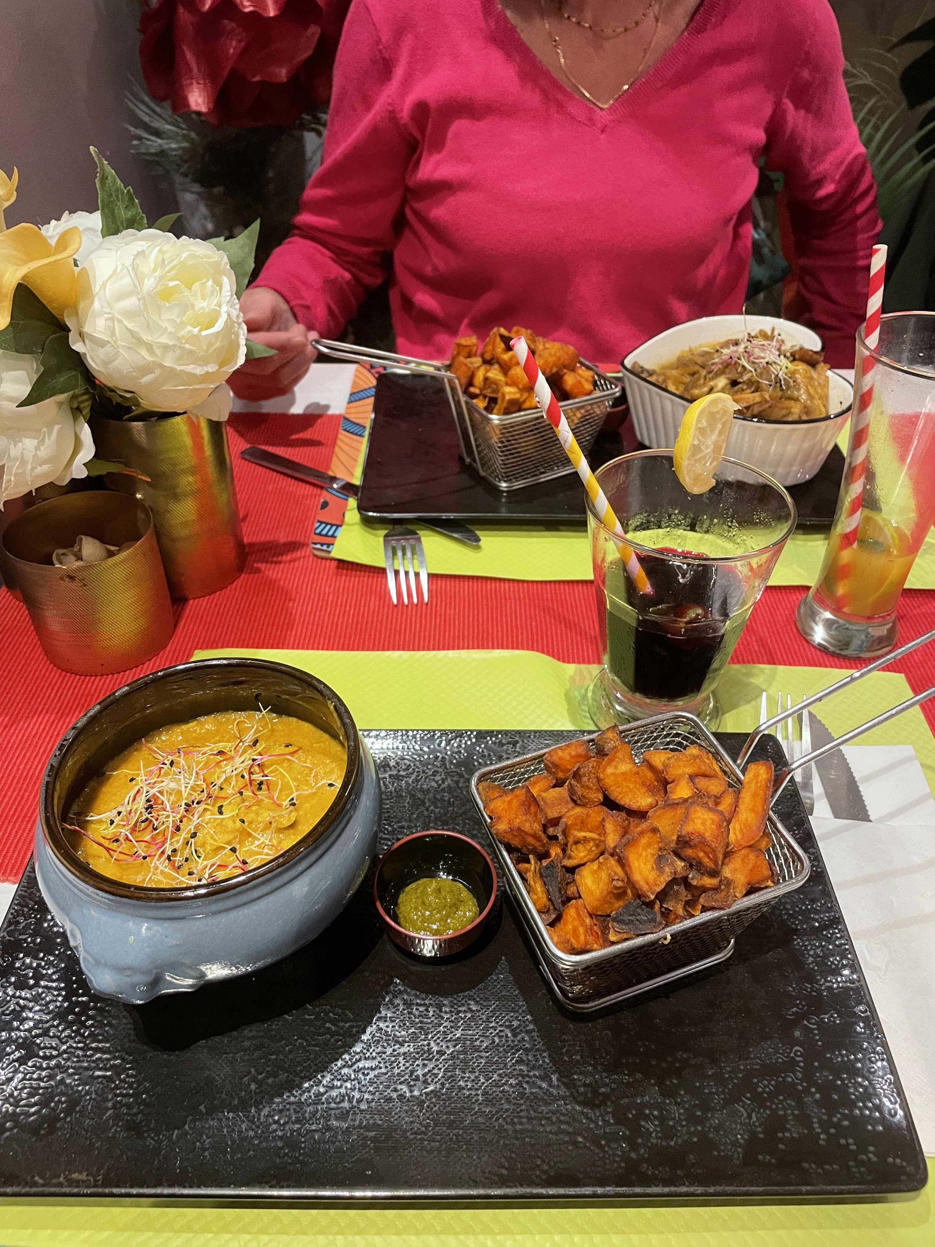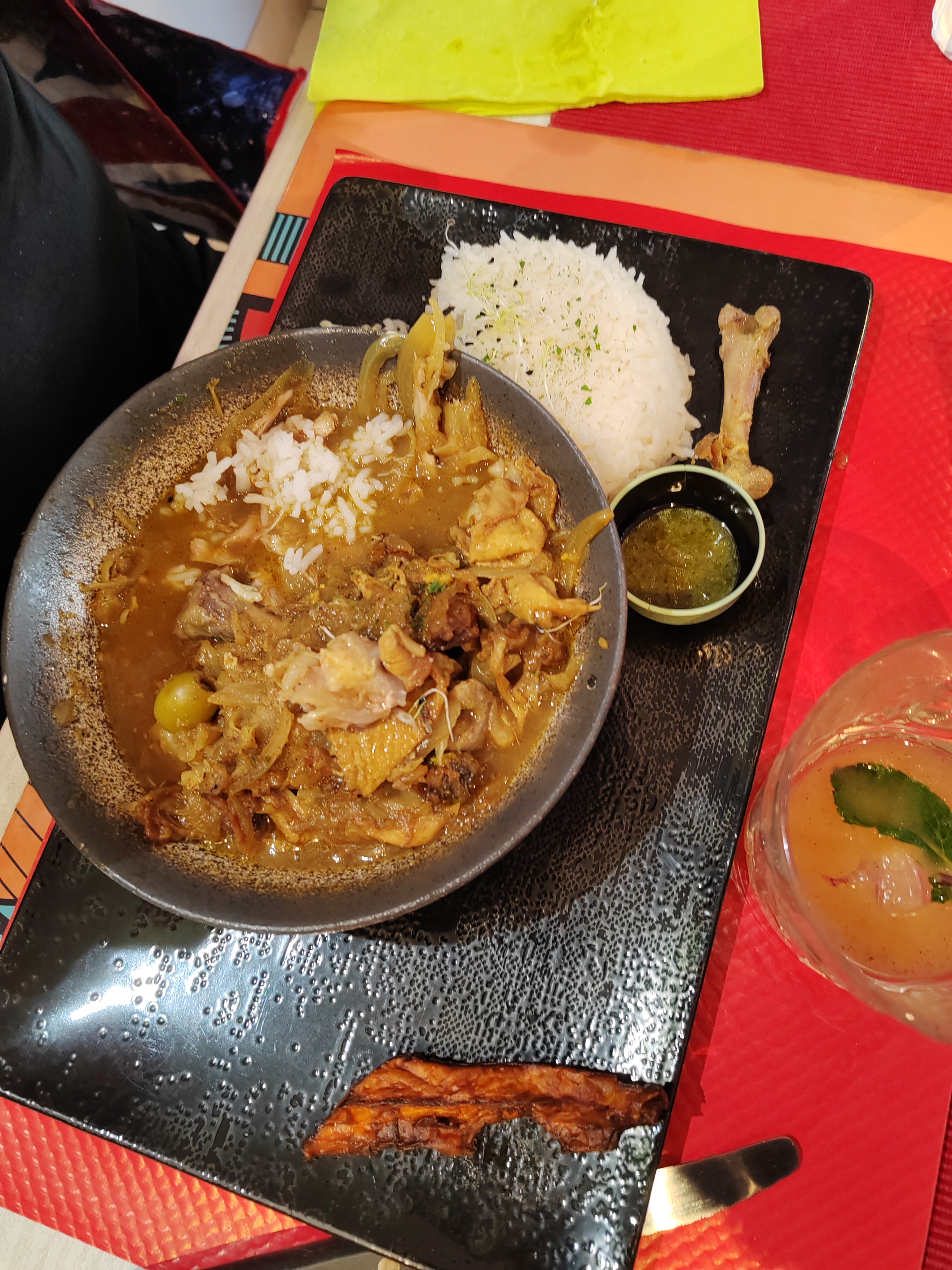 Punch maison en apéro, super bon 😋 Poulet coco pour moi et poulet yassa pour mon compagnon, très bon, avec les épices à part si on a besoin de relever le plat 👌 juste bémol sur le fait qu'il n'y ai pas de desserts maison. Mais on y reviendra avec plaisir