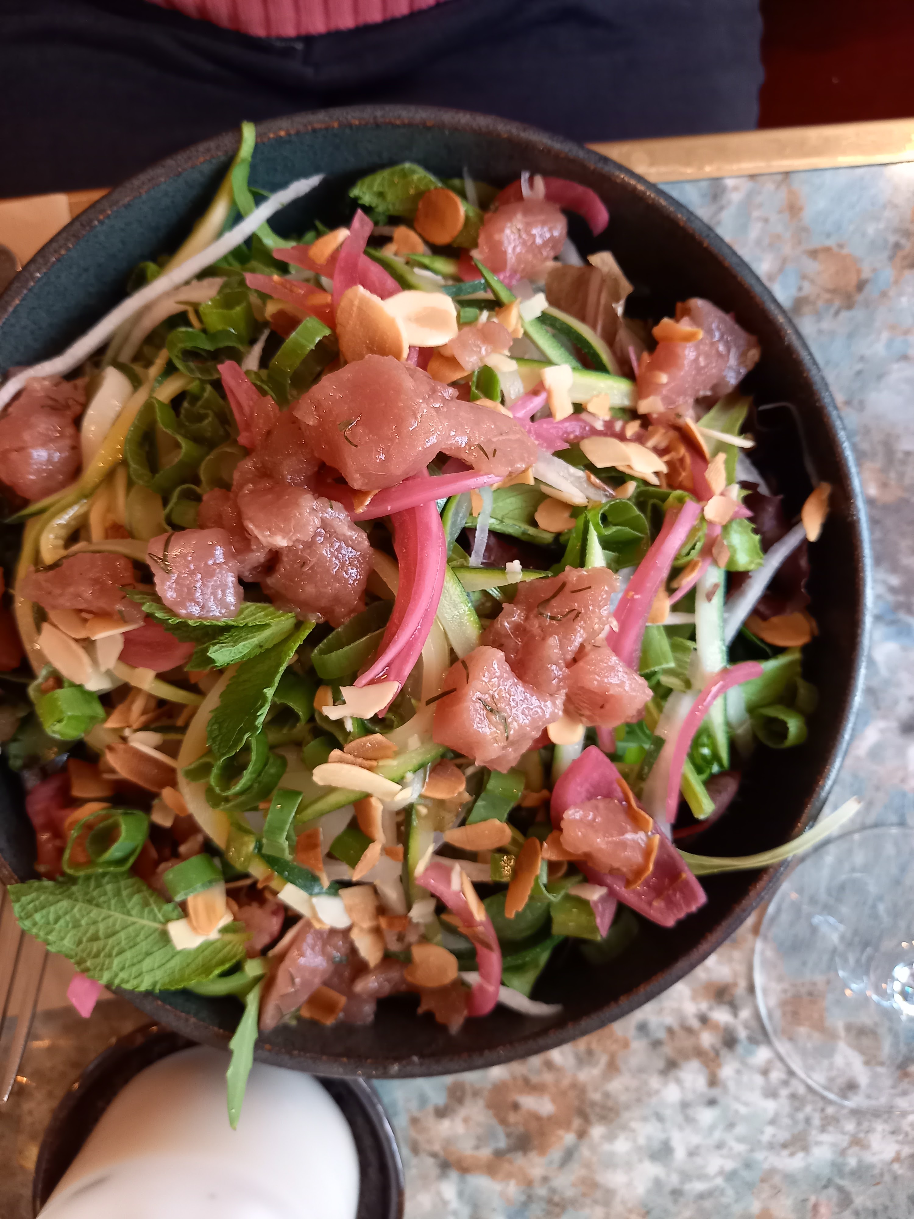 Je ne suis pas personnellement allé dans ce restaurant, mais mon fils m'a fait un rapport détaillé que je transmet (il n'a pas le temps de s'en occuper lui même). le décor est simple mais sympa. les plats ont l'air frais et ils sont goutus comme il se doit. il a particulièrement apprécié les tranches de lard transparentes sur son plat voir les 2 photos en dessous du commentaire. les desserts aussi sont excellents. le prix est un peu élevé mais globalement correct en fonction de la qualité des produits proposés. je note une offre de pizza végétarienne et sans gluten qui pourrait intéresser beaucoup de clients potentiels.