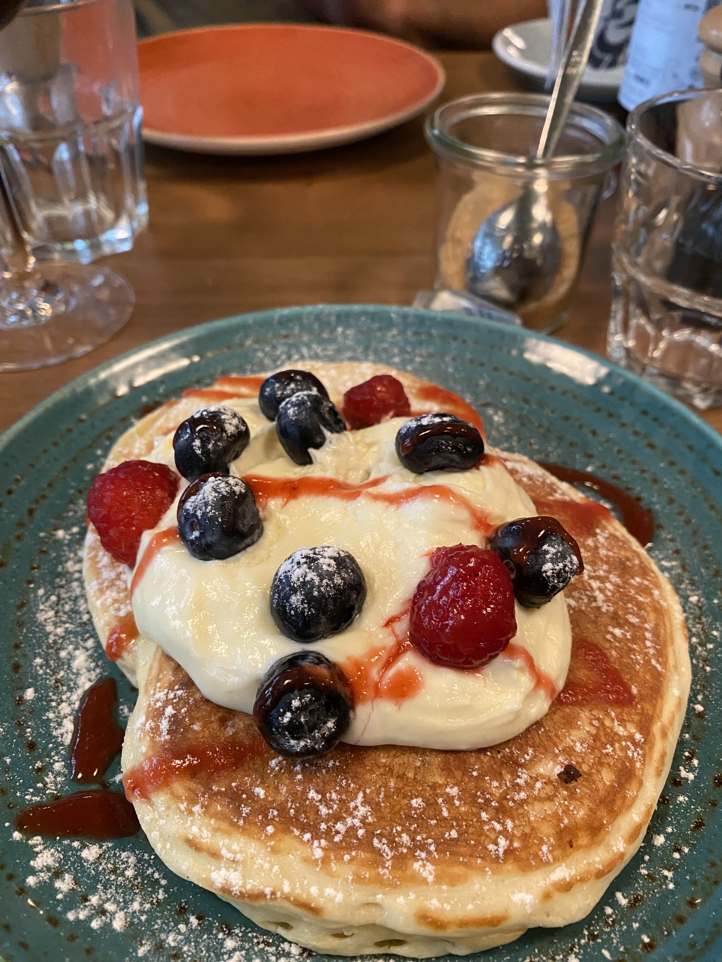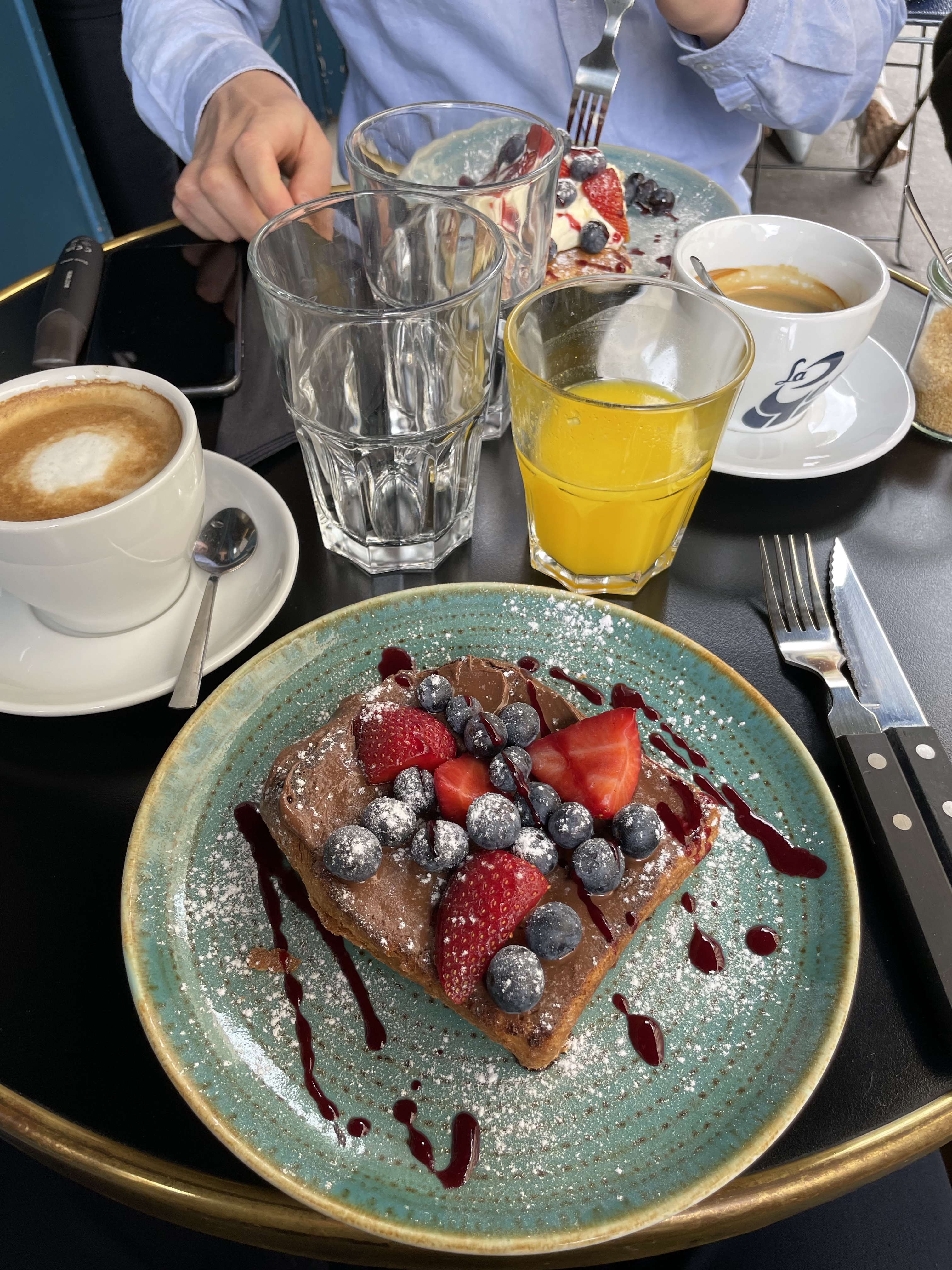 Un brunch très complet, on souligne les pancakes qui sont vraiment bon, c’est pour moi et de loin la meilleure partie de la formule. L’ensemble est d’un bon rapport qualité quantité prix ☀️ Qualité des plats un peu disparates, je ne vous conseille pas trop la pizzetta mais plus les pancakes salées avec les œufs du coup ! Les légumes grillés sont pas mal mais un peu trop proches de la salade de tomates cerises donc bon… le carpaccio de poulpe est aussi sympa. Ils sont juste un peu débordés du coup pour le brunch c’est pas hyper agréable, on a eu pas mal d’attente entre les “étapes” du brunch et on a du redemander plusieurs fois pour le thé, la salade de tomates, la focaccia etc..