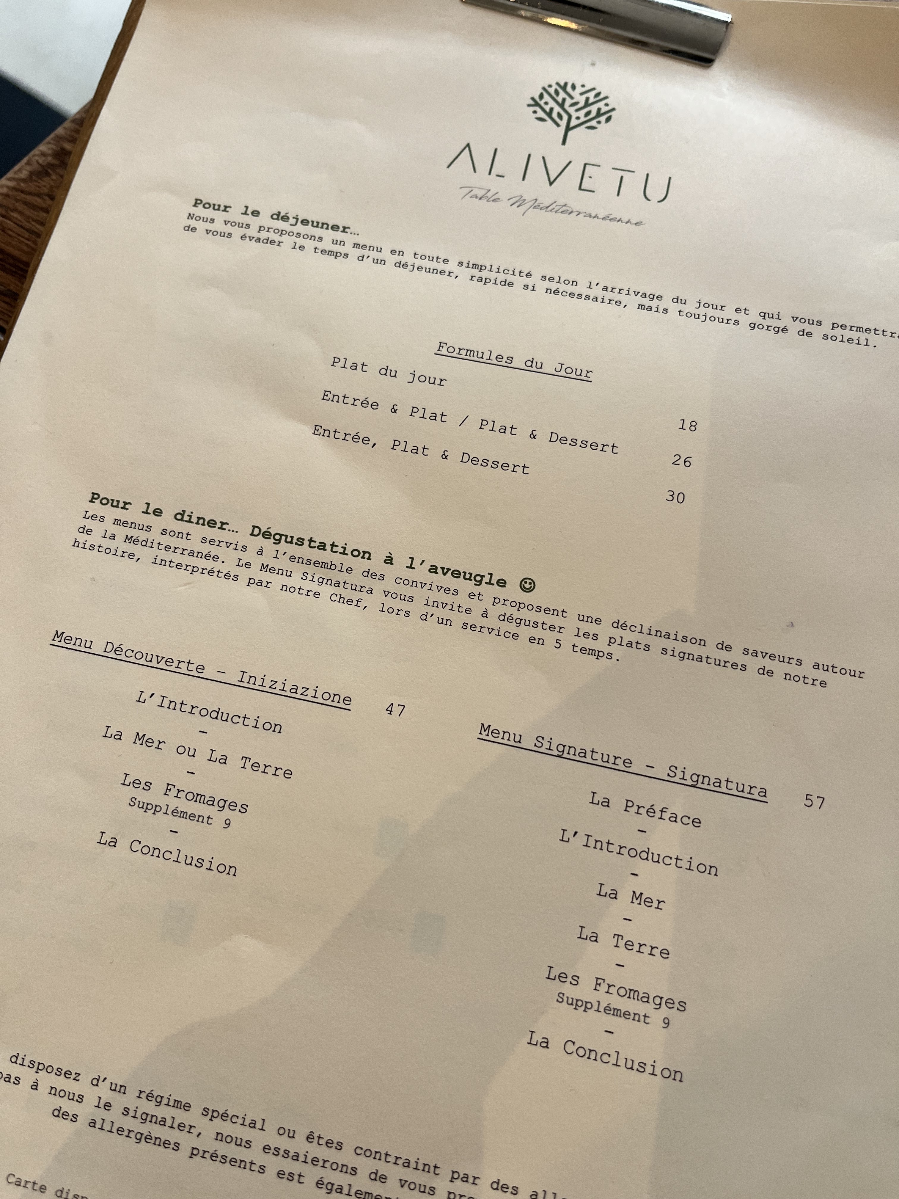 Deuxième visite (dîner à trois) avec une carte totalement renouvelée. Même principe, menu découverte, on déguste en essayant de deviner les ingrédients. On s'y prête ajoutant une note de divertissement au régal total du repas.Et très grande difficulté compte tenu de la sophistication et du très grand raffinement de tous les plats proposés. Tout y est au minimum délicieux, jusqu'au pain, la carte des vins est très riche avec de très bons choix. Alivetu est sans aucun doute un des meilleurs rapport Q/P de Marseille.