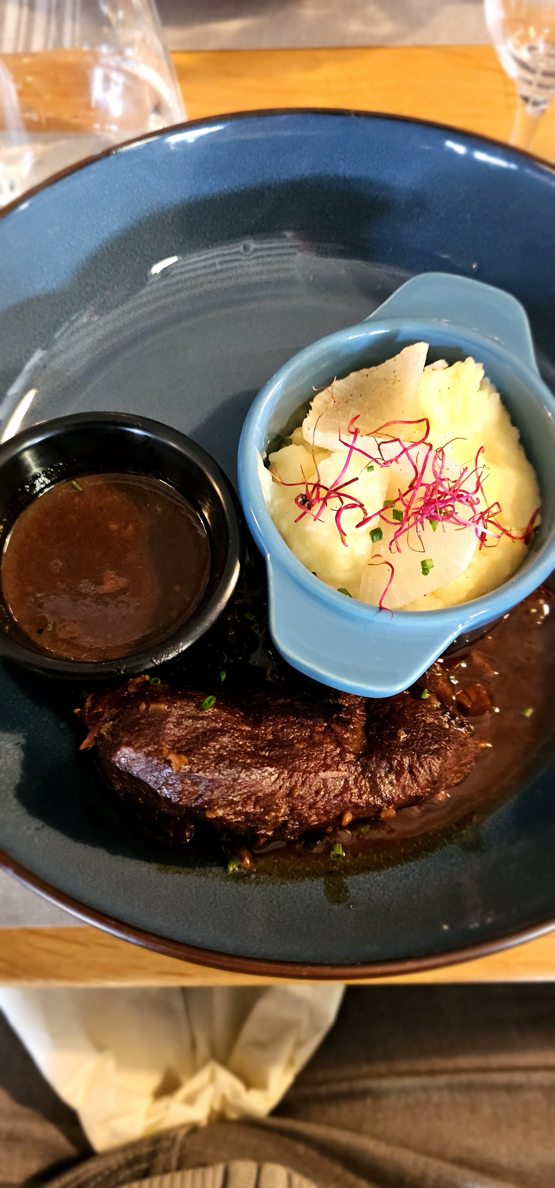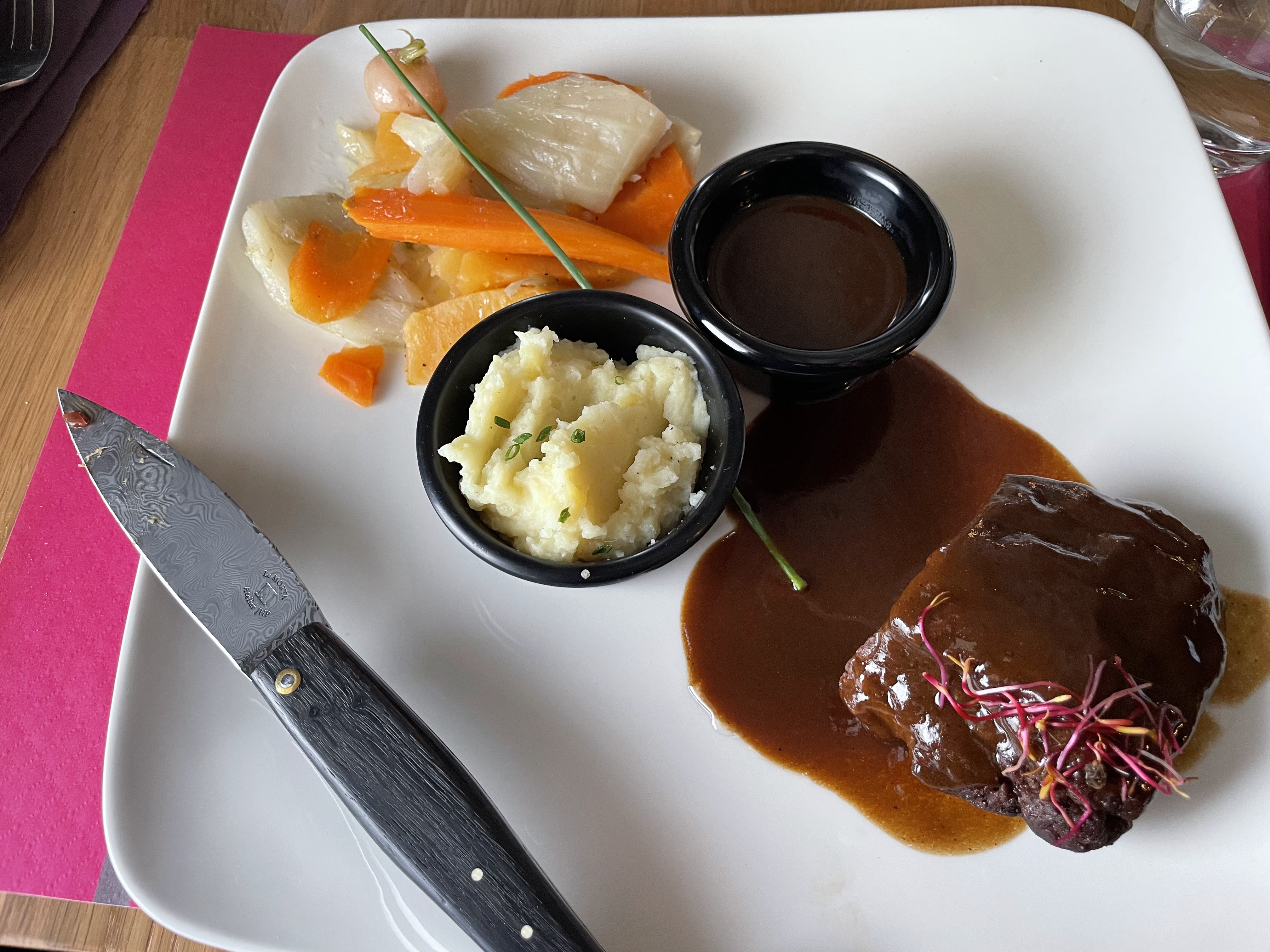 Ce restaurant ne restera pas dans ma mémoire gustative les cuissons ne sont pas respectées l'onglet très limite odeur et goût il a dû trainer dans le frigo le foie gras très moyen je pense qu'avec une remise en question ce pourrait être un bon restaurant