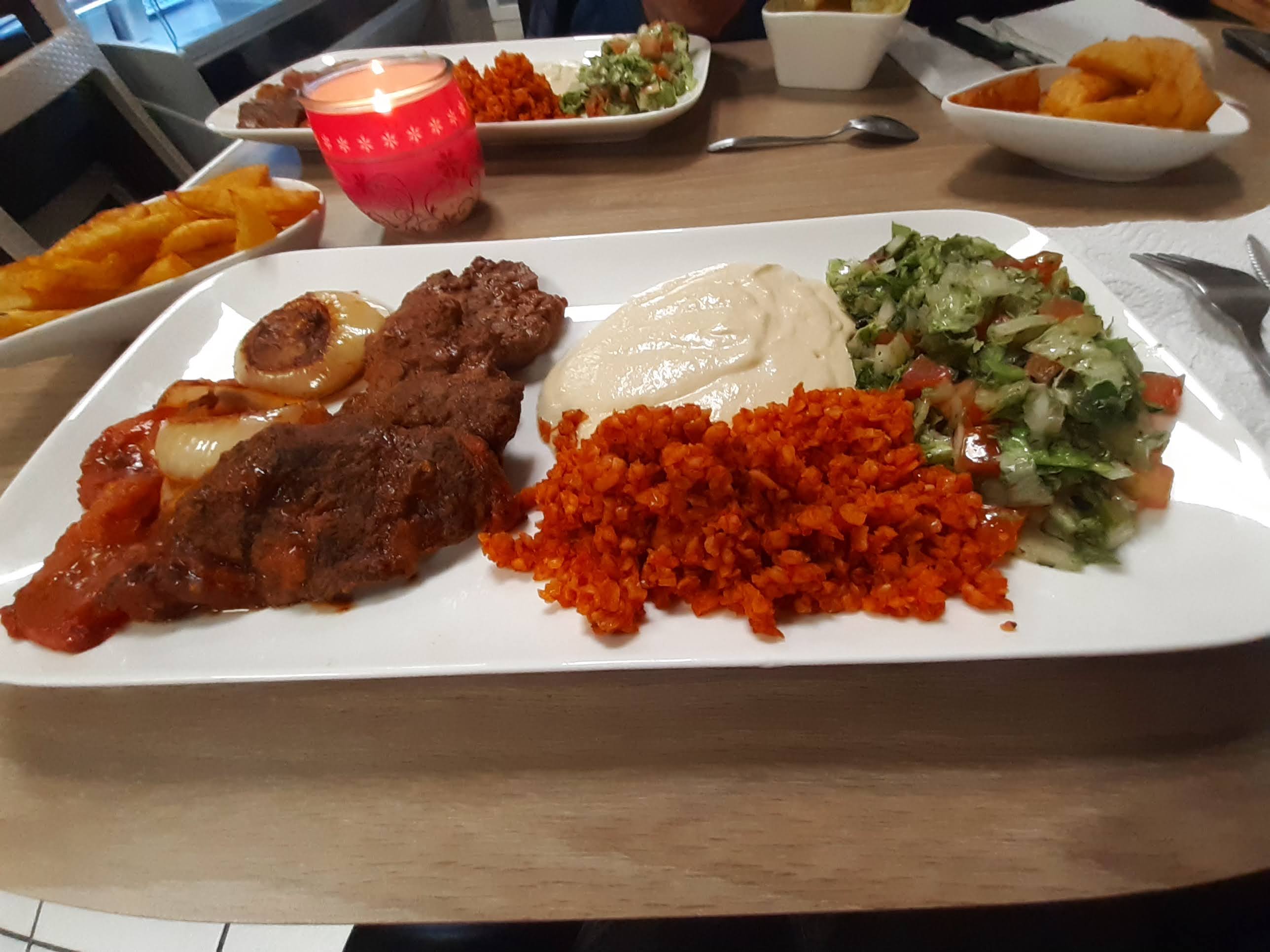 Malheureusement je ne recommande pas… J’ai commandé via Just Eat pour la première fois et je suis extrêmement déçue, voici l’assiette que j’ai eu pour plus de 12€… Quand j’ai commandé c’était bien écrit « frites / blé » mais au final pas de frites et on voit bien qu’il y a un trou dans l’assiette…. J’appelle le restaurant qui me dit que c’est soit l’un ou l’autre, qu’ils peuvent mettre les deux mais qu’il faut le préciser. Or, quand j’ai commandé, il n’y a aucun option pour sélectionner des frites ou du blé… De plus, lors de la préparation de ma commande, le restaurant m’a appelé pour me dire qu’il n’y avait plus les boulettes de boeuf que j’avais commandé et me propose de remplacer ça par du houmous : j’accepte. Cependant, puisque le houmus était moins cher que ce que j’avais initialement commandé, je pense qu’ils auraient pu l’effort de garnir un peu + l’assiette (avec des frites par exemple….). Je suis vraiment déçue. J’espère pouvoir me faire rembourser via just eat.