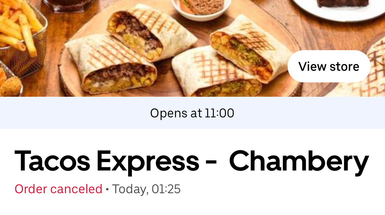 J’ai passé une commande sur UberEats, ma commande a été accepté (commande passée à 1h25 du matin) puis elle a été annulée à 2h05 du matin. Le restaurant ferme à 2h mais apparemment ils ont eu le flemme de préparer ma commande. Le livreur m’appelle à 1h49 du matin pour m’annoncer que le restaurant était fermé. J’appelle le restaurant ça répond et ça raccroche donc il n’était pas vraiment fermé … Il faudrait changer vos horaires d’ouverture sur le site de Uber si vous avez la flemme de préparer des commandes à cette heure. Je précise que sur UberEats ce restaurant porte le nom de « Tacos Express - Chambéry », étrange de changer de nom, peut-être pour brouiller les piste afin de ne pas recevoir de commentaires !