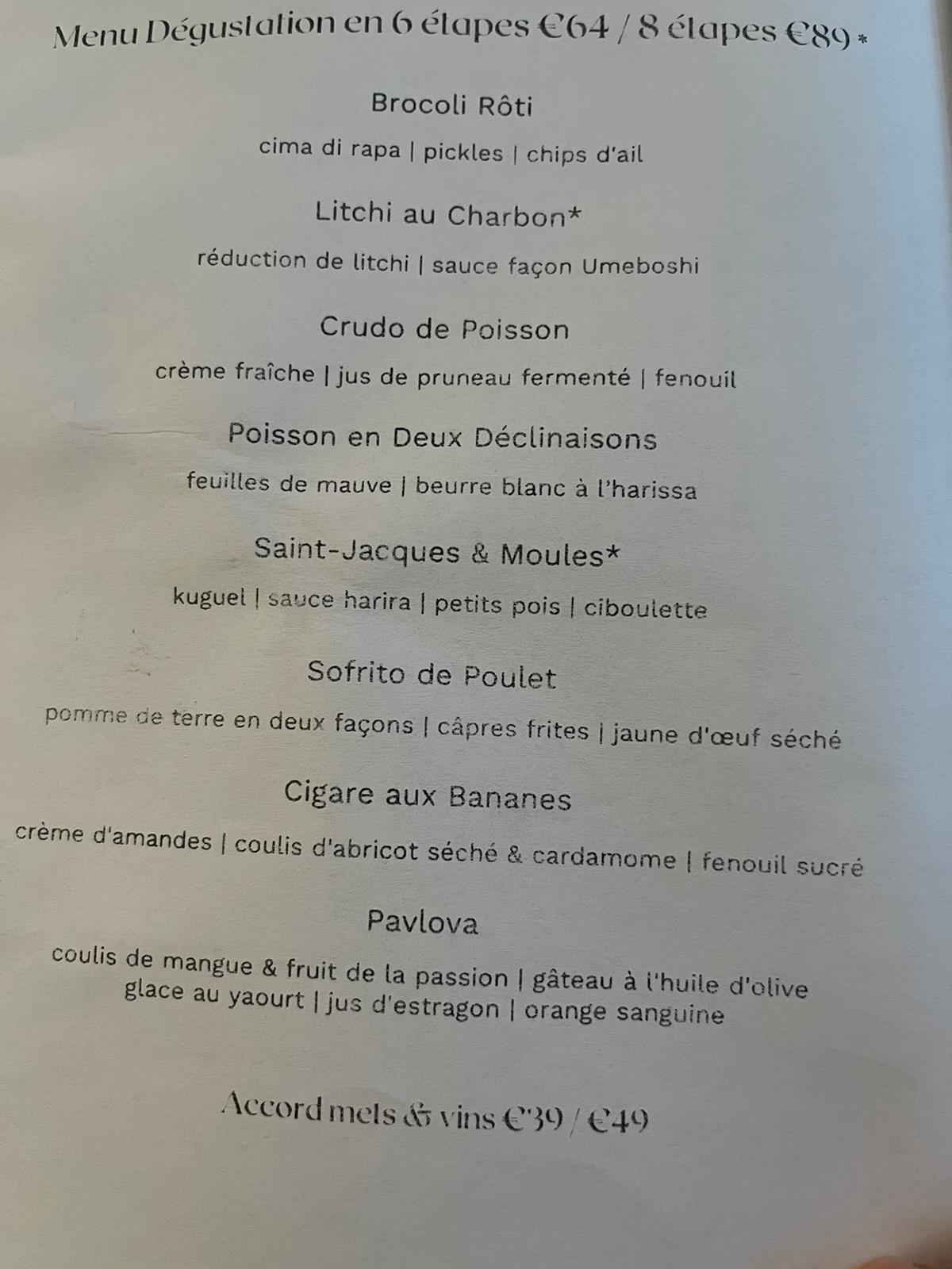 Excellent dîner (menu dégustation 55€ par personne). Les plats sont succulents, avec plusieurs ingrédients que nous ne connaissions pas et que nous avons adorés. On sent toutes les influences multi culturelles du Chef dans ses plats. Les combinaisons sont toujours bien trouvées. Le lieu est très joli, l’équipe est très agréable, disponible et présente à merveille chacun des plats. Merci pour ce moment.