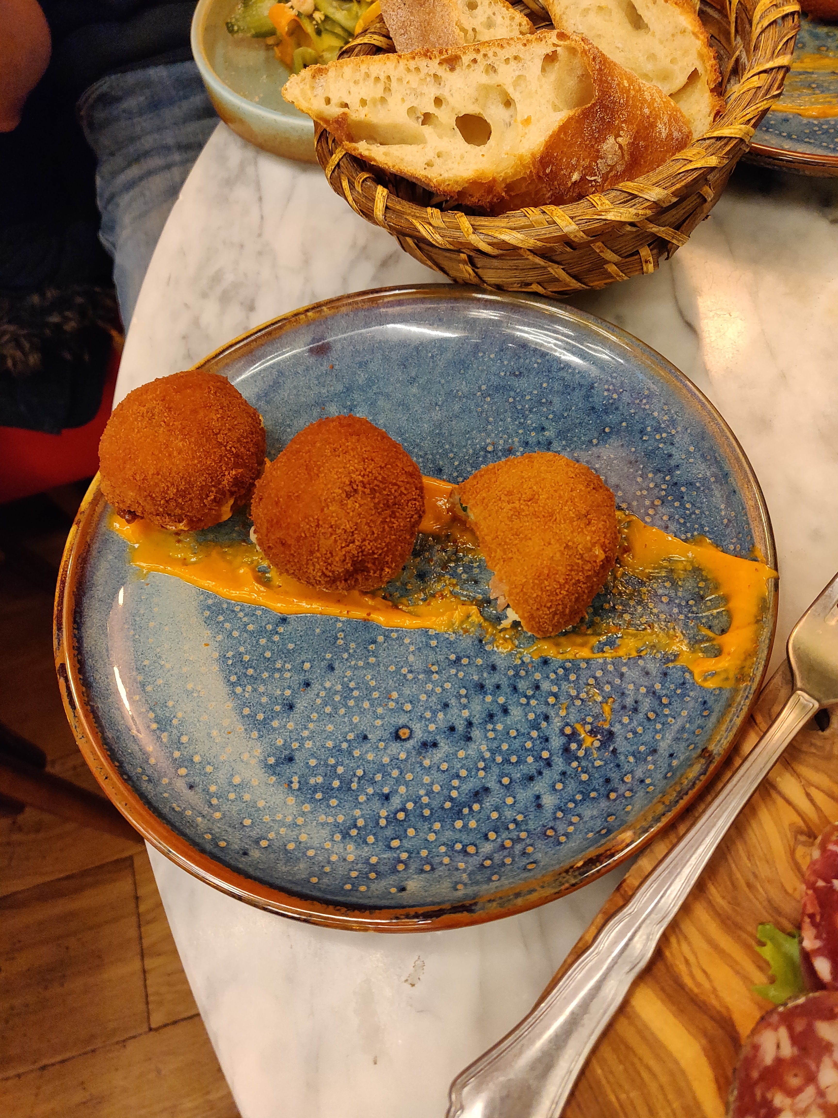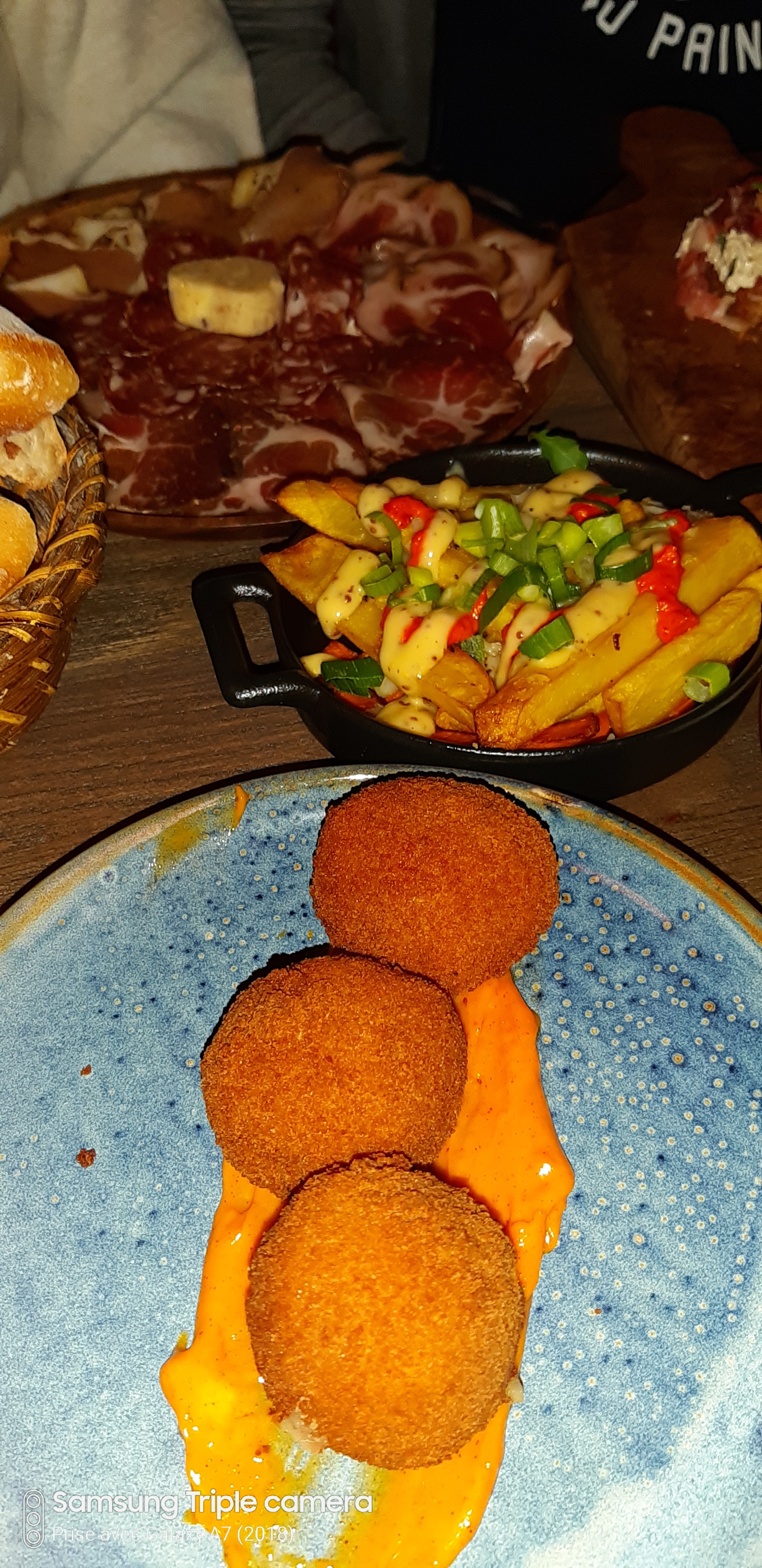 Nous y étions samedi 23 juillet 2022 avec mon conjoint, le service était assez long sûrement dû à l’affluence ce soir là ce qui est compréhensible mais nous n’avons rien eu comme geste commercial surtout que notre commande comprenait une planche de charcuterie qui ne nécessite pas de cuisson. Les quantités sont rikiki par rapport au prix des tapas (environ 9,50€ la tapas ce qui reste élevé par rapport à la quantité). Les boulettes à la sauce tomate sont sèches et fades mais le reste était bon. Le pain est en contact direct avec les mains des serveurs qui manipulent juste avant la caisse ou autre, ce qui n’est pas très hygiéniques. Cependant, je n’ai retiré qu’une étoile car les serveurs sont très aimables et les croquettes à la tomme sont délicieuses!