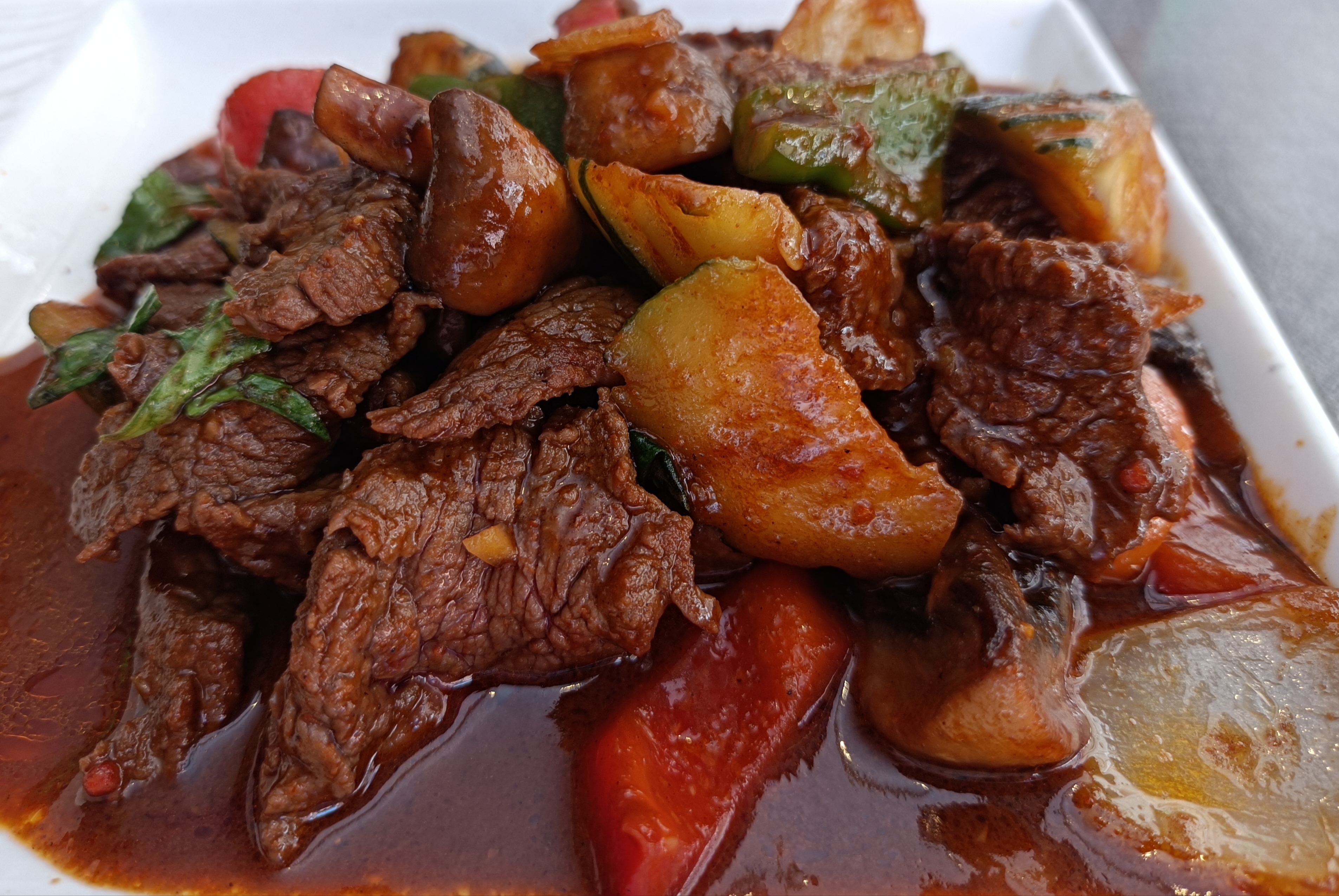 Nourriture préparée à l’avance et réchauffée. Bœuf sauté au basilic thaï: lamelles de bœuf très sèches. Idem pour le riz gluant, il m’attendait depuis quelques temps.