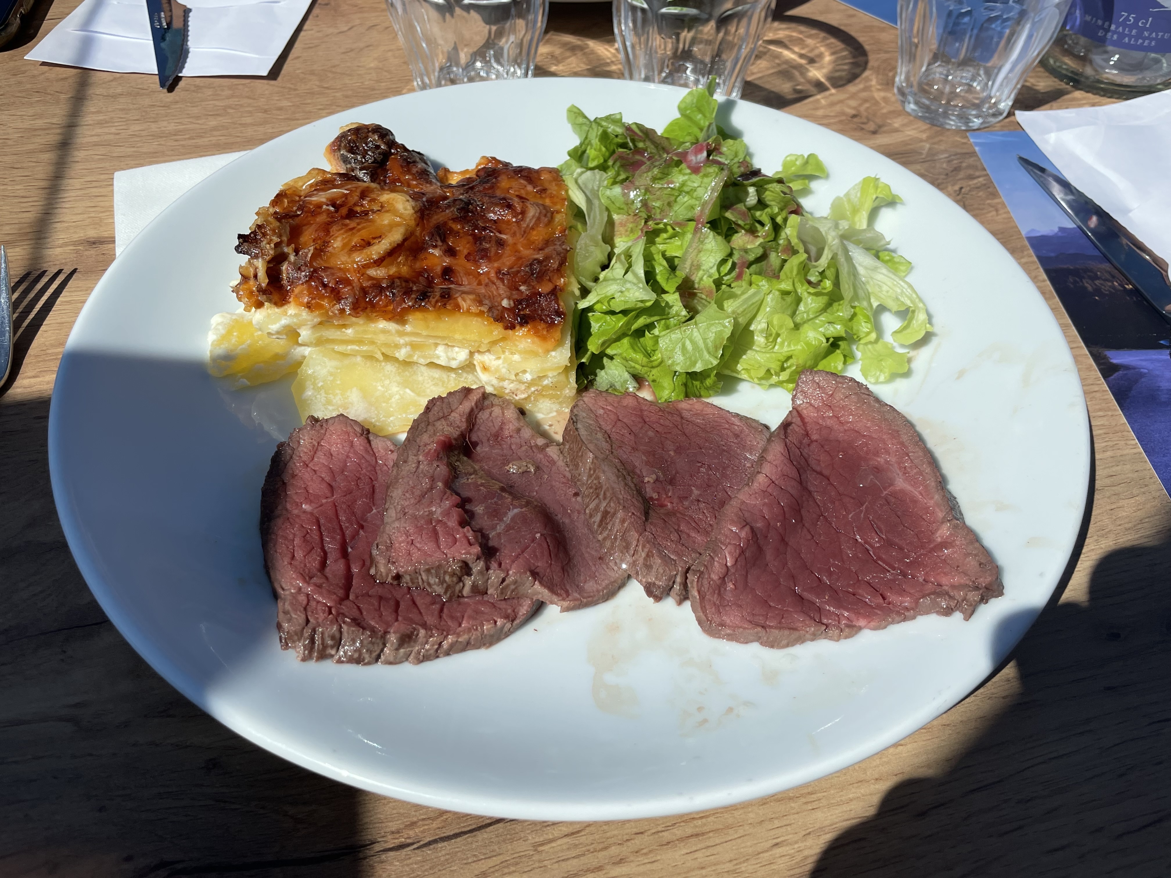 Belle balade au départ de l'Alpette avec vue incroyable sur le Mont Blanc. Nous avons apprécié le plat du jour, une généreuse portion de rôti de bœuf gratiné.