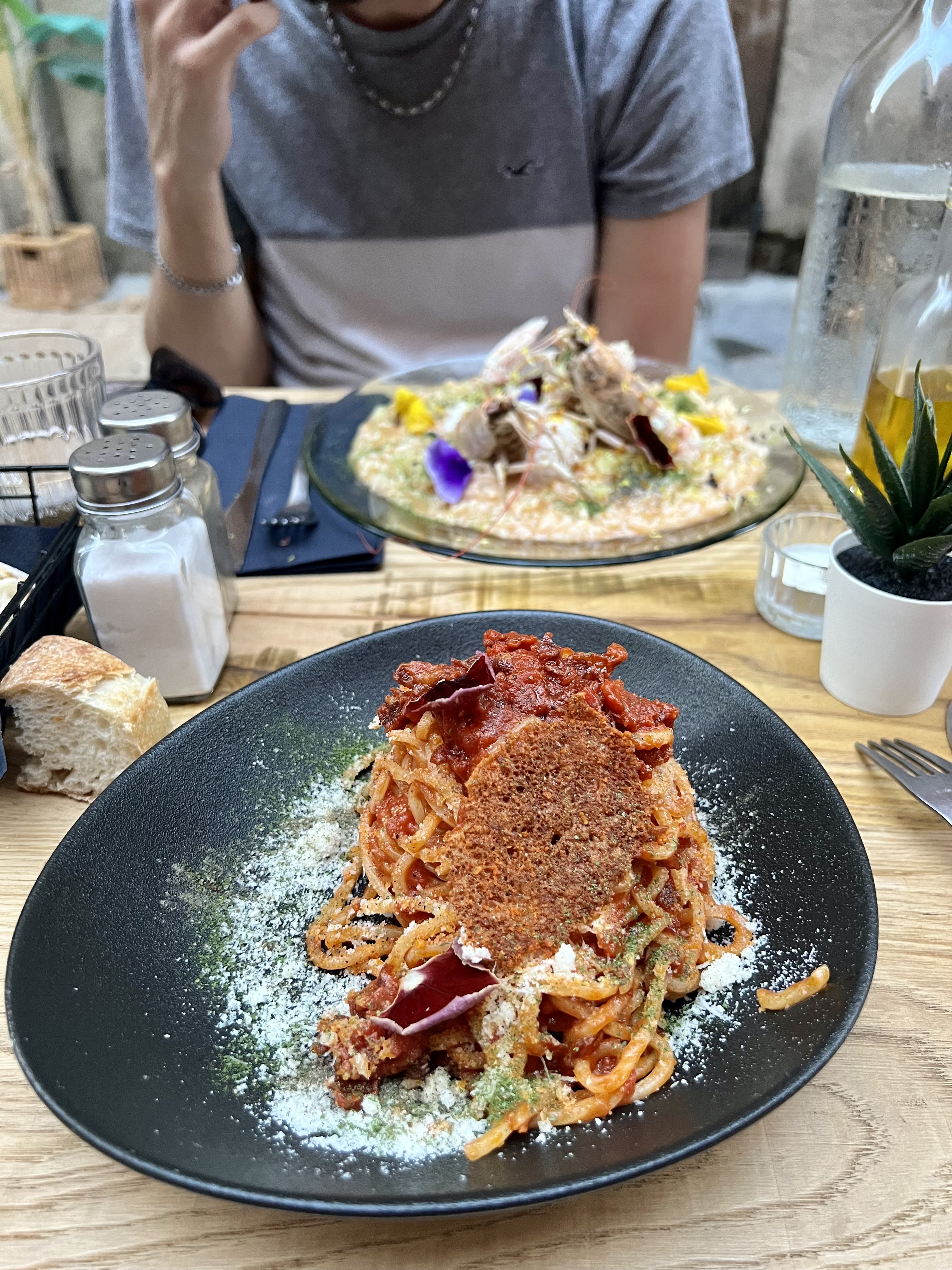 Super experience! Petite rue a l'écart de la place donc plus calme et appréciable pour discuter tranquillement. Le service était au top, notre serveur venait régulièrement mais pas tout le temps non plus pour demander comment ça allait si on avait besoin de remplir notre verre quand il était fini. Enfin la cuisine: la planche de tapas était originale, il y a un vrai effort pour proposer des tapas qui sortent de l'ordinaire et elles étaient toutes bonnes. En plat le saltimbocca était bon, cuit comme il faut: croustillant à l'extérieur et bien tendre et juteux à l'intérieur. Cerise sur le gâteau, la découverte d'un digestif aura myrte, servi frais et une dose assez généreuse, parfait après un repas aussi bon et généreux.