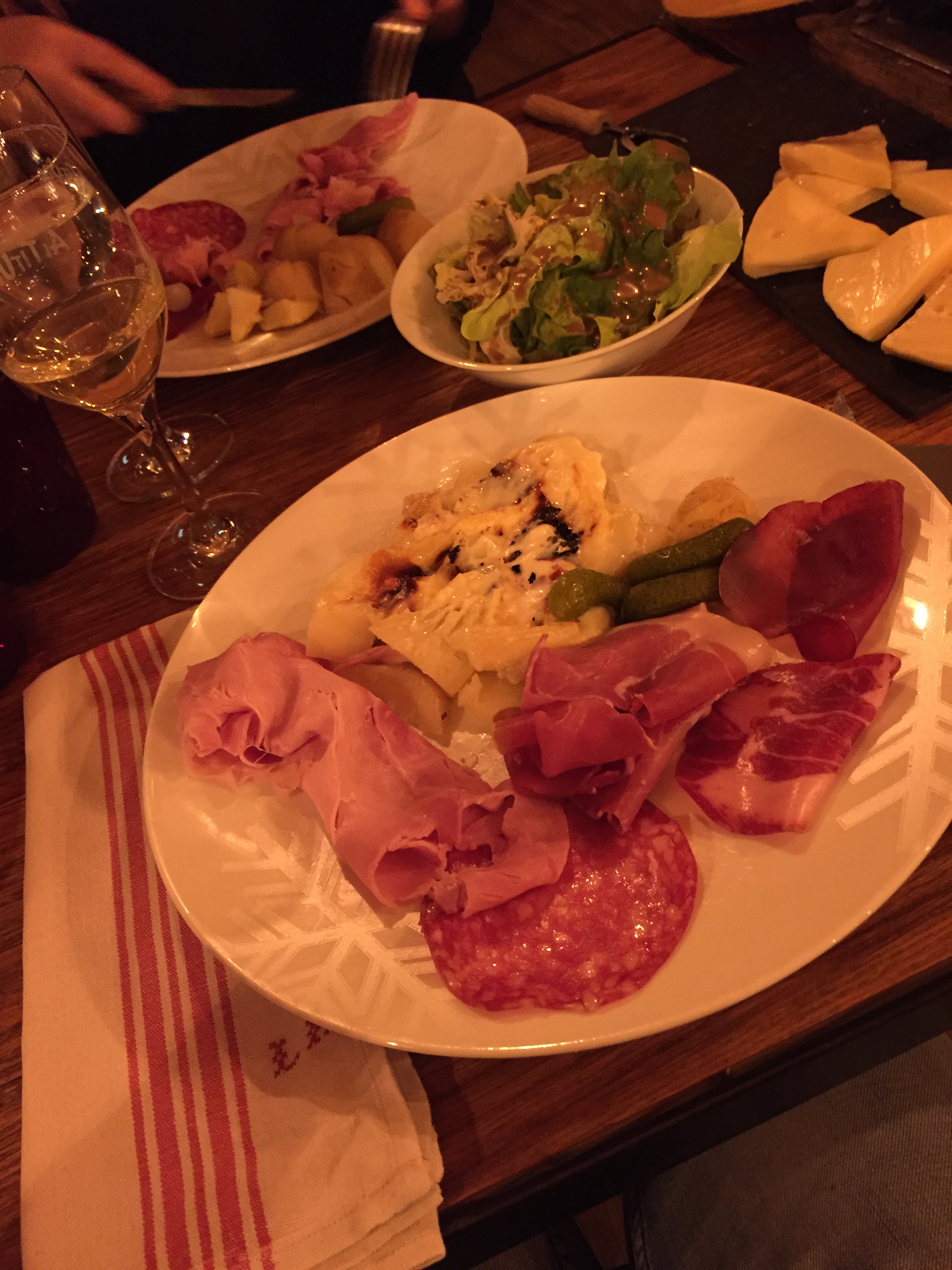 Nourriture excellente même si le supplément charcuterie fait très mal aux fesses ! : 10 euros.. pour 1 ou 2 personnes, on ne sait pas, en tout cas nous avons eu une première moitié pour mon ami, je ne sais pas si une 2eme devait arriver une jour :) (La proportion pomme de terre/fromage/charcuterie n'est pas très équilibrée :/ )
