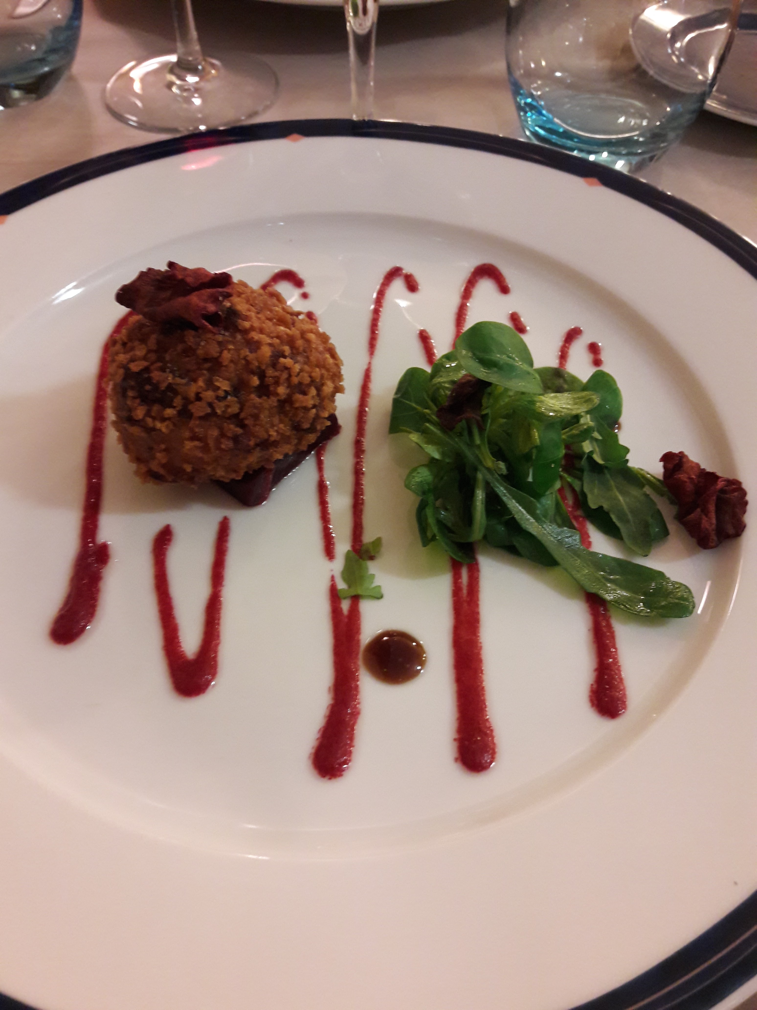 Nous étions au restaurant de l'hôtel. Cuisine remarquable et originale. J'ai pris en entrée de l'artichaut au foie gras : délicieux ; il fallait y penser ! Quant au thon commande par mon épouse en plat principal, elle n'en avait jamais mangé d'aussi bon selon ses dires Autres pays à l'avenant. Donc restaurant à conseiller. Seul bémol : il y avait un groupe de 30 personnes dans la salle, avec le bruit qui va avec. L'hôtesse m'a dit que, quand cela arrivait, elle prévenait normalement les clients, car ils n'ont pas d'autres salles adéquates.