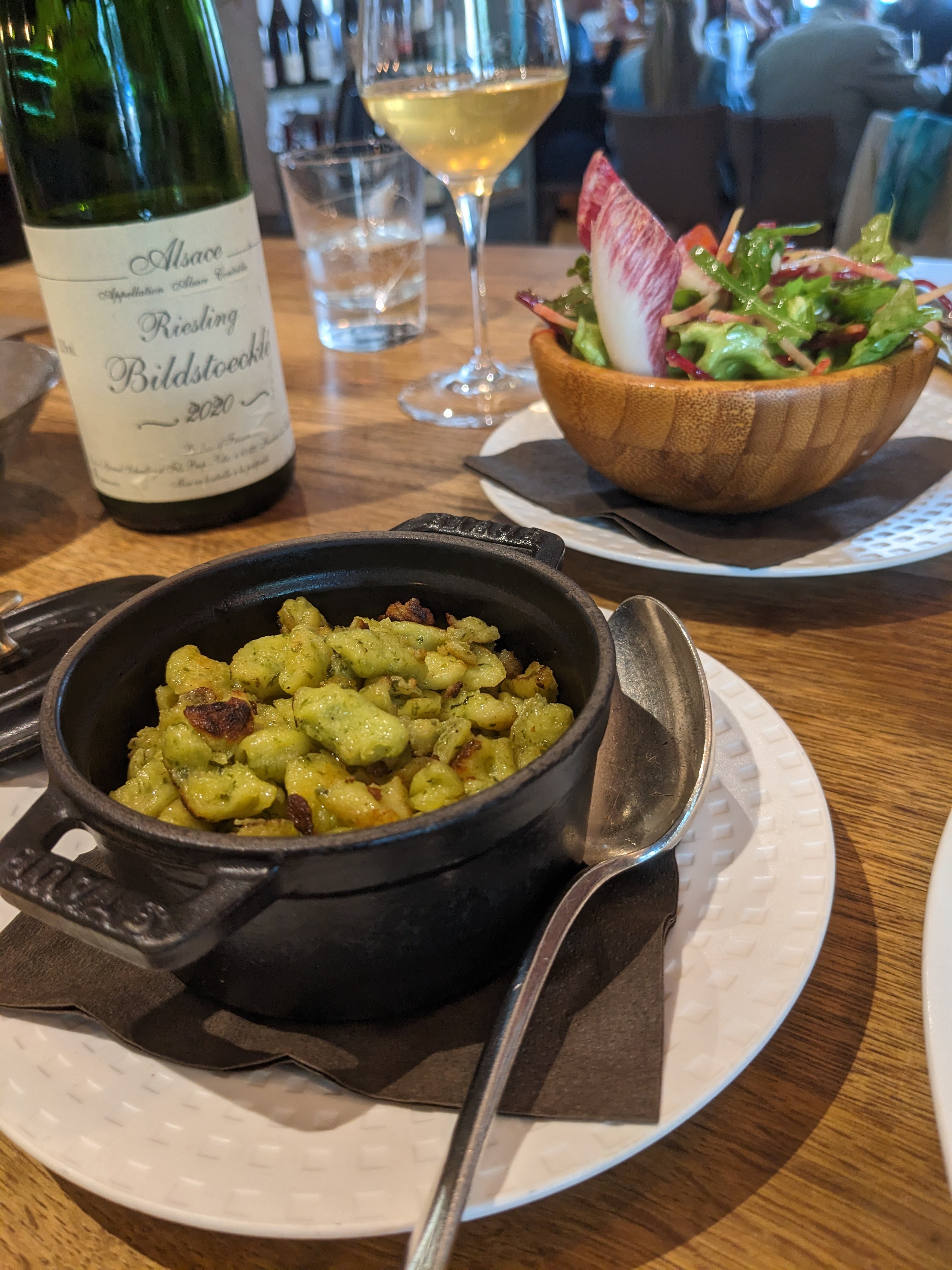 Restaurant d'exception dans le cadre idyllique de Mittelbergheim. La cuisine a été raffinée et créative, élaborée à partir de produits locaux de saison, tout en étant copieuse et sans prétention. J'ai opté pour le menu de printemps, centré autour des asperges, qui a été un vrai régal. Les vins naturels, recommandés par Sylvie et Anne et vinifiés à quelques kilomètres du restaurant, ont été somptueux et parfaitement accordés avec notre repas. Nous avons passé un très bon moment en fin de soirée à discuter avec l'équipe dans leur bar chaleureux et bien agencé. Nous reviendrons sûrement.