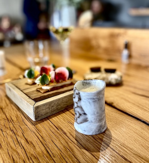 MERCI UN GRAND MERCI pour votre TRAVAIL CRÉATIF, une surprise si subtilement harmonieuse des plats proposés. Nous sommes embarqués entre Terre et Mer pour un voyage gustatif qui suspend le temps. La cuisine du chef est une explosion de flaveur (goût et odorat à laquelle on pourrait ajouter l’esthétique des plats) qui sublime la nature, une expérience qui transcende par la béatitude qu’elle nous procure. Un moment inoubliable qui met en joie. Une cuisine « philosophique » pour qui sait apprécier. Le sommelier et l’equipe autour du chef sont là pour parfaire notre plaisir où rythme et harmonie sont en symbiose. Ce ravissement mérite d’être partagé, nous nous y emploierons. Bravo! Quelle créativité!