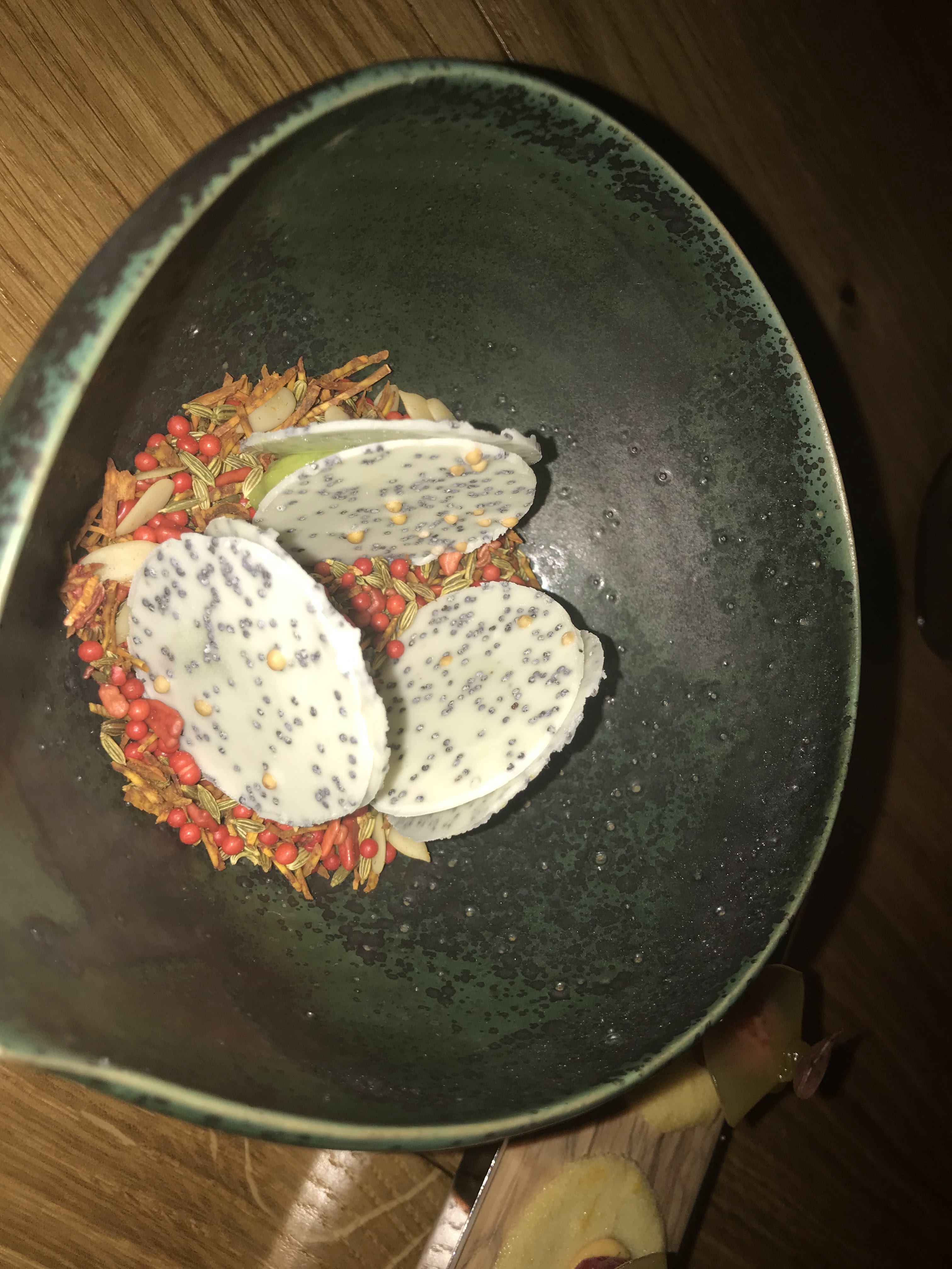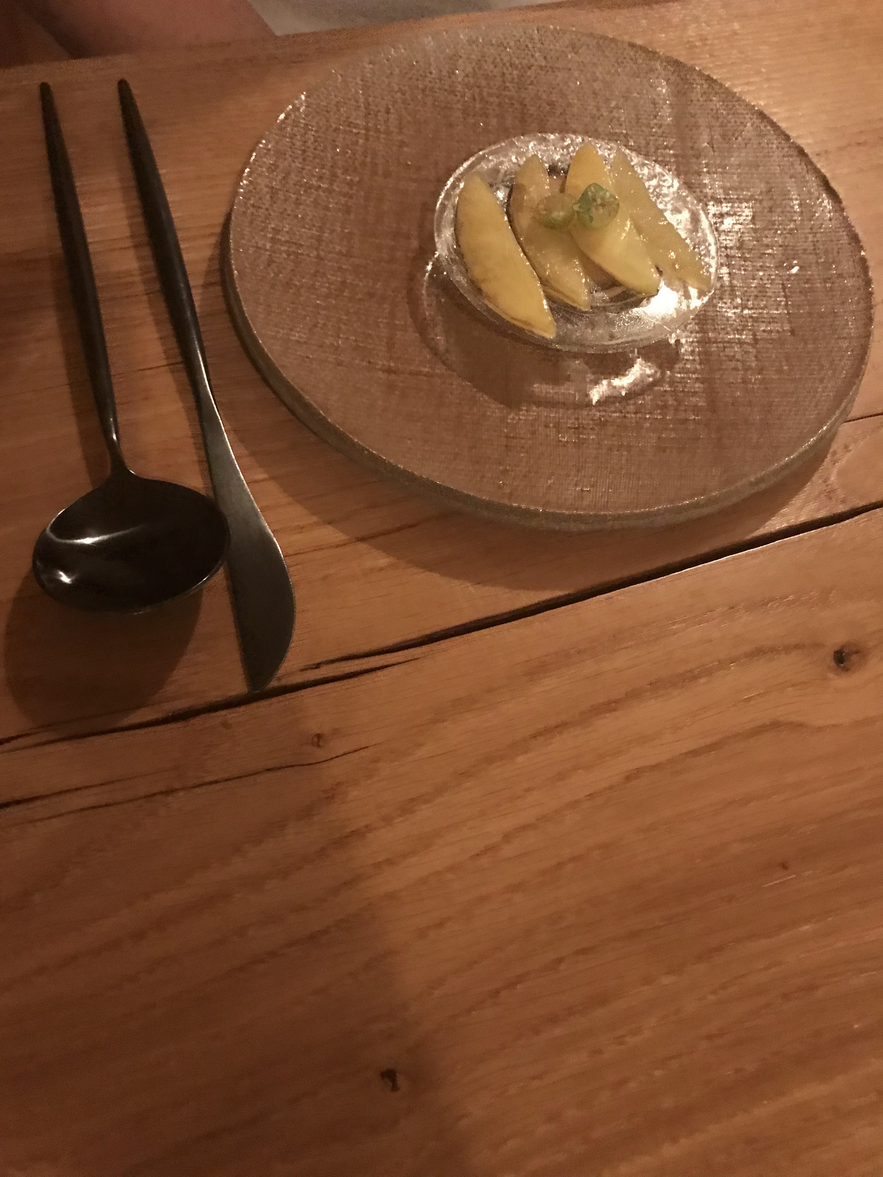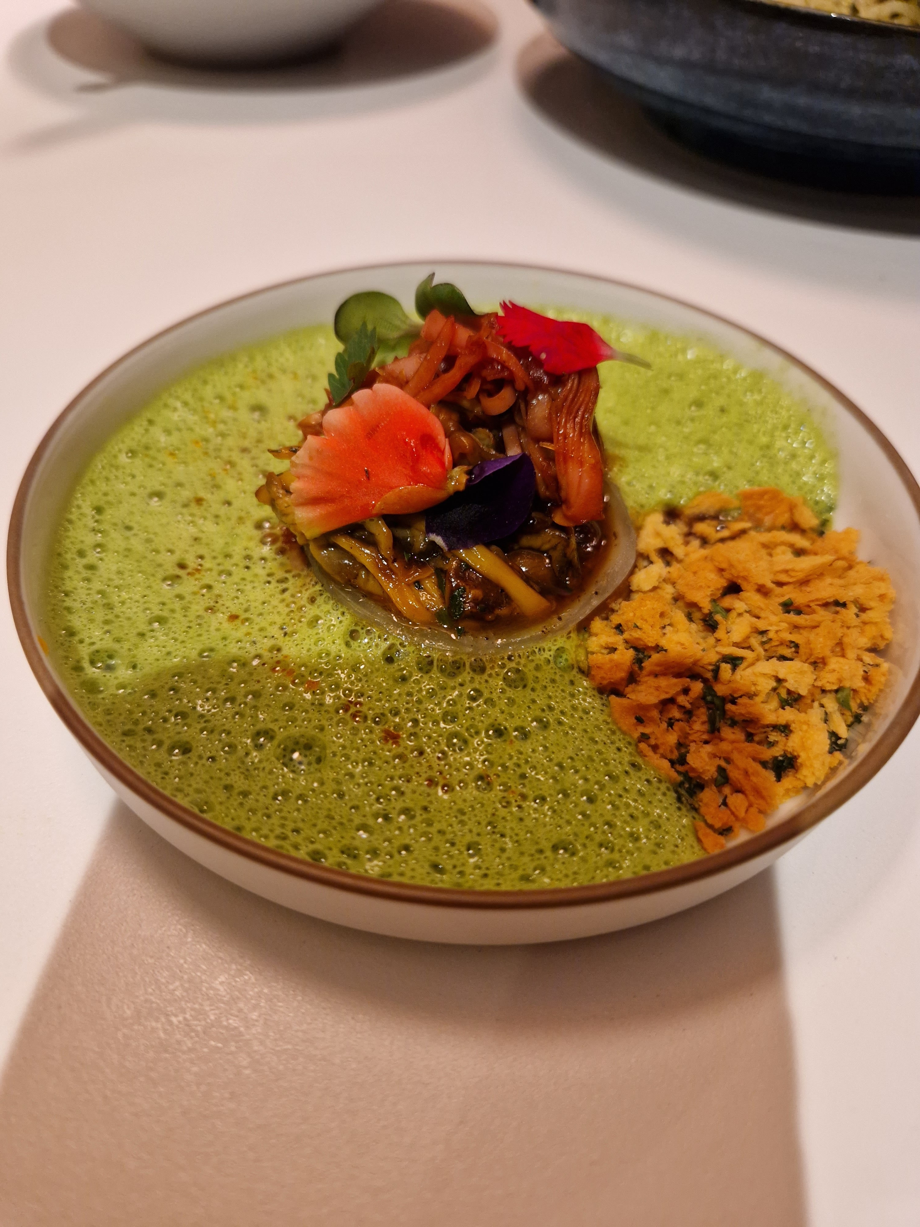 Une expérience ratée. Une cuisine très sophistiquée et complexe où je me suis un peu perdue. Nous étions mal installés sur une table partagée avec un autre couple et cela a joué c'est certain. Avec le personnel passant en permanence derrière moi pour les servir/desservir, un bruit de talons incessant et une impression d'être en arrière cuisine. Je n'ai pas apprécié le voyage proposé, certains plats m'ont bluffé par leur équilibre et leur audace comme par exemple les épinards et vermicelles au curry jus saté ou la glace au raifort ou la pomme nashi mais je n'ai pas tout aimé, ni compris l'ensemble. Déroutant avec le sentiment de passer à côté de qqchose. Une rencontre qui ne s'est pas faite.
