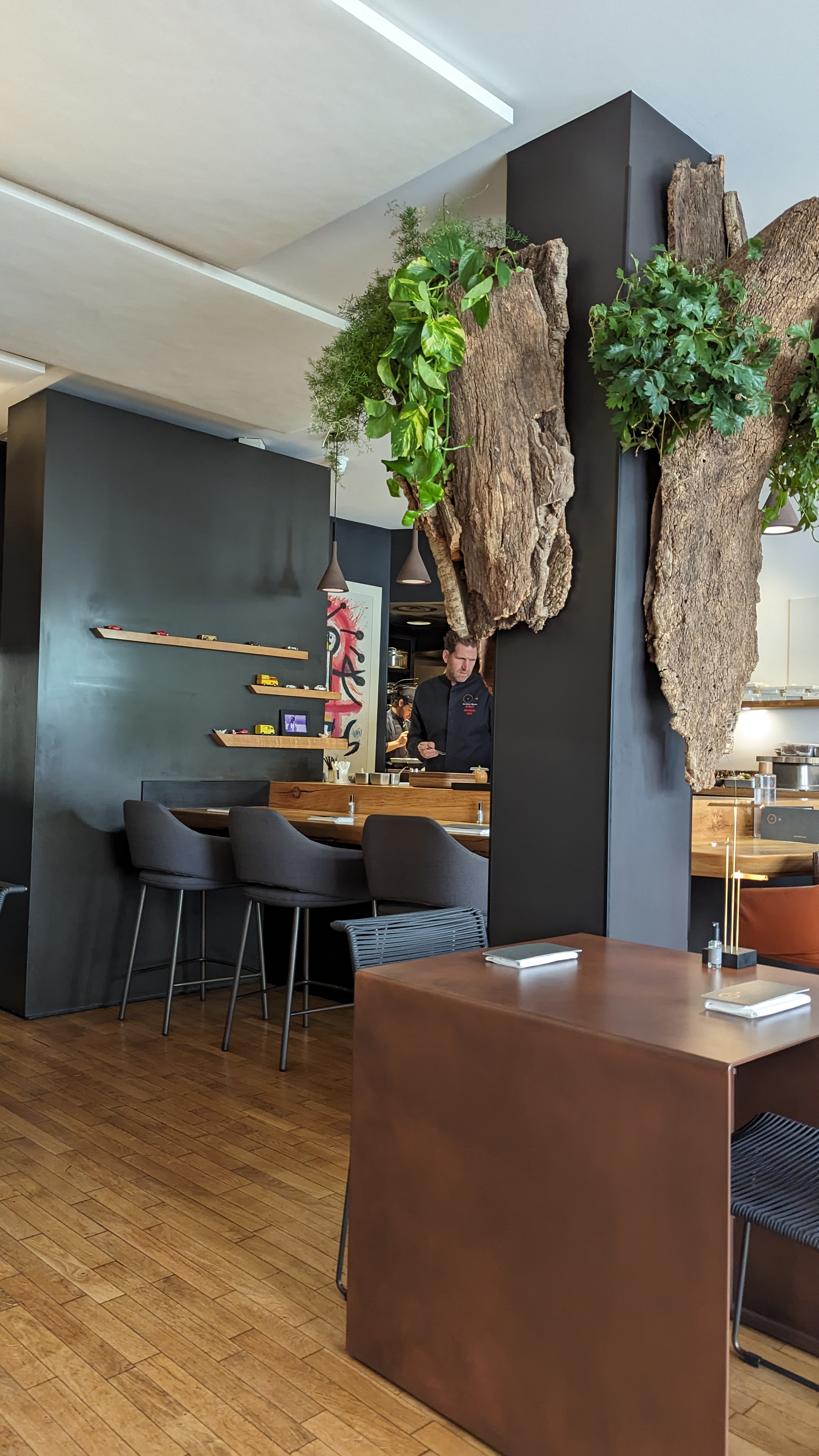 Nous avons choisi un menu dégustation qui est une carte blanche à la créativité du chef dont la cuisine est marquée par la torréfaction, les épices et le cumin. Ce voyage dégustatif en plusieurs tableaux fait la part belle à la mer et au végétal, dans une présentation impeccable et à l'enchaînement parfait tant au niveau des textures des couleurs et bien sûr des saveurs en bouche. Ainsi nous avons ressenti plusieurs twists entre les différents goûts d'une composition ou l'amèr peut succéder à la douceur pour la mettre en valeur. On a eu droit à des sauces fantastiques et bien sûr plusieurs plats signatures comme la fameuse anguille fumée - chocolat noir. C'est moderne, osé, parfois en provenance de souvenirs d'enfance et souvent teinté d'influences asiatiques. La variété se retrouve aussi dans la vaisselle puisque chaque composition a un contenant au style unique. Enfin, le lieu est simple et sobre, environ 25 places. La cuisine, sorte de petit labo, est ouverte et offre pour ceux qui le souhaitent les coulisses de la préparation où chaque élément de la brigade s'affaire à ses tâches sous la direction du chef étoilé. Peu d'attente entre les tableaux et il paraît qu'ils évoluent au fil des saisons, soit une bonne raison de revenir explorer l'imagination A M. Chef, merci pour ce voyage !