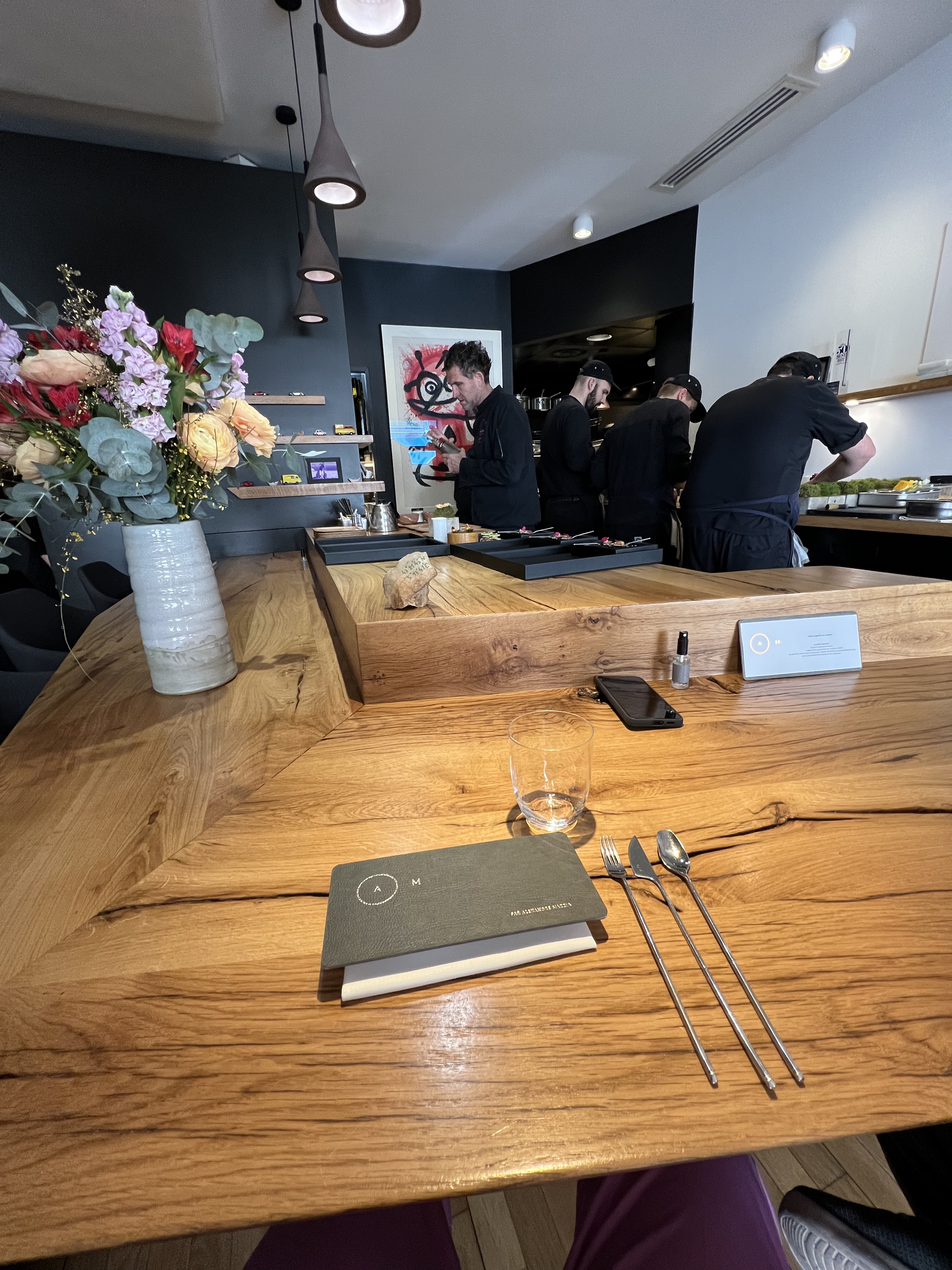 AM nous propose un voyage culinaire et la promesse est tenue ! C'était épatant ! Le chef est présent en cuisine qui donne sur la salle , un petit bémol sur cette dernière un peu bruyante et où on manque un peu d'espace. Mais les goûts sont là, on découvre des saveurs, des associations formidables, et on se régale !