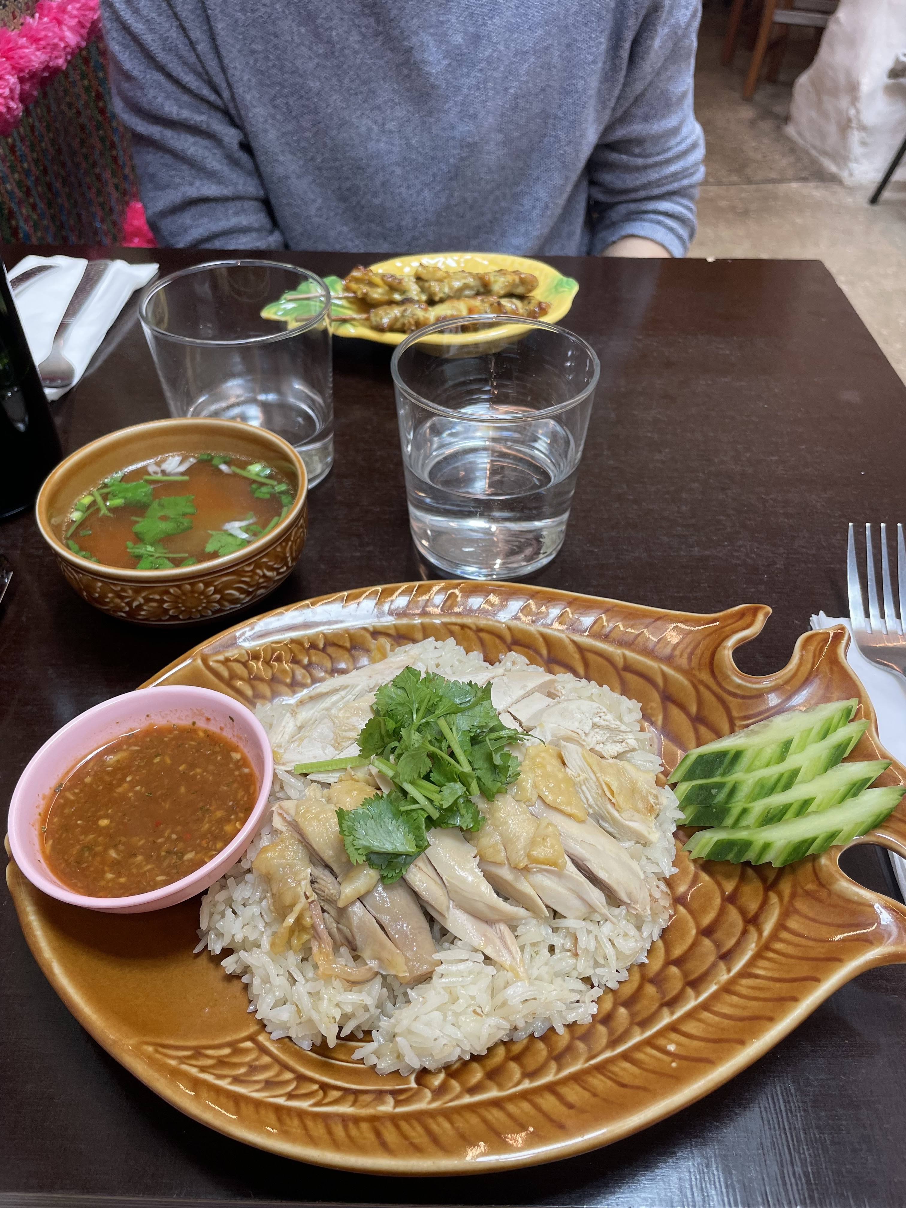 Nous avons eu Mien Kham (entrée), Khao Man Kai (plat principal) et PiakPoo (dessert) – tous étaient vraiment délicieux et le personnel super sympa. Dans l'attente de mon prochain repas là-bas.