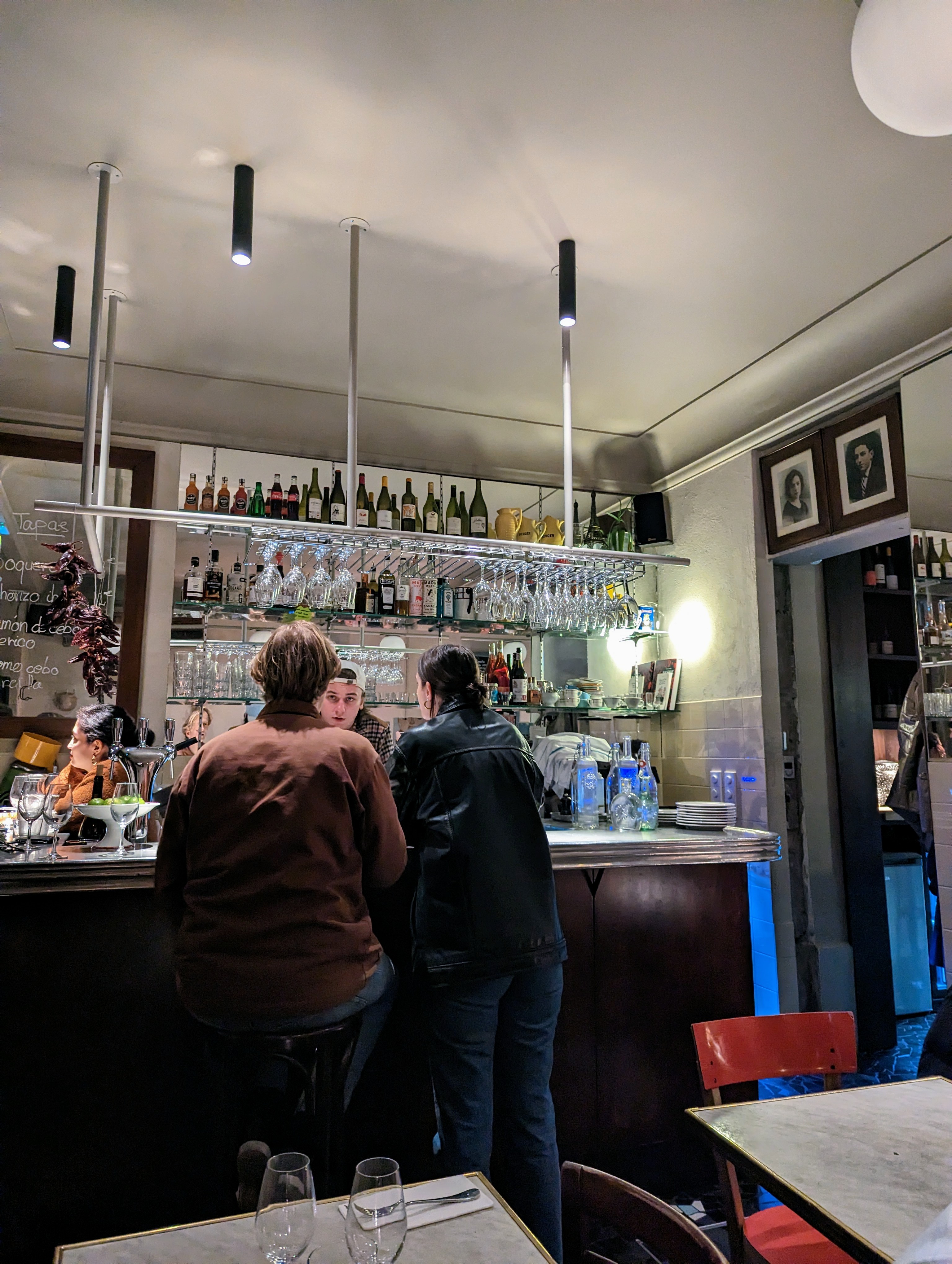 Ayant réservé une table pour deux, j'ai été étonné d'être placé sur une table haute dans un coin, le long d'une fenêtre froide ! Nous venions pour manger et non grignoter pour fêter un anniversaire ! Un groupe très bruyant au bar occupait la moitié du restaurant au point que le staff ne nous ait même pas vu en rentrant. Au menu, aucun plat basque typique ou même revisité… La serveuse ne nous entendait même pas pour prendre la commande. Nous sommes partis sans manger au bout de 5 minutes. Très exigu, le lieu n'est pas adapté pour dîner en discutant, c'est plus un repère d'habitués massés autour du bar.