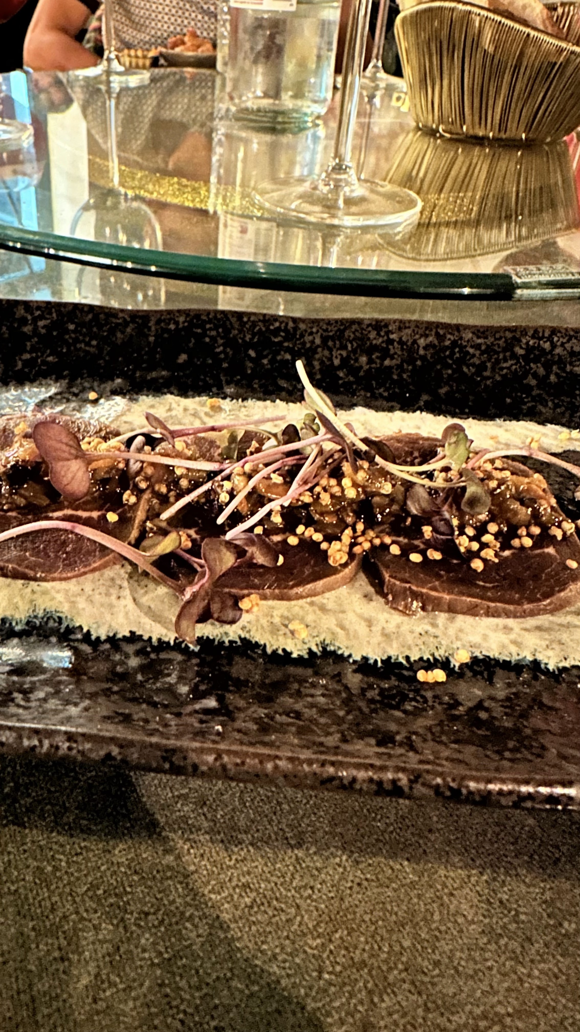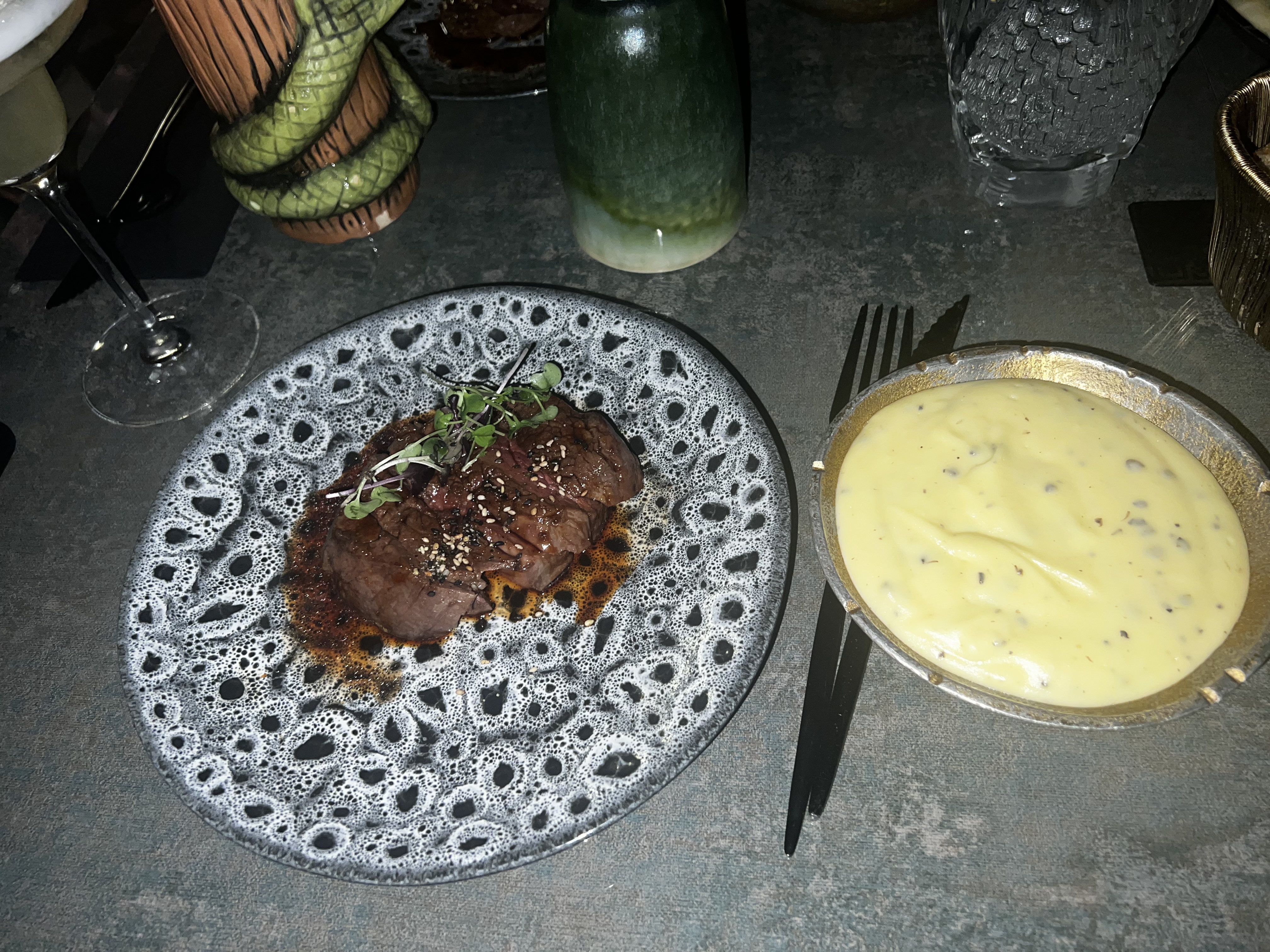 Restau très beau. Accueil et service au top Ambiance festive dj & show (j’y suis allée pour le service de 22h) Tout était bon Seul point négatif, la proximité des tables