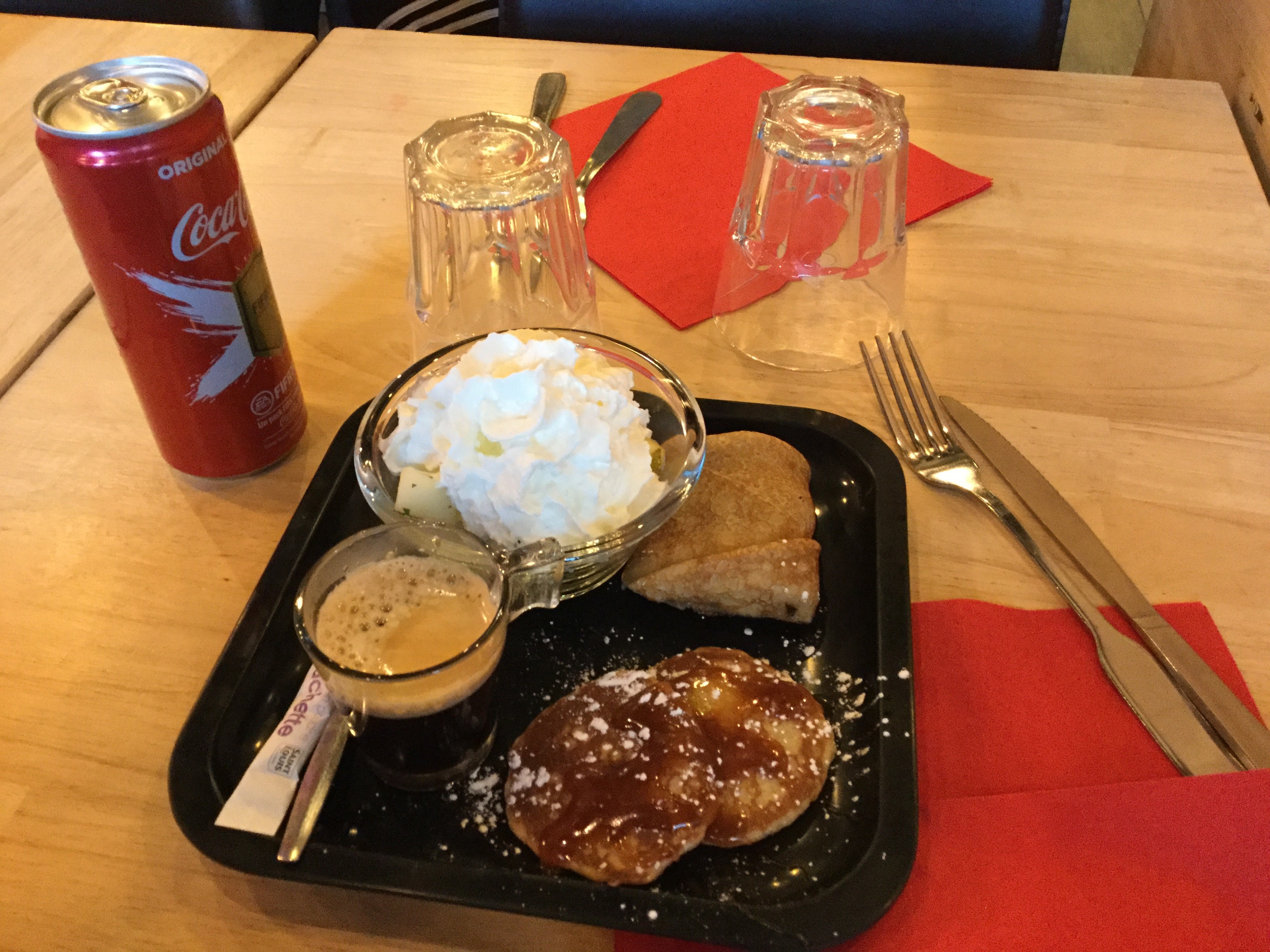 Venue pour le goûter, on nous a servi un double expresso que la taille d’un simple qui plus est n’était pas particulièrement bon. Une crêpe beurre sucre avec un paquet de sucre, première fois que je mangeais une crêpe croustillante 😂. La pâte à crêpe quant à elle n’a rien de terrible et est surtout très pâteuse ! Il y a vraiment mieux autour, alors passez votre chemin !