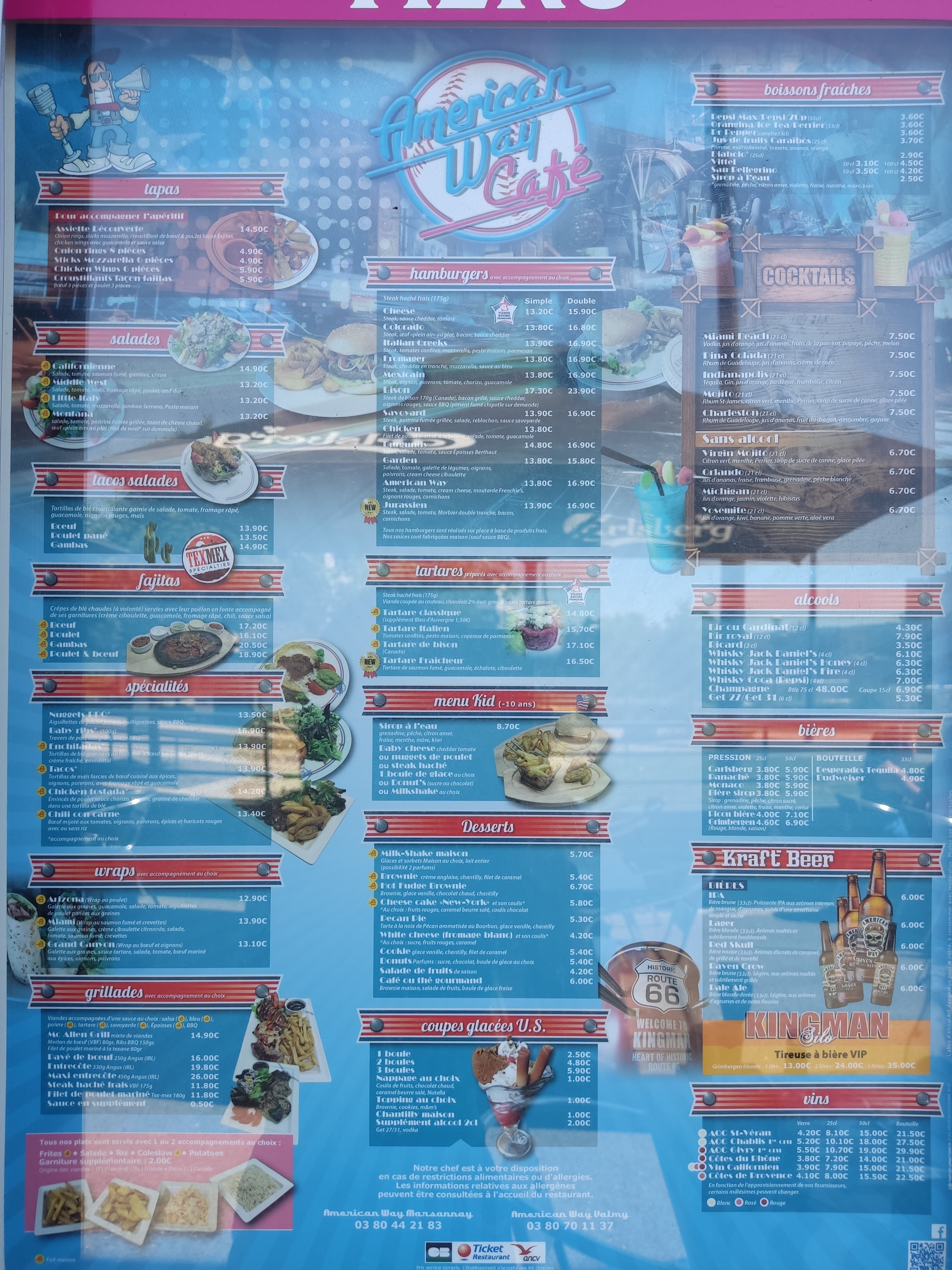 Bonjour, première fois chez American Way. Le personnel est très agréable, la déco met dans l'ambiance. En revanche, j'ai commandé un hamburger Colorado et je suis déçu ! C'était très sec. Le hamburger était composé d'un steak, de bacon et d un œuf. Pas la moindre trace de sauce sur chaque côté du pain et même pas une feuille. Absence de verdure également. Quand au dessert, un brownie très sec également. Dommage