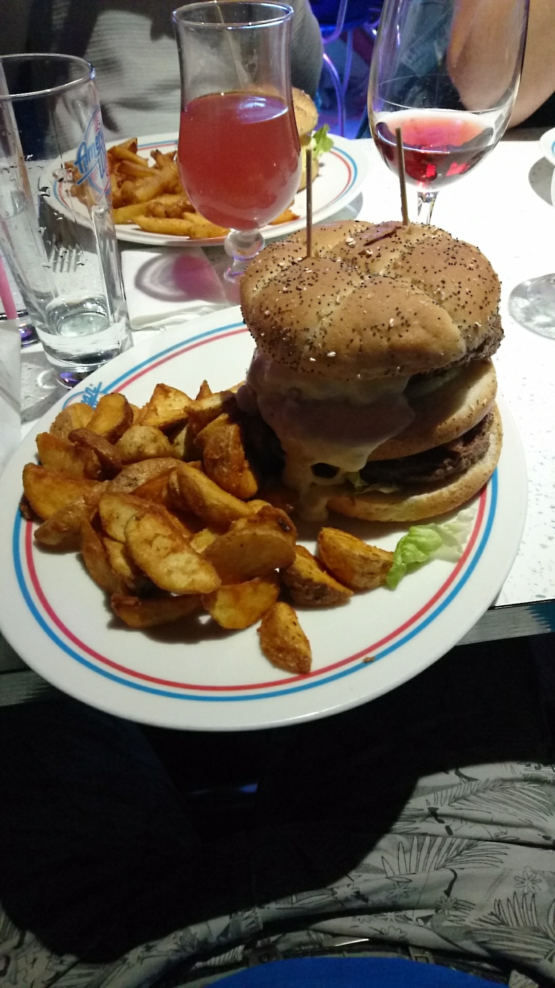 An American dinner, full of decoration representative of the cliche of the American way of life (big car, army,...). The double burger are massive, the meat is of good quality and the side well served. You should not be disappointed by the quantity regarding to the price and the general quality. Service is efficient. Un Dîner Américain avec tous ces clichés de décoration (grosse voiture, poster militaire,...). Le double Burger est énorme, la viande de bonne qualité et le accompagnement bien servi. Vous ne devriez pas être déçu par la quantité comparé au prix ou à la qualité général. Le service est rapide.