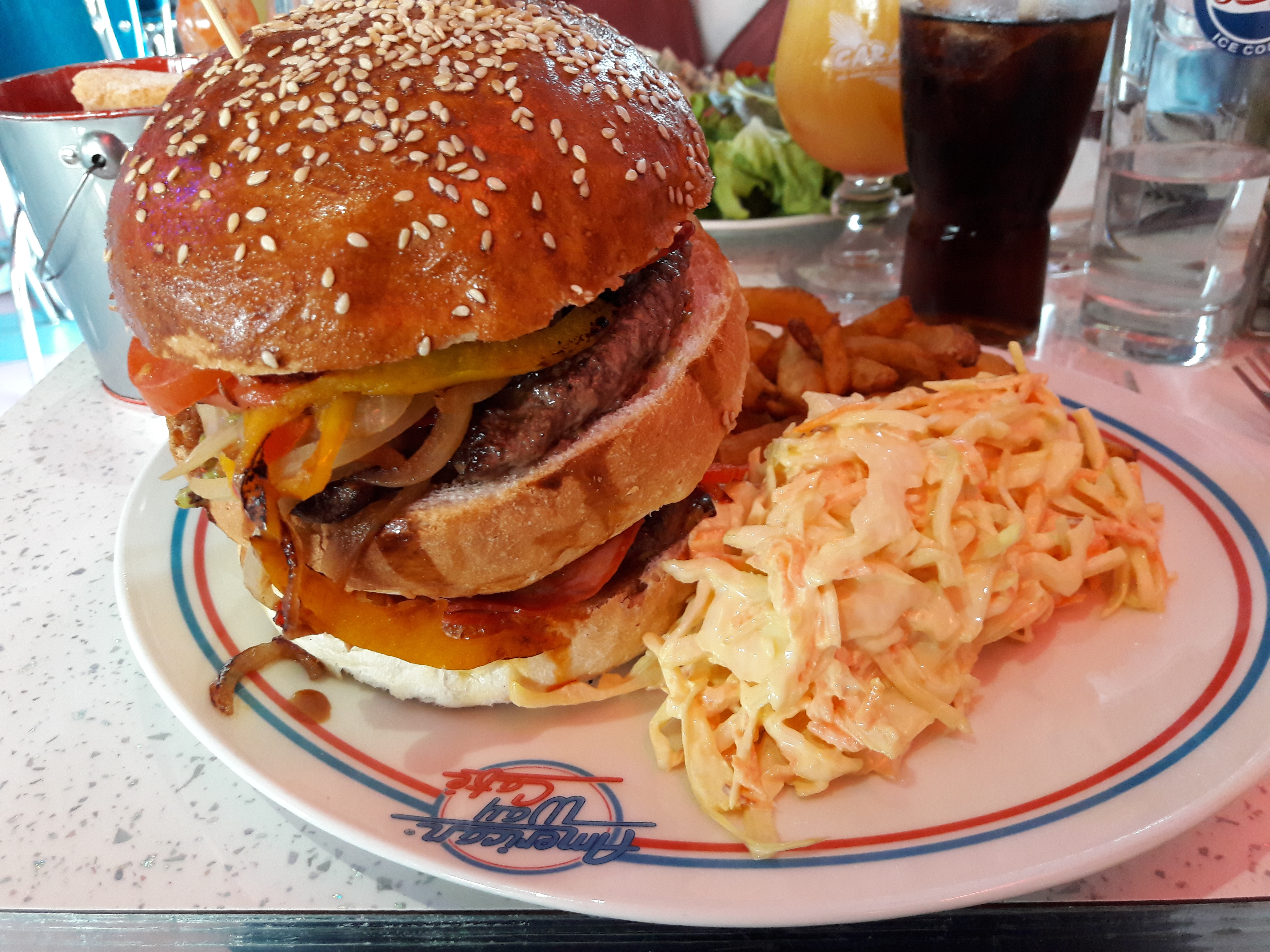 On y retrouve complètement l’ambiance des « diners » américains.. la décoration est bien réussie. Les burgers et en particuliers les doubles sont aussi à l’image de leurs cousins américains.. bon et surtout très copieux.. plats tex-mex pour ceux qui ne sont pas attirés par les burgers. Un peu d’attente mais soirée sympa..