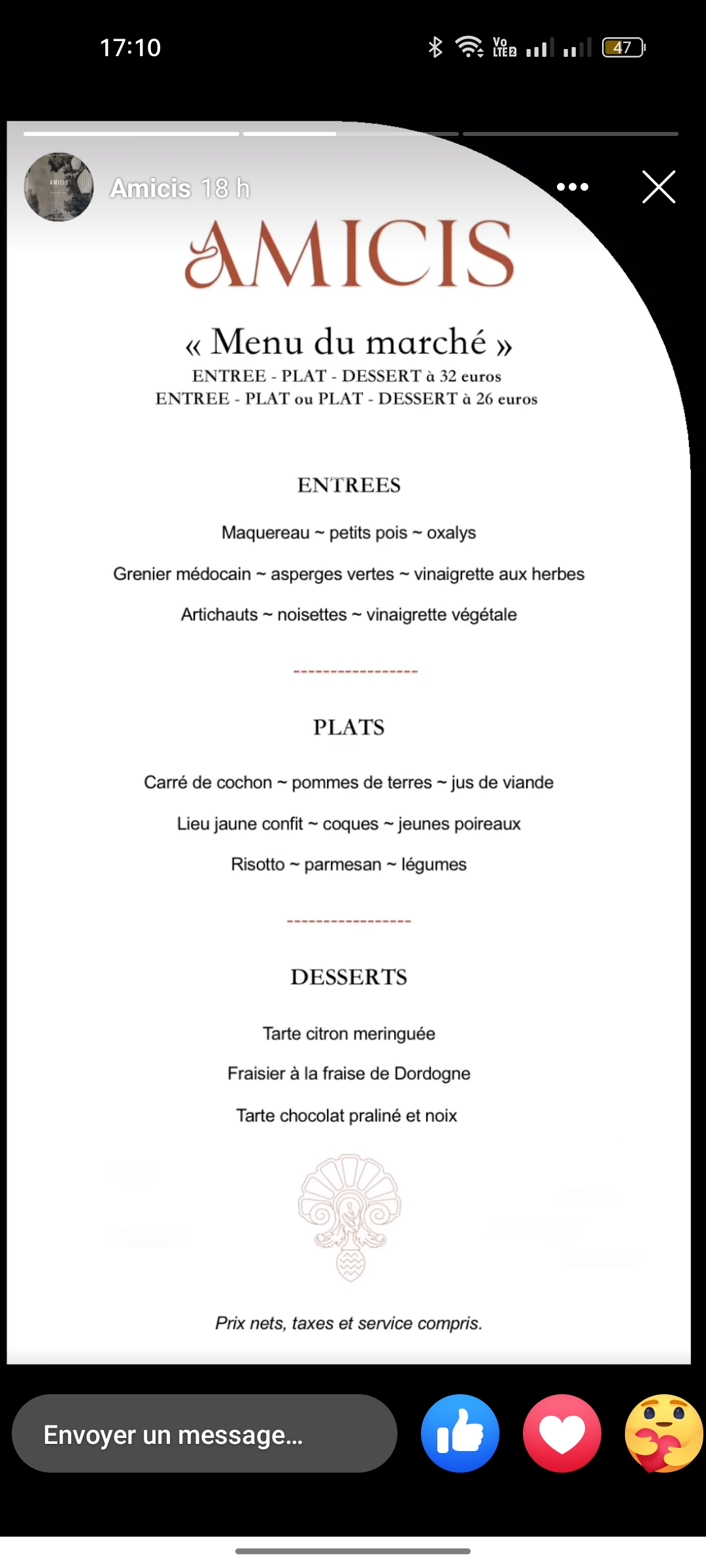 Menu du déjeuner... E/P/D 32€ 3 entrées / 3 plats / 3 desserts
