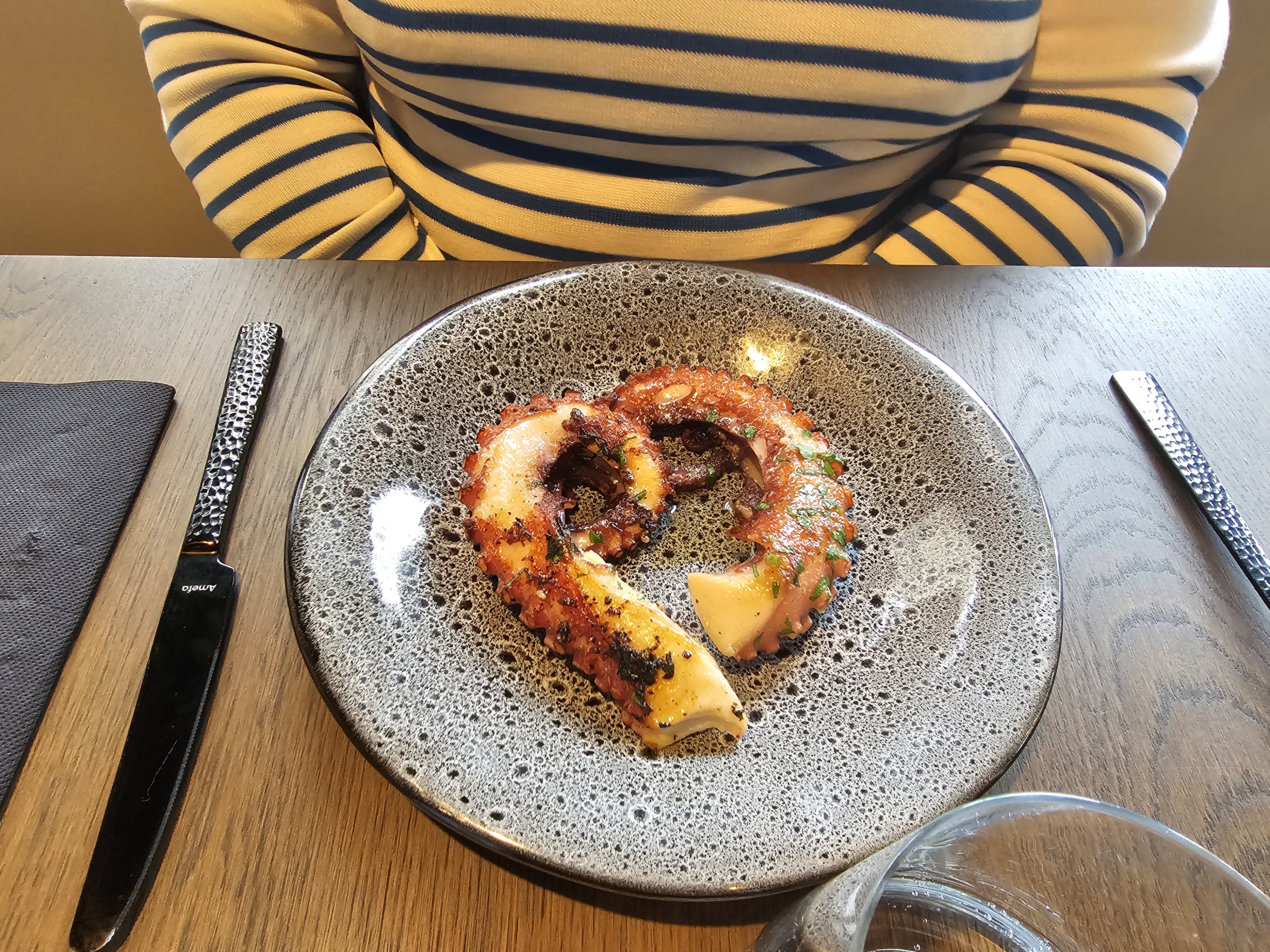 Le meilleur restaurant de ma vie ! Un dîner en amoureux incroyable ou nous avons étés reçu par un personnel extra souriant, bien habillé et poli ! Accompagné à notre grande table intimiste ou nous avons de la place pour manger sans être collé à d'autre personne à côté et installé sur des fauteuils très confortable. La cuisine est simple mais terriblement efficace. Pour MR Une belle tranche de foie gras maison accompagné d'une corbeille de divers pain afin de régaler les papilles suivi d'un beau morceau de pavé de bœuf ou la cuisson sera réalisé parfaitement par le cuisinier accompagné par d'excellente frites maison. Pour MME, 2 belles tentacules de poulpe grille ou la saveur sera au rendez vous suivi d'un merlu tout aussi parfait en terme de cuisson que d'osmose avec l'accompagnement. Un petit plateau de fromage accompagnera tout cela ou un peu plus de quantité serait le bienvenu mais le choix des produits est excellent. Terminé par un exquis dessert de MR Rouget qui terminera ce repas gourmand par une note sucrée . La décoration est magnifique, la soirée continuera avec un DJ qui met la musique à un niveau vous permettant de discuter sans problème. On paye le prix de la qualité, mais c'est avec plaisir que nous le faisons. Merci à toute l'équipe, vous êtes top !