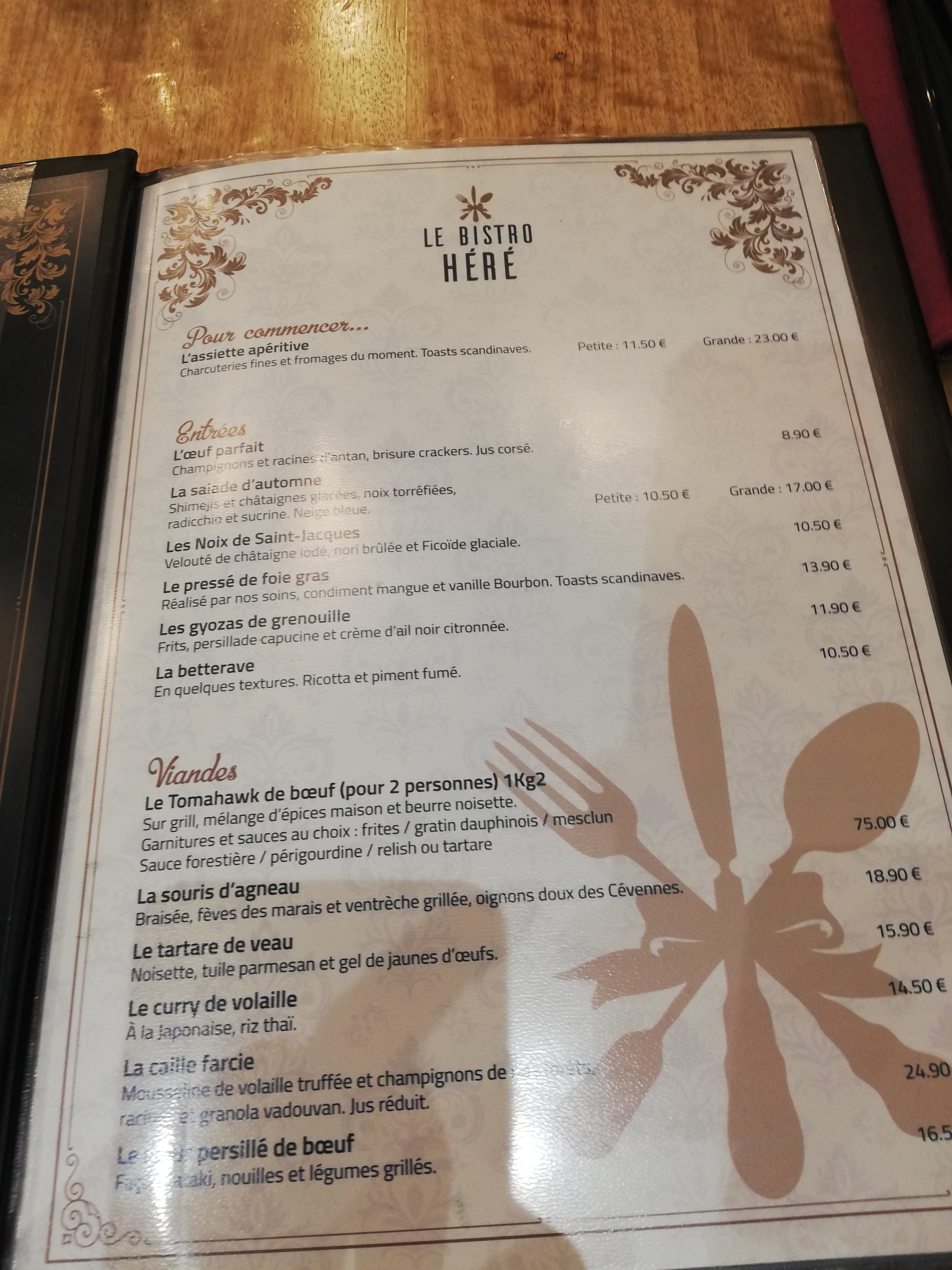 Très déçu de ma dernière visite après plusieurs repas au bistro Héré. Entrée facturée 16 euro pour une papillote version semelles de chaussures Puis un plat sur deux étaient froid , et obligé d'attendre 15 minutes pour manger ensemble. Nos remarques n'ont pas interpellées le responsable des lieux.... Dommage ! Plus jamais je retourne à cette adresse