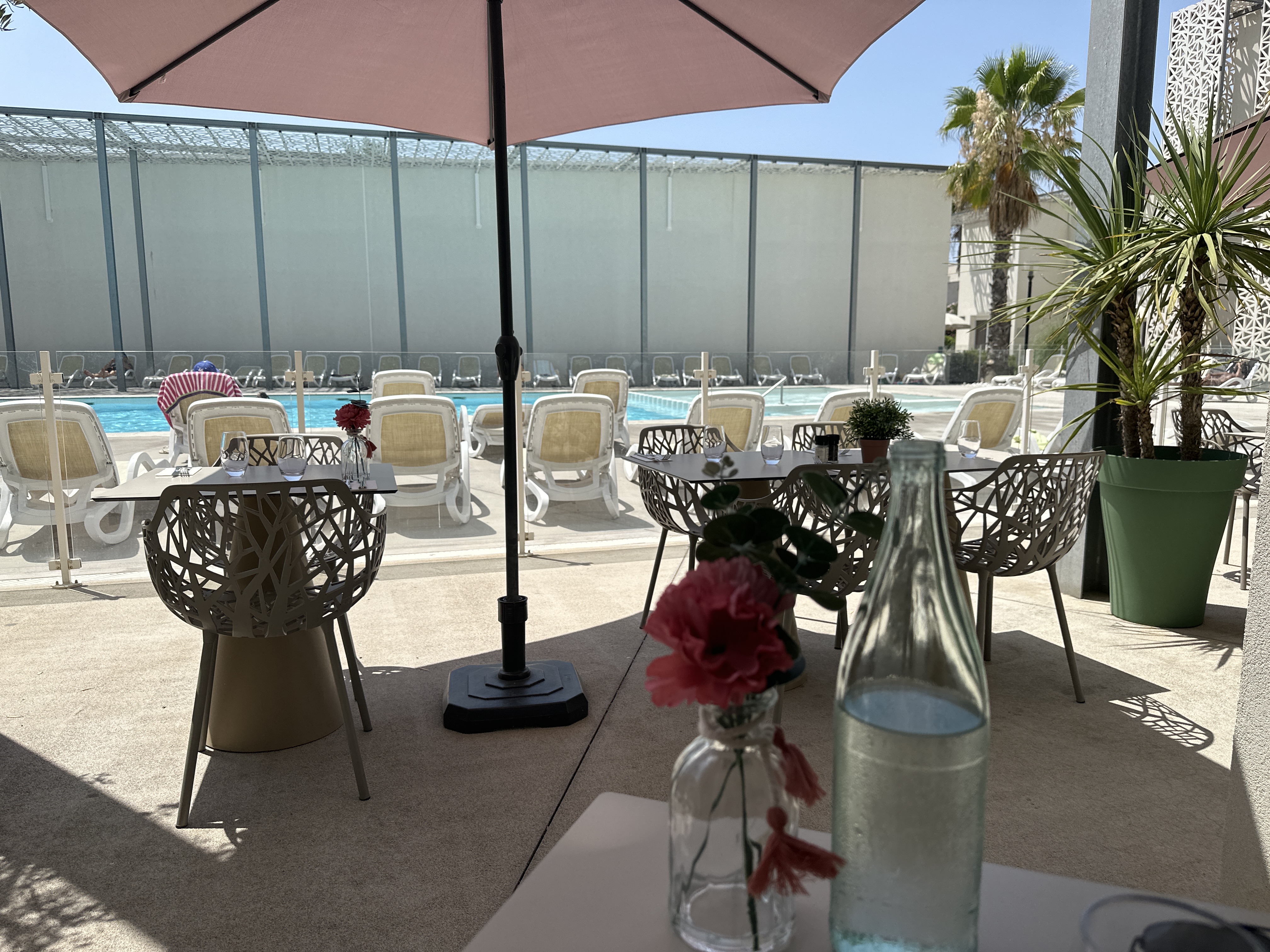 Bel environnement sur terrasse-piscine, espace calme et sécurisé. Déco simple et reposante. Propreté au top. Accueil et service excellents pros et cordiaux. Carte un peu limitée mais plats excellents et bien cuisinés. Prix in peu au-dessus de la moyenne mais cela vaut vraiment le détour. Surprenant pour un restaurant indépendant au sein de l'hôtel. A essayer absolument...