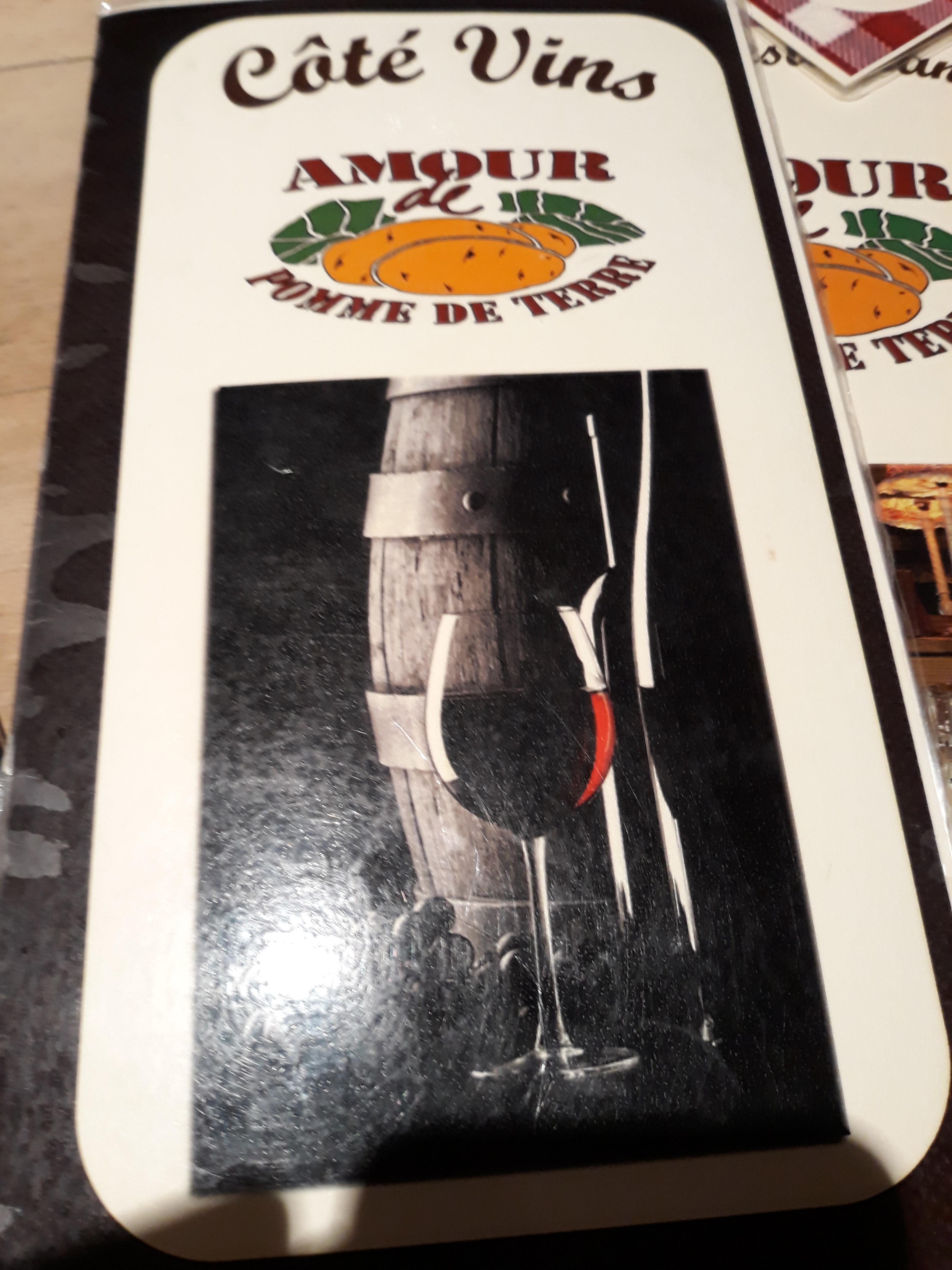Un restaurant dans lequel j'ai réservé une table et j'ai mangé des patates. Au moins, je ne me suis pas fait avoir comme la dernière fois au restaurant Amour de haricots verts à Aubusson où je me suis retrouvé à manger des carottes. Et bien merci, mais pas deux fois. Ici au moins tout est dans le nom du restaurant. De bien bonnes pommes de terre, bien belles, que j'enfourne dans ma bouche comme un coquin que je suis.