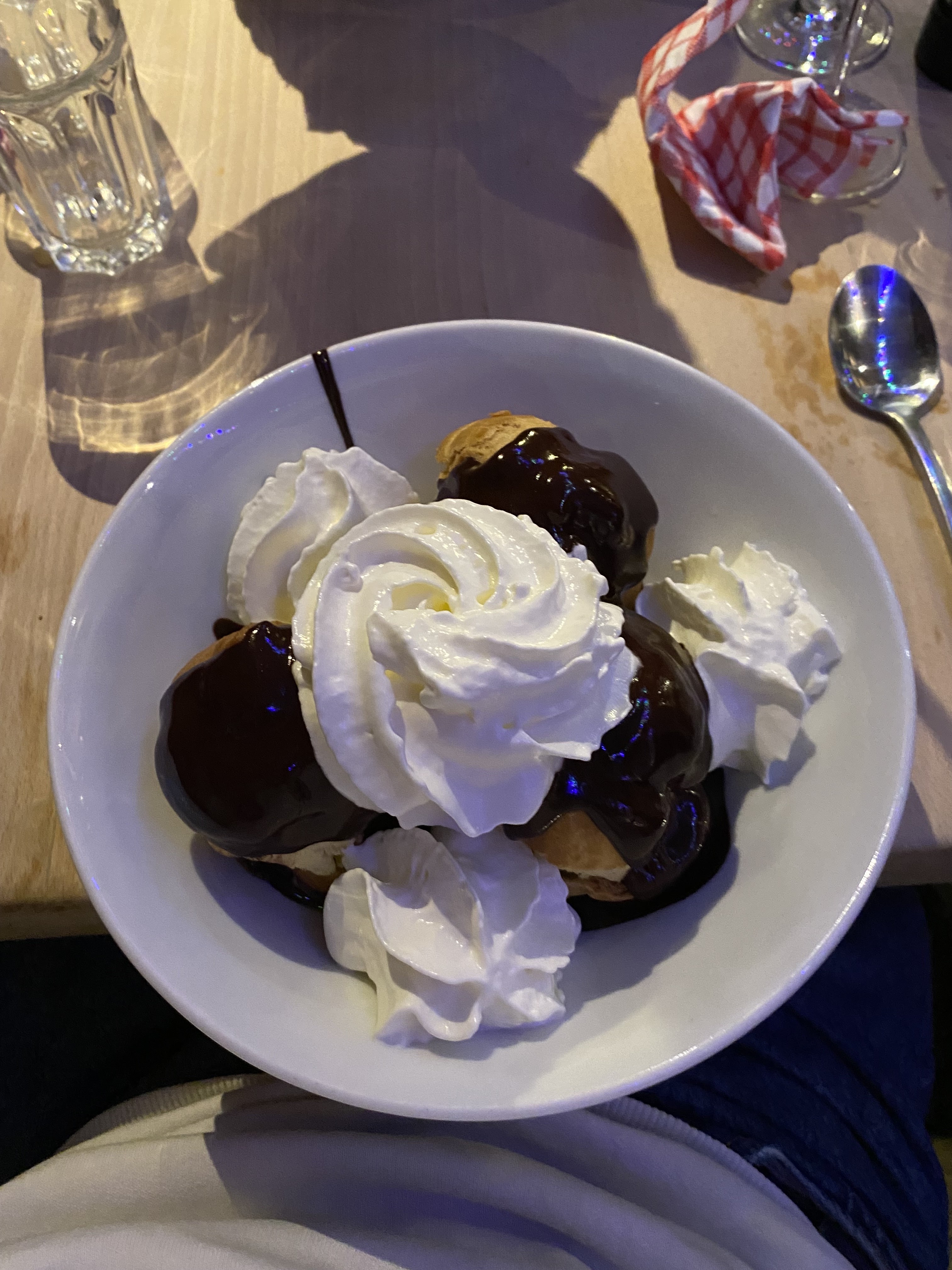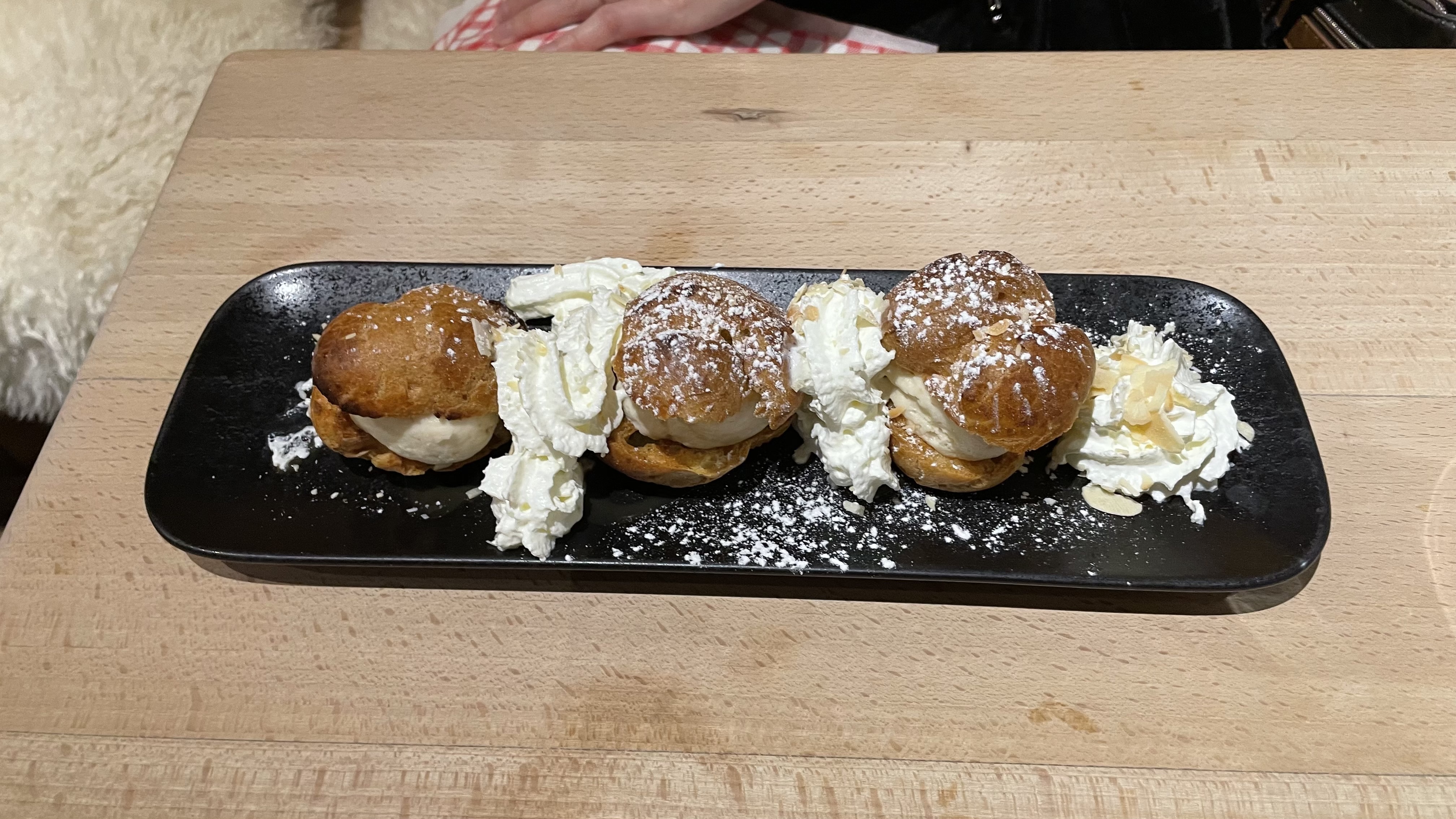 Tout est bon dans la pomme de terre ! Accueil et service chaleureux dans ce chalet alpin. Parmentier de canard + profiteroles = top