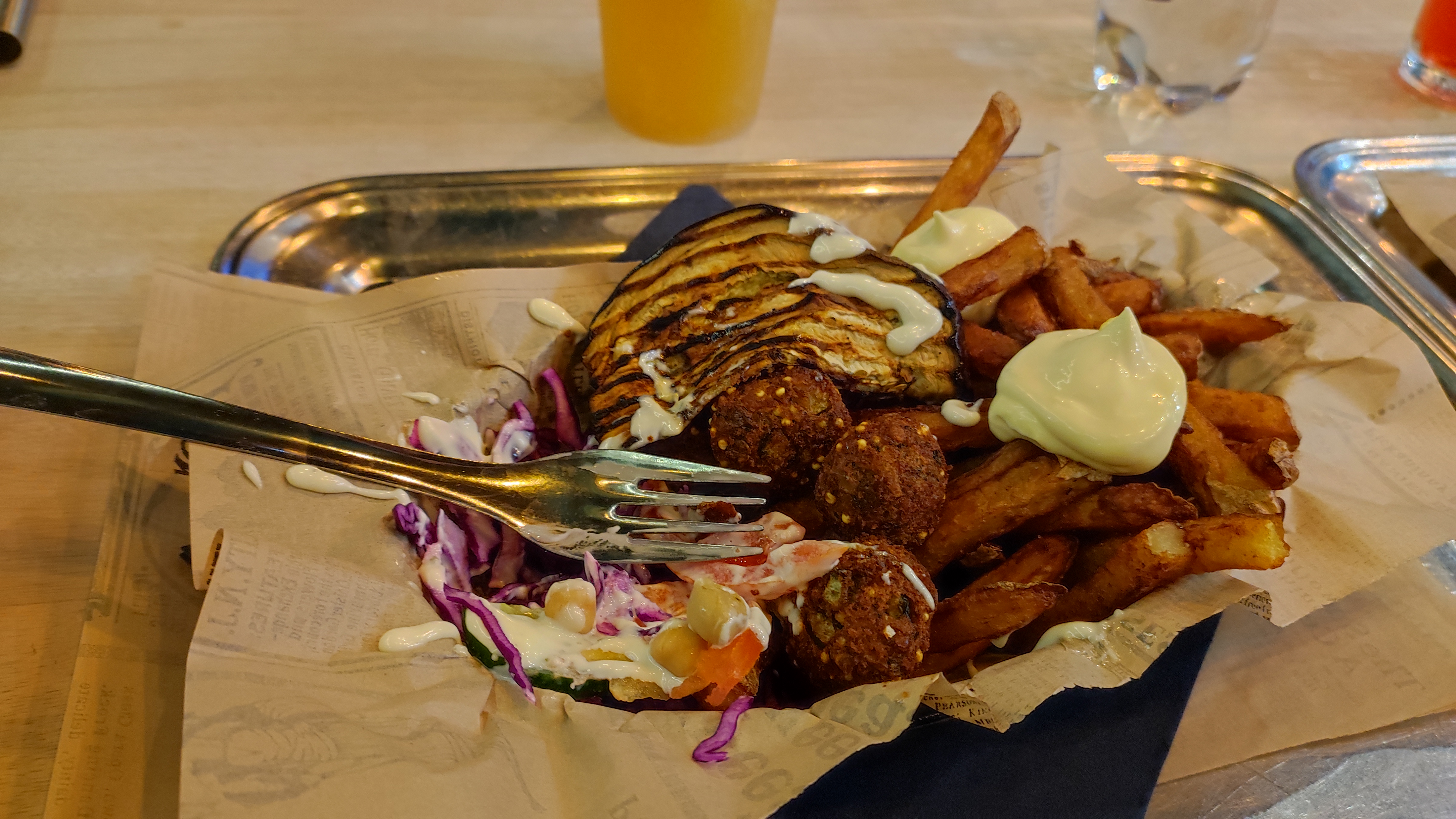 Superbe expérience ! Excellent sandwich Berlin avec sauce blanche, petits légumes (aubergine, poivrons, courgettes, concombre, oignon, salade), fêta et grenade, frites maison fondantes. Super accueil avec personnel souriant, ce qui est très agréable ! Nous reviendrons avec grand plaisir.