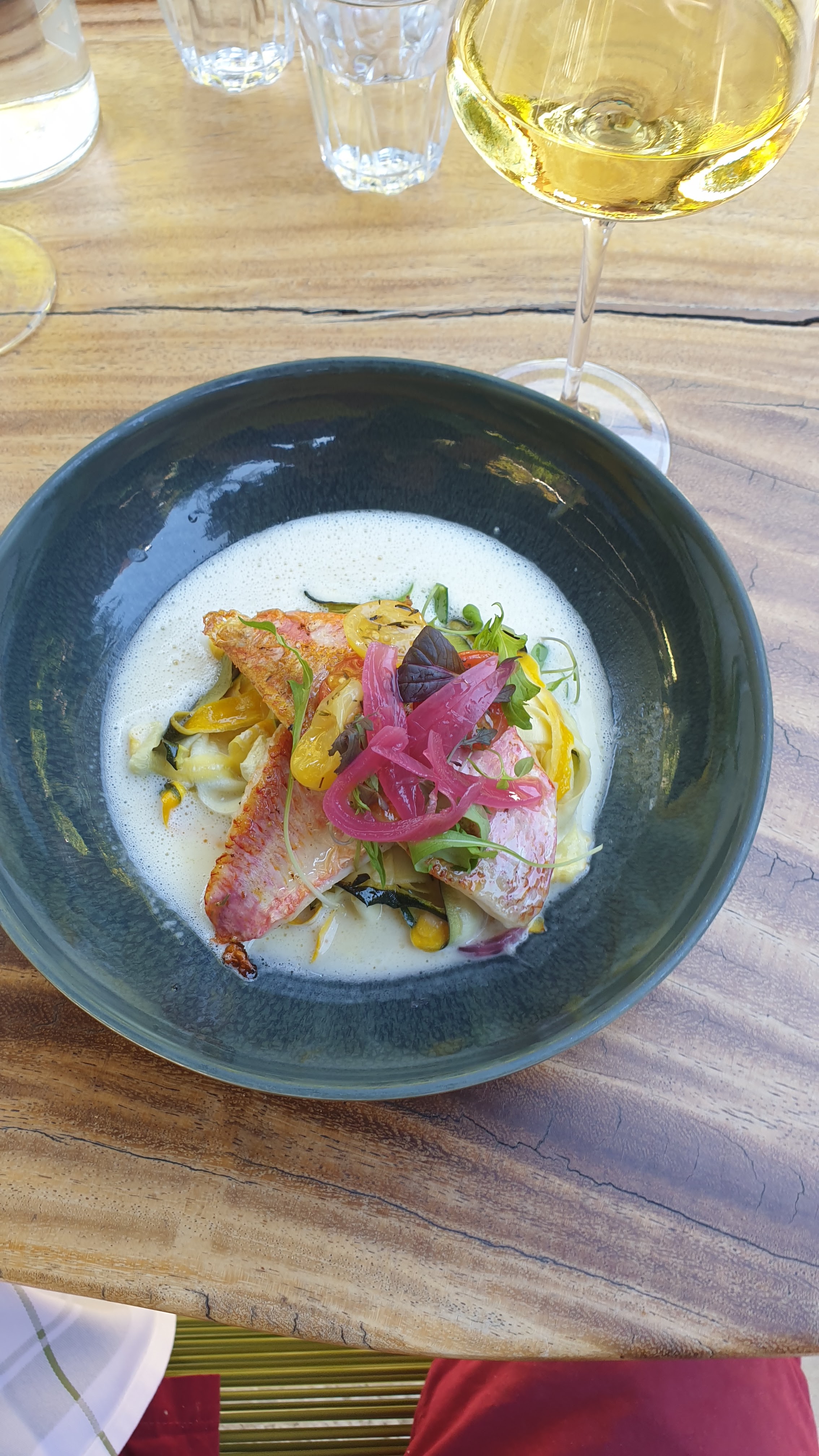 Quelle déception !! Un gaspacho trop salé ou un mince filet de maquereau fade en entrée suivis d’un lieu jaune ou une viande quelconques… Aucune saveur particulière ni originalité, difficilement acceptable à ce niveau. Le conseil d’un sommelier se limitant à « fruité ou non »! Tout cela sous un ardent soleil par manque de parasols… Au moment de régler l’addition , notre interlocutrice nous avoue avoir de très nombreux retours négatifs sur la nouvelle carte, créée la veille semble-t-il. A souligner la gentillesse du personnel