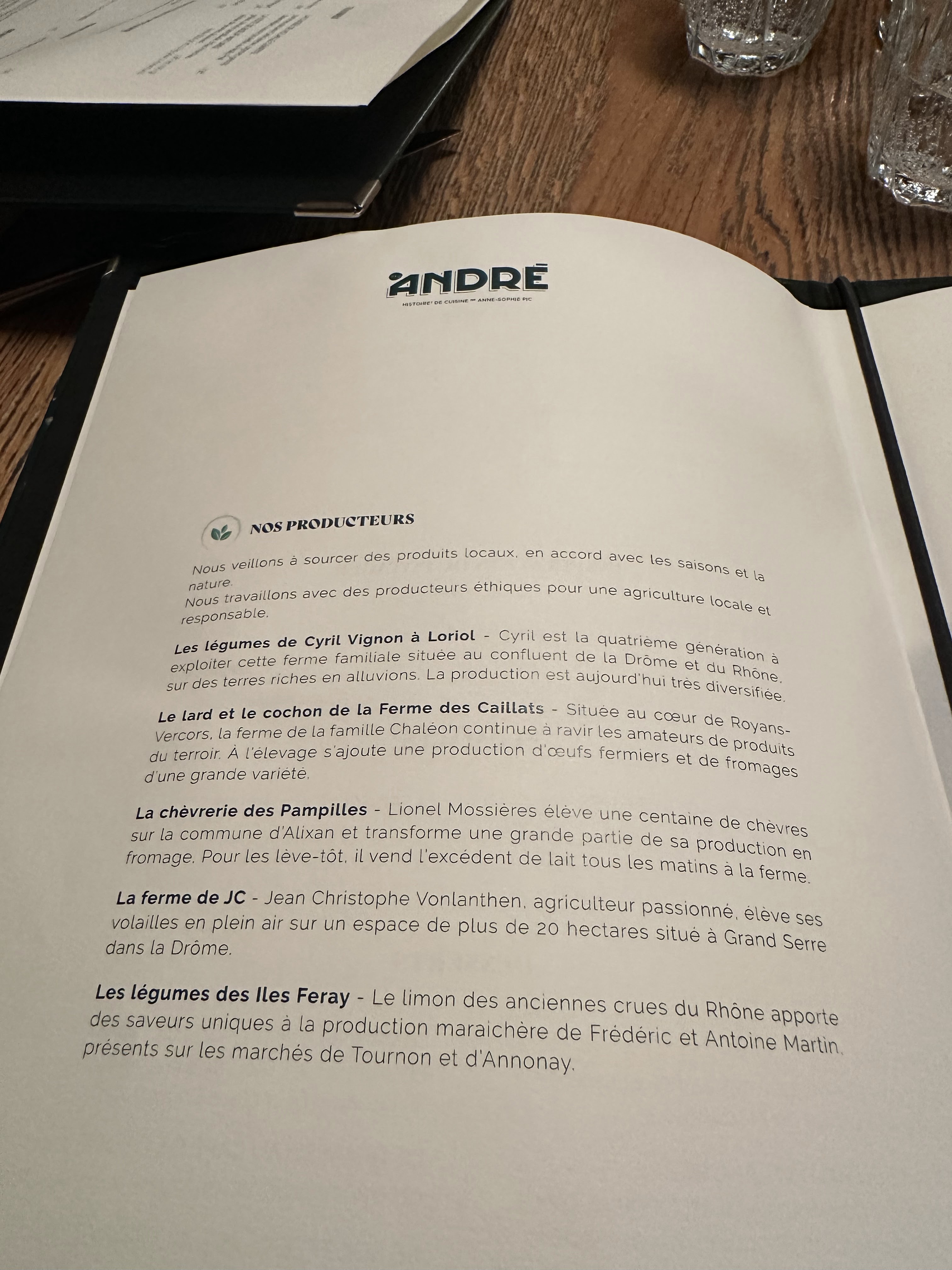 On ne présente plus la Maison Pic, mais si on ne veut pas casser son livret A pour aller au restau, il reste... chez André !!! Un magnifique aperçu de tout le savoir-faire de la famille Pic ! Un menu très abordable ou une carte alléchante ! Forcément on a craqué pour la carte, des mets raffinés, originaux et succulents ! Des vins d'exception ! Le cadre est à la fois cosy, moderne, chic, tout en gardant l'esprit Nationale 7. Le personnel jeune et dynamique, sans oublié d'être sympathique est aux petits soins pour nous. Vraiment une belle adresse que je recommande. Le petit plus qu'on apprécie, la vue sur les cuisines !